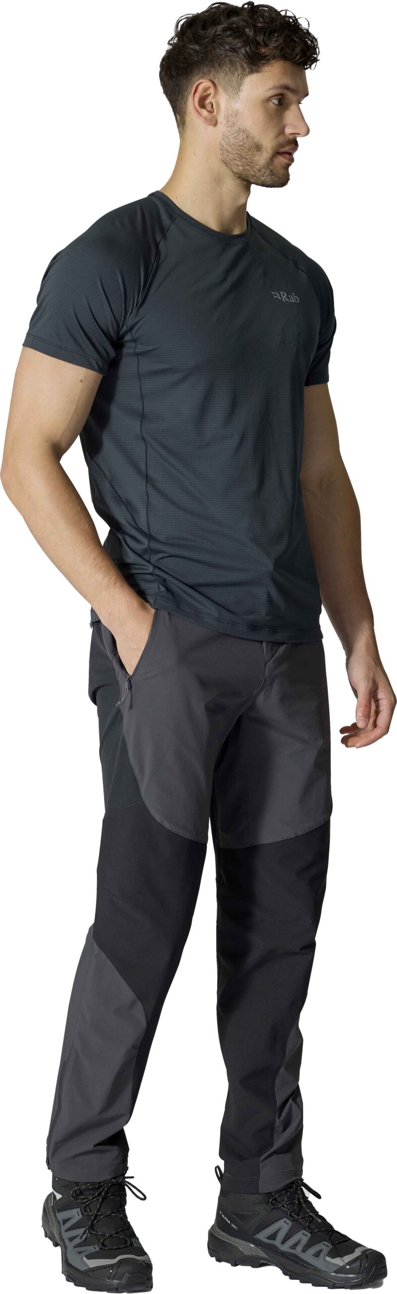 Pantalon Rab Torque Anthracite homme, softshell Matrix™ 2 couches déperlant, coupe-vent et respirant pour randonnées estivales. Léger, protection intempéries légères, genoux articulés, taille réglable et zips chevilles.