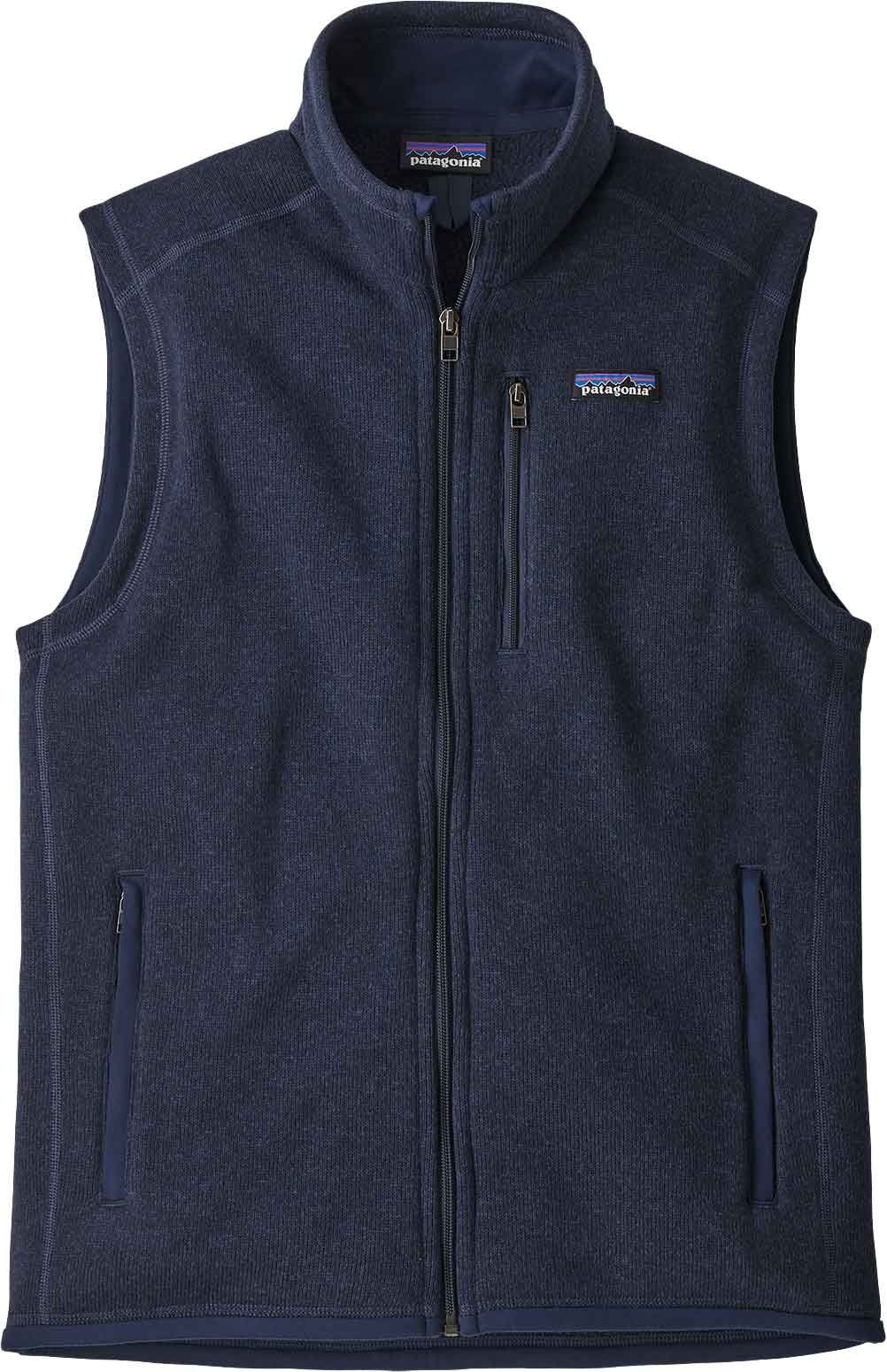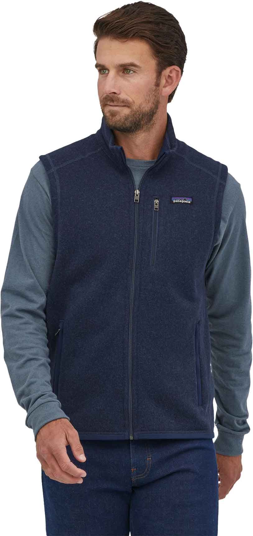 Patagonia Better Sweater Vest New Navy, gilet polaire sans manches homme en polyester recyclé aspect tricot, offre chaleur, coutures plates, poches zippées et liserés résistants, teinture éco-responsable.