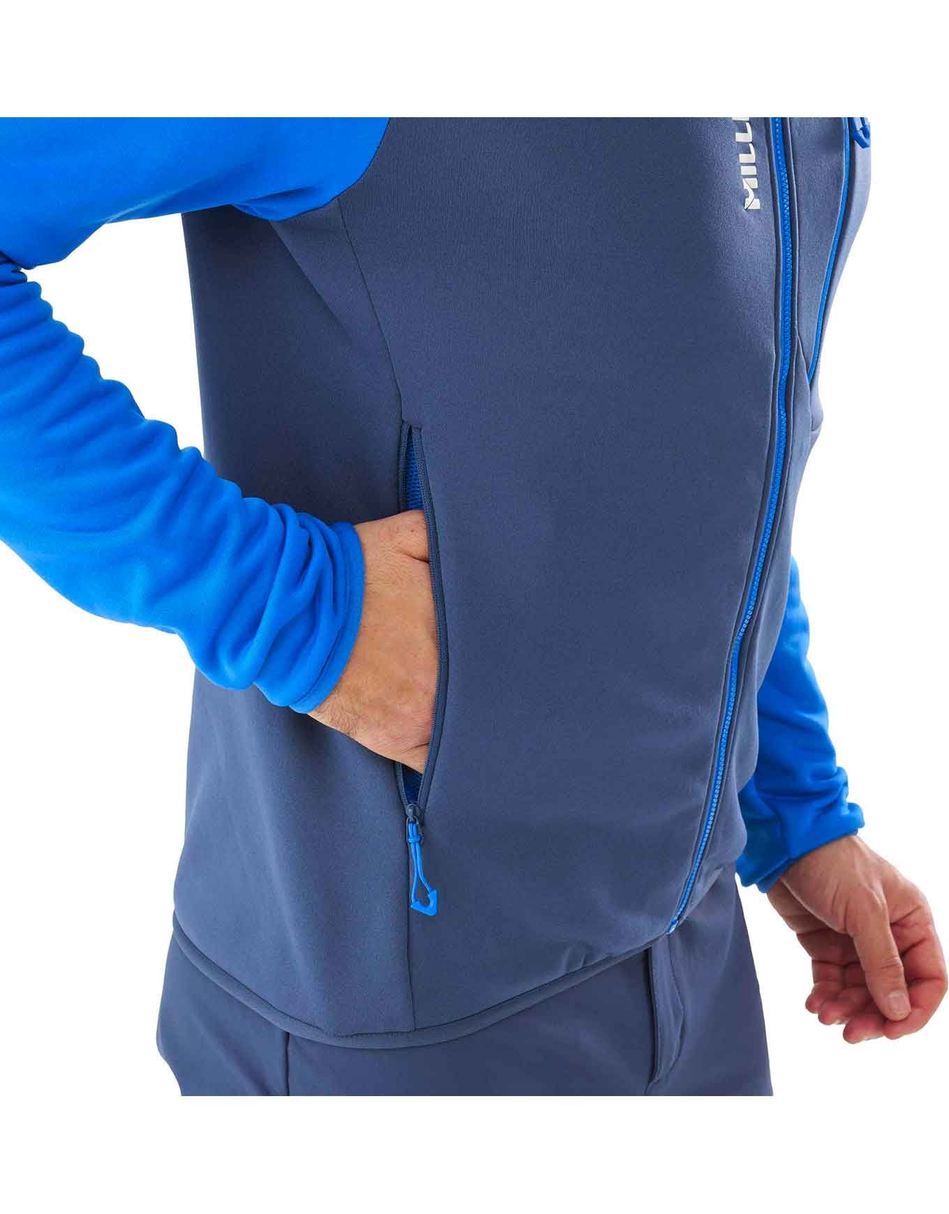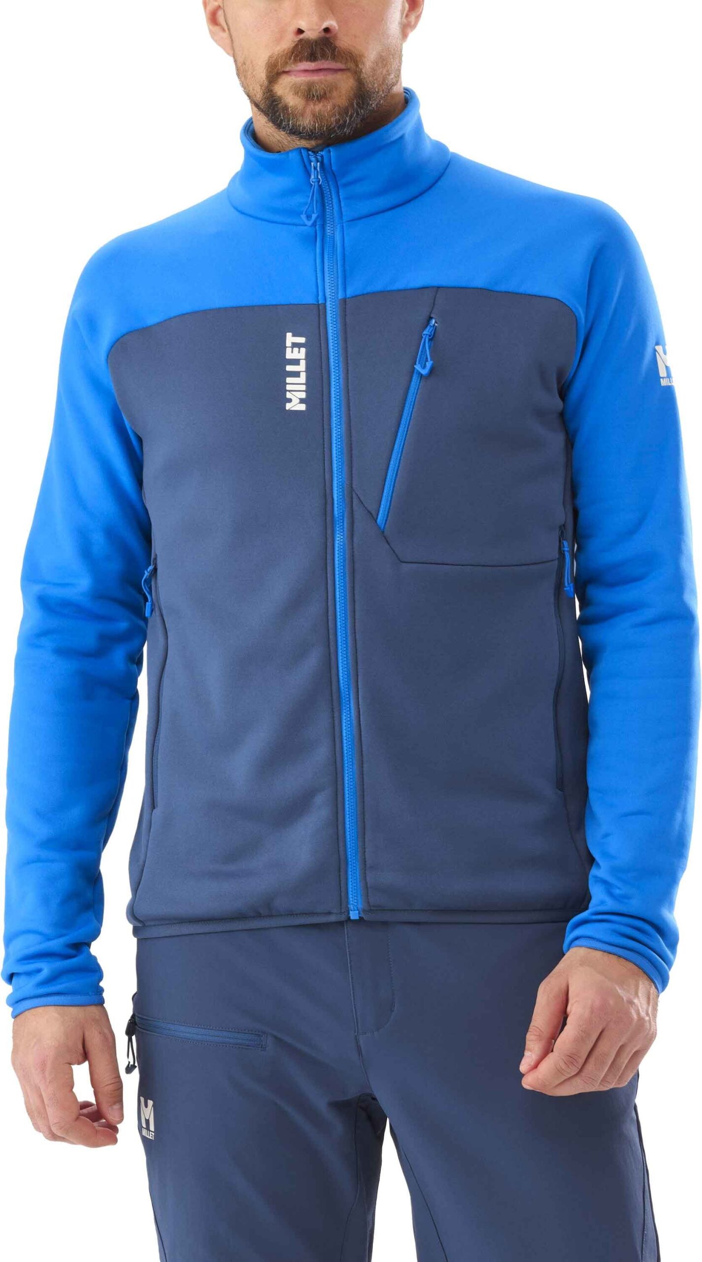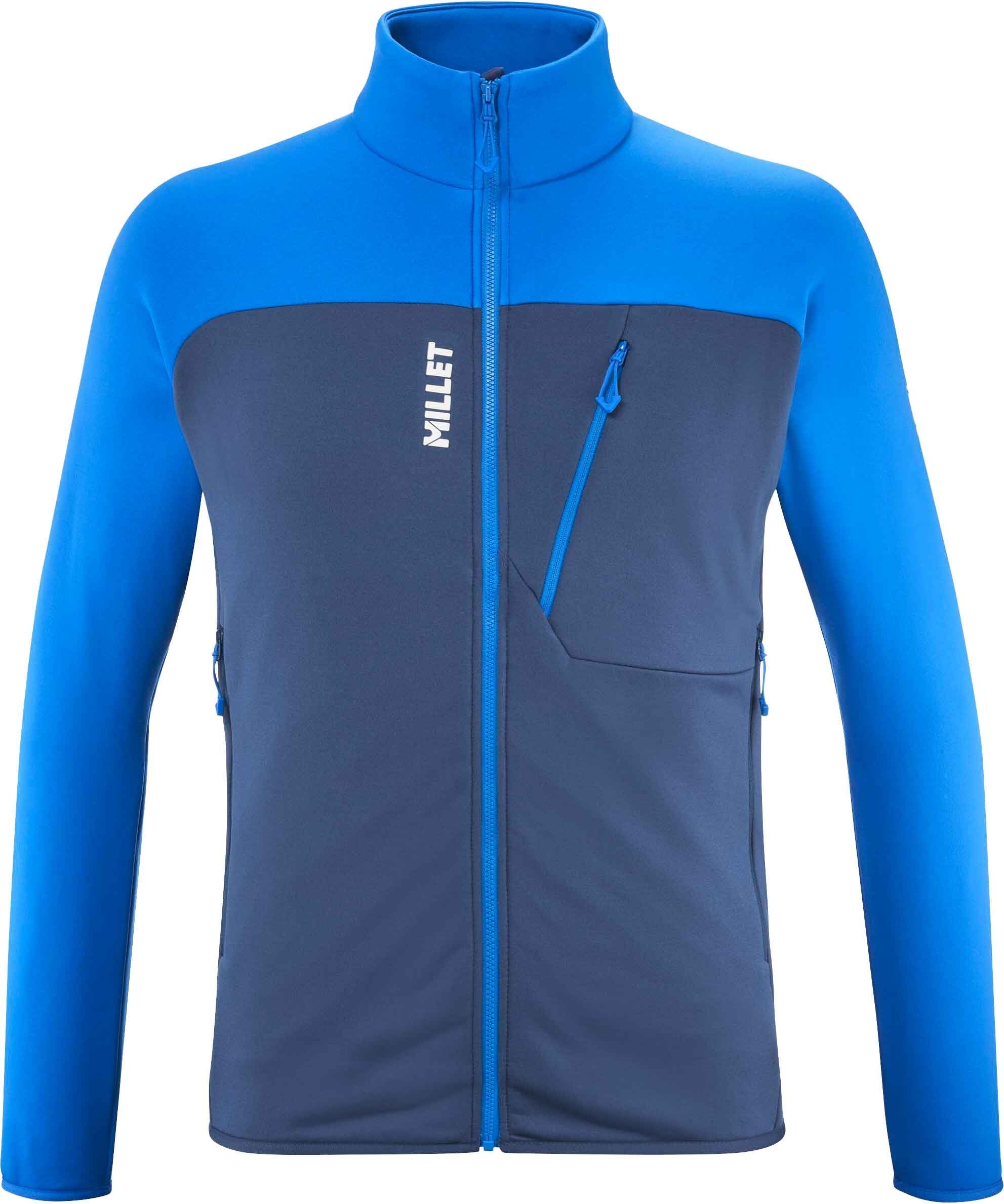Millet Seneca Fleece Jkt Dark Denim Icon Blue, polaire homme en polyester Tecnostretch™ gratté pour la randonnée alpine, offre chaleur respirante, col montant zip intégral, 3 poches zippées, matière 88 % recyclée.