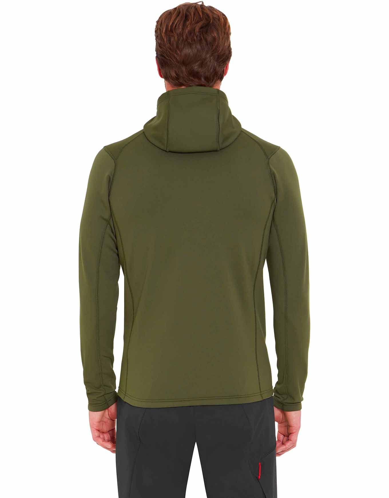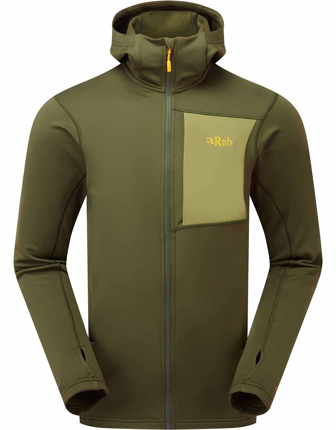 La polaire Rab Superflux Hoody Army pour homme conjugue tissu Thermic™ chaud et respirant, capuche, poches sécurisées et passants pouce pour un confort optimal en montagne par temps froid.