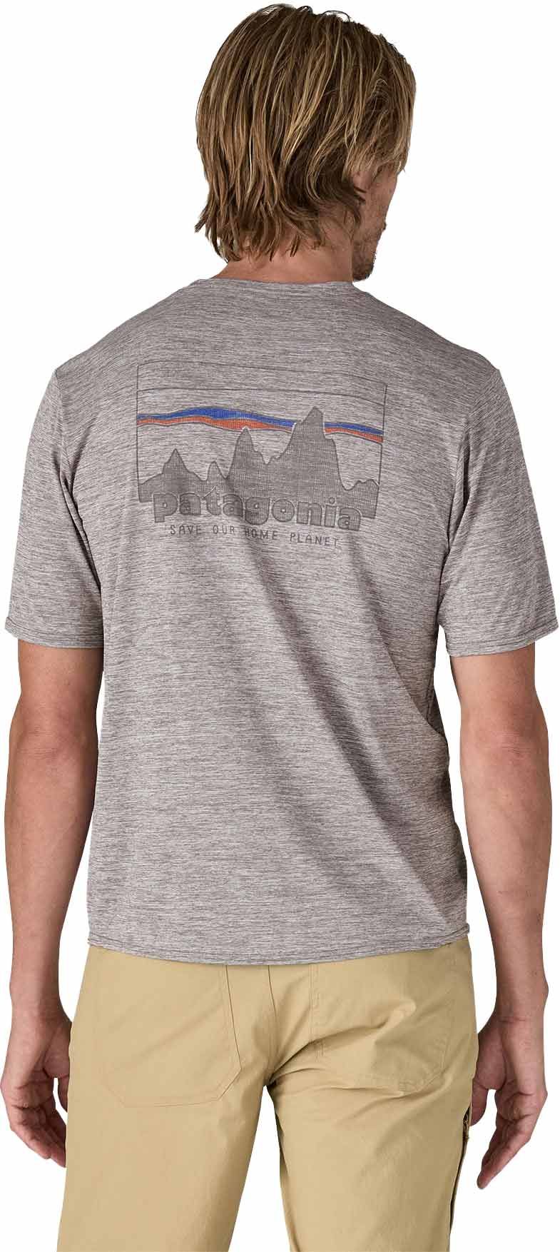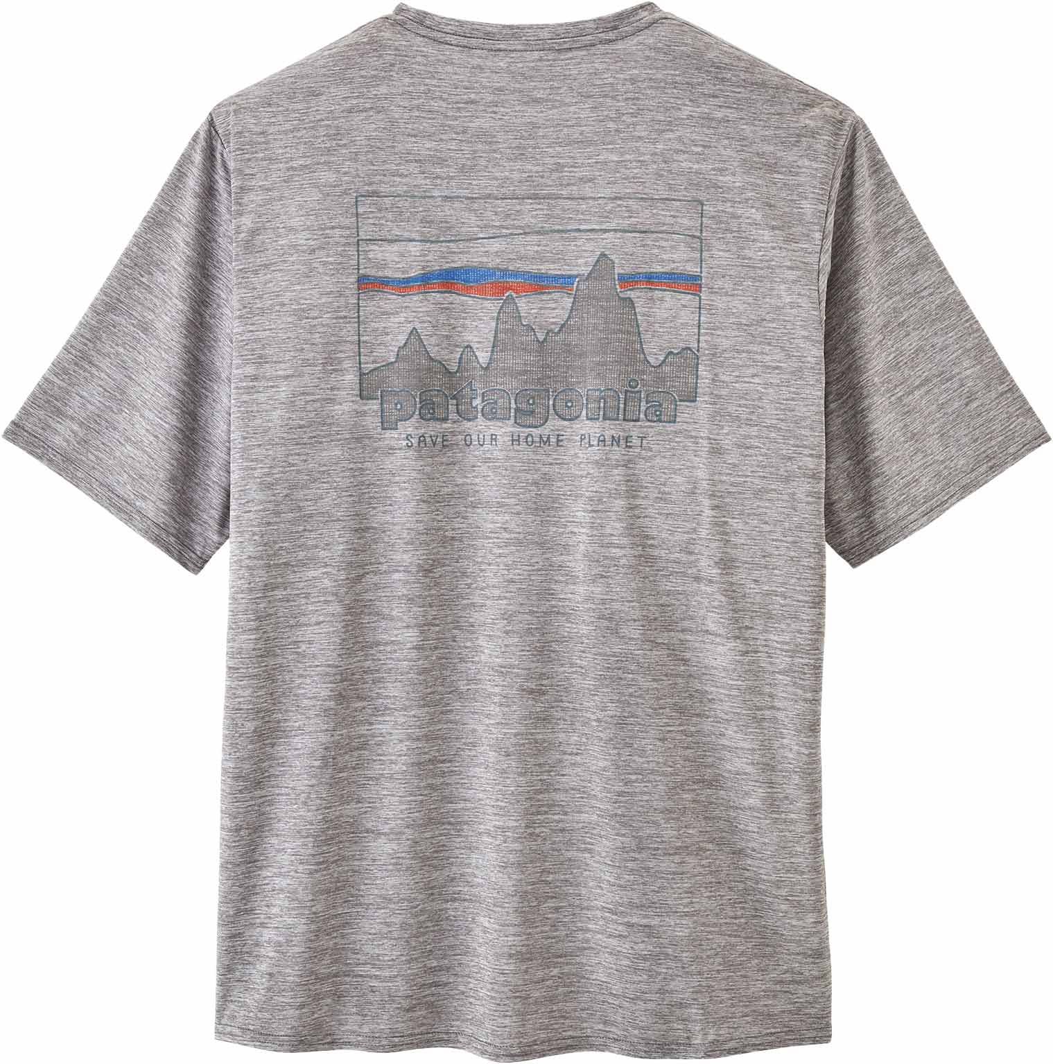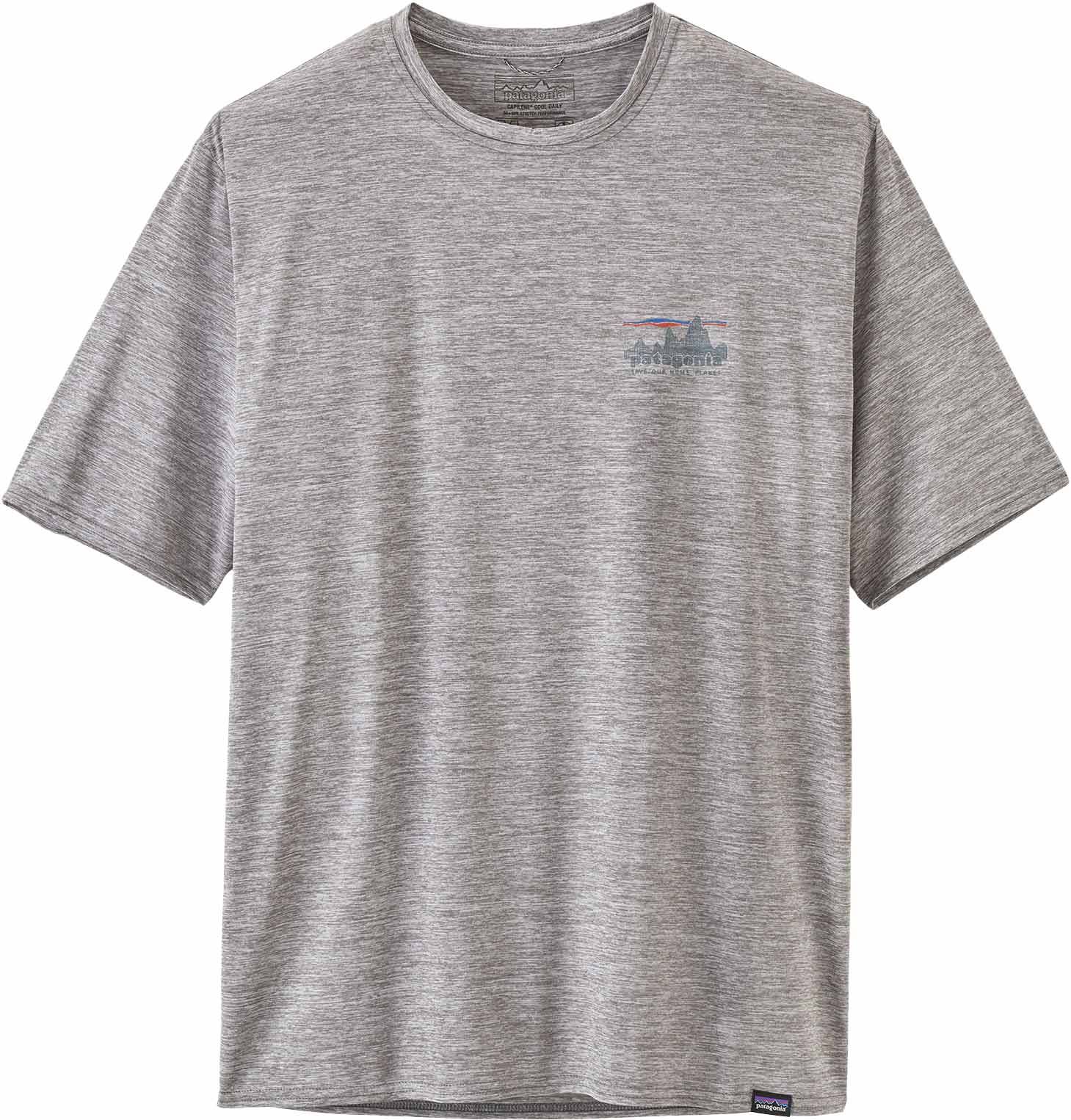 Patagonia Cap Cool Daily Graphic Shirt 73 Skyline Feather Grey, t-shirt homme ultra-respirant avec technologie Capilene® Cool pour une évacuation rapide de la transpiration et traitement HeiQ® Pure limitant les odeurs.