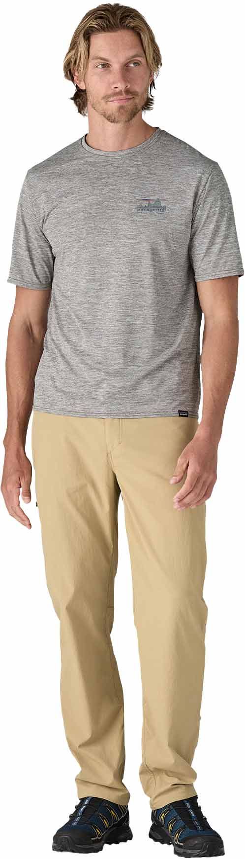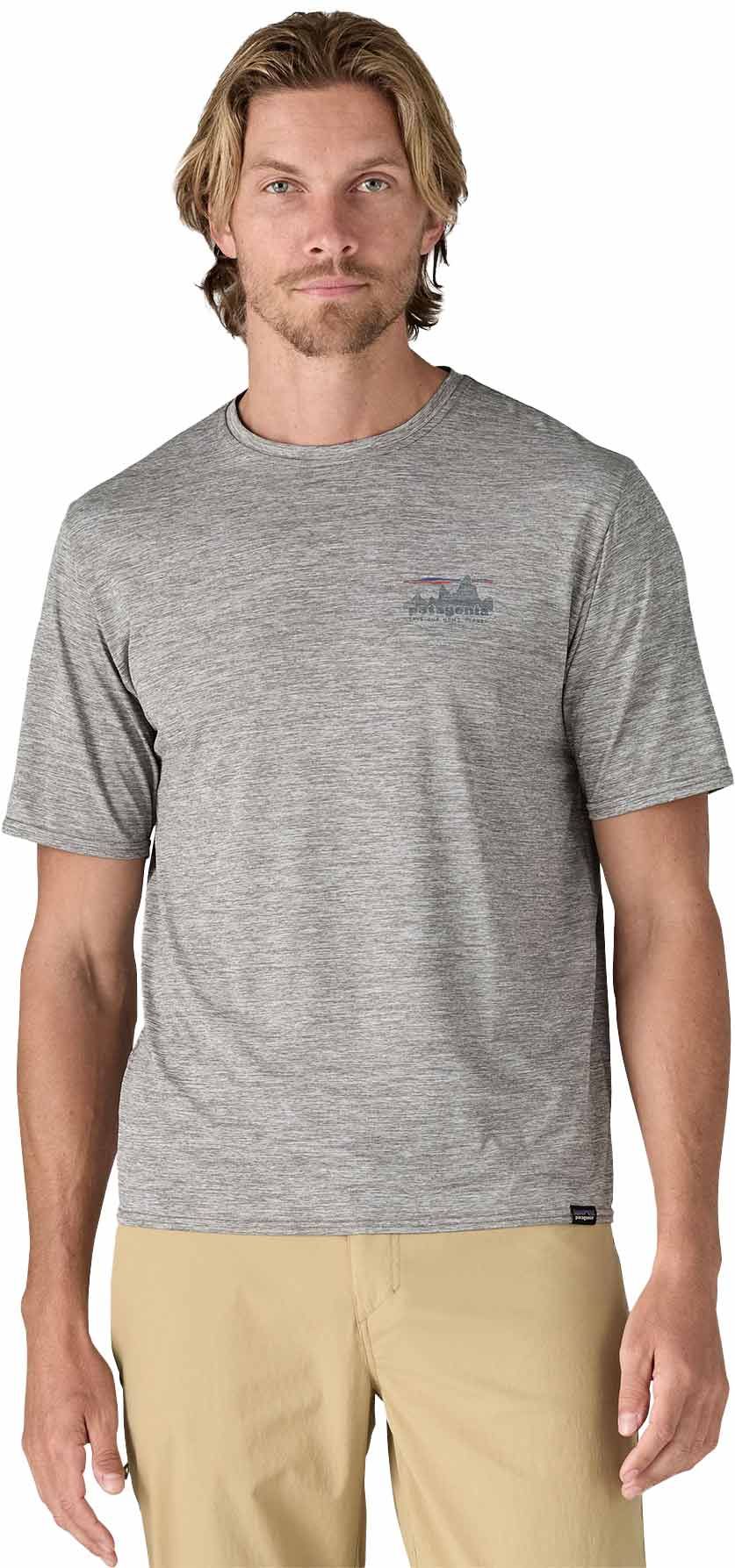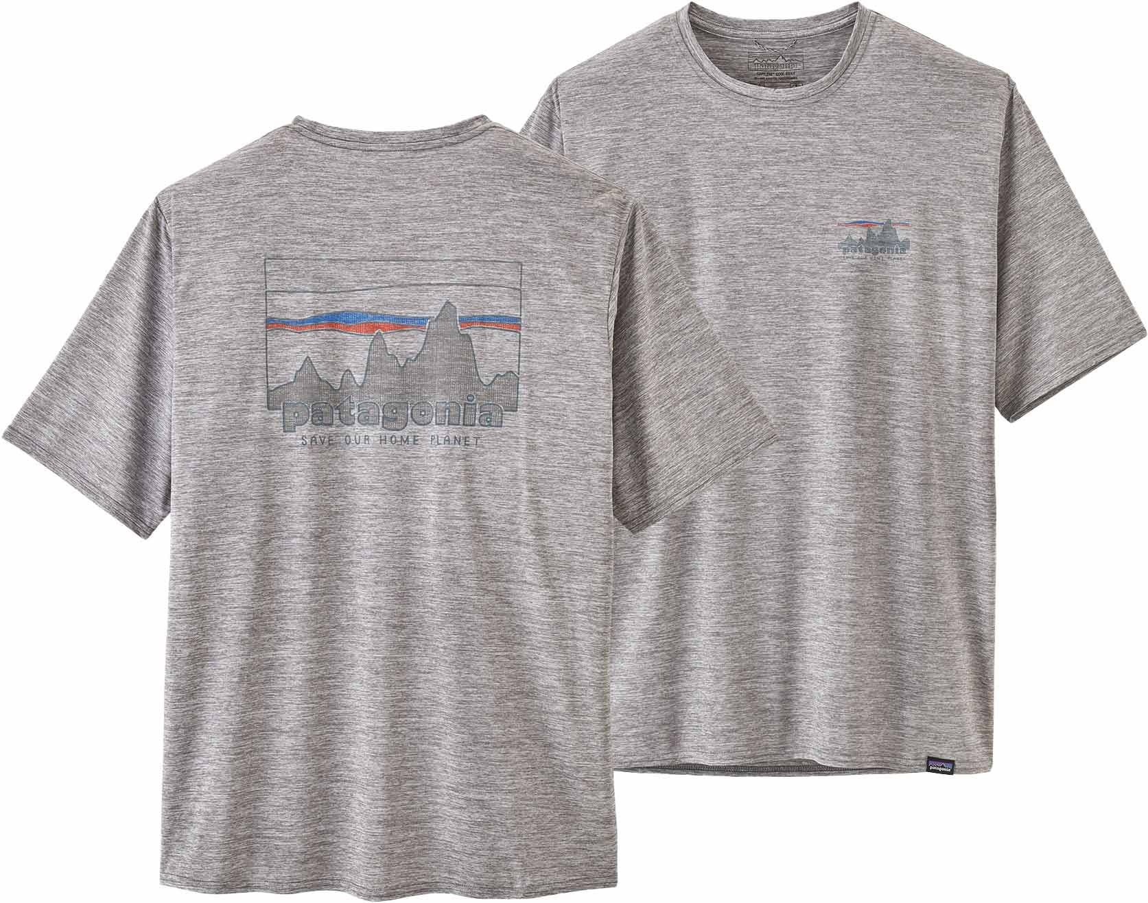 Patagonia Cap Cool Daily Graphic Shirt 73 Skyline Feather Grey, t-shirt homme ultra-respirant avec technologie Capilene® Cool pour une évacuation rapide de la transpiration et traitement HeiQ® Pure limitant les odeurs.