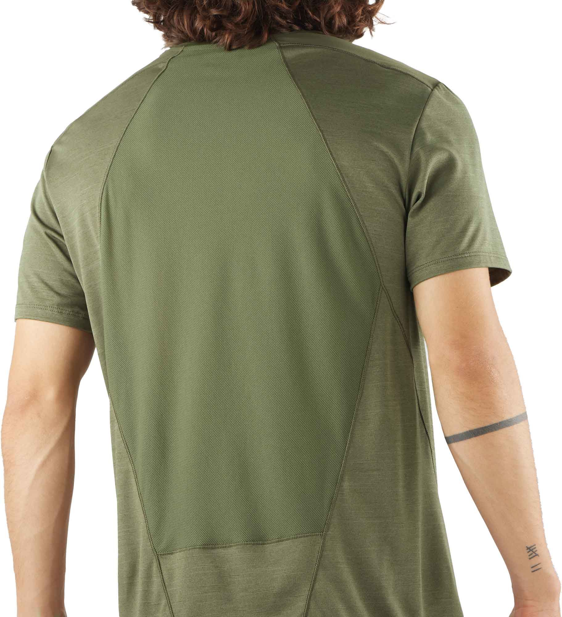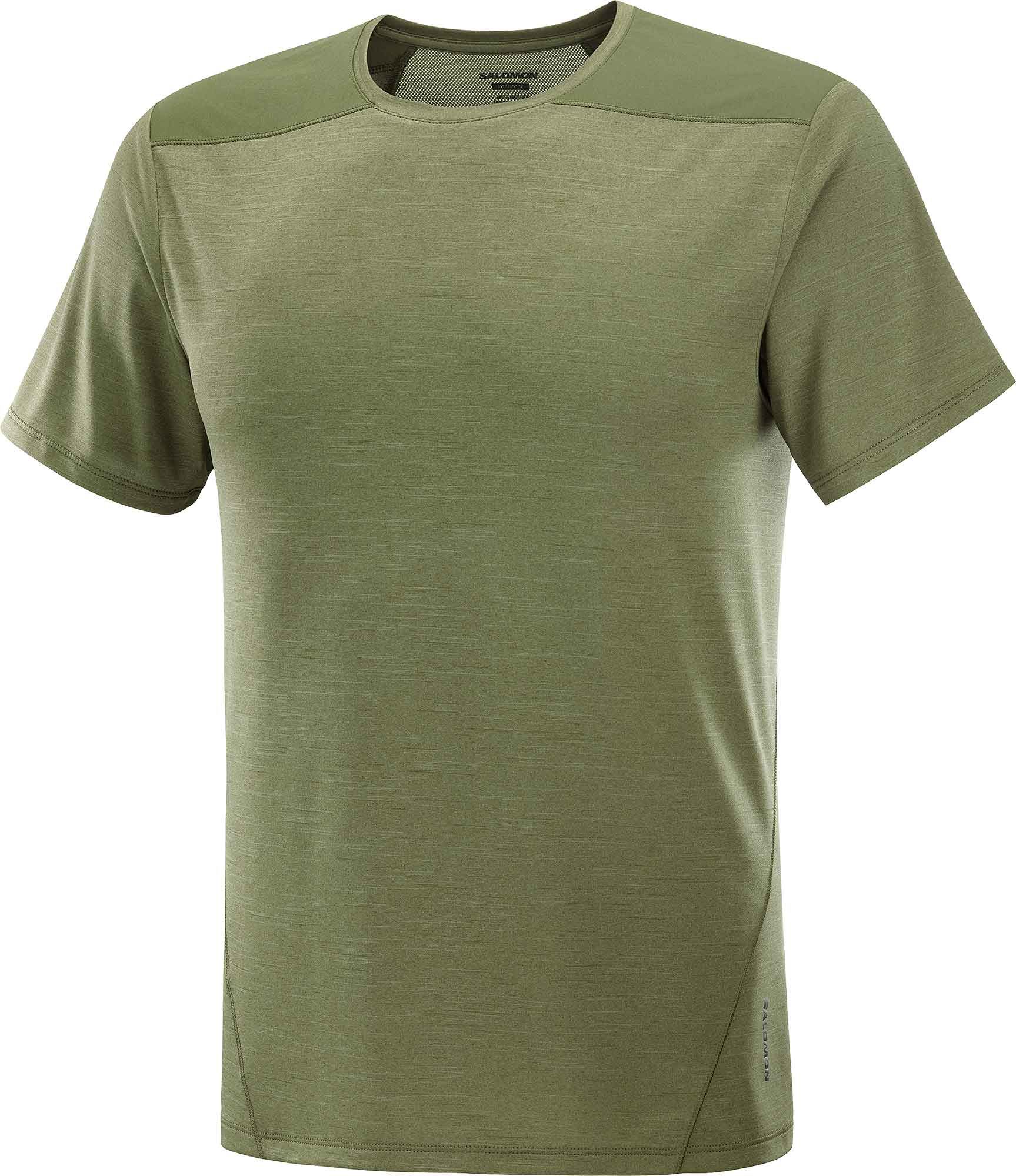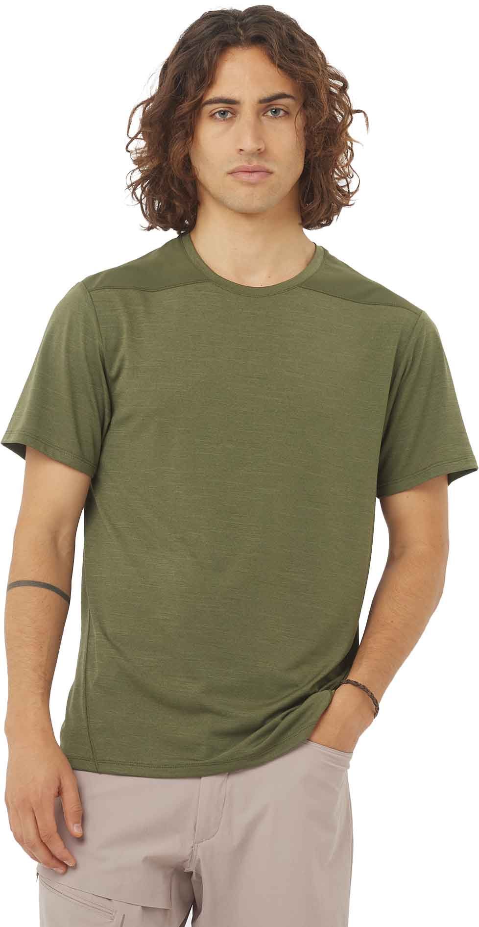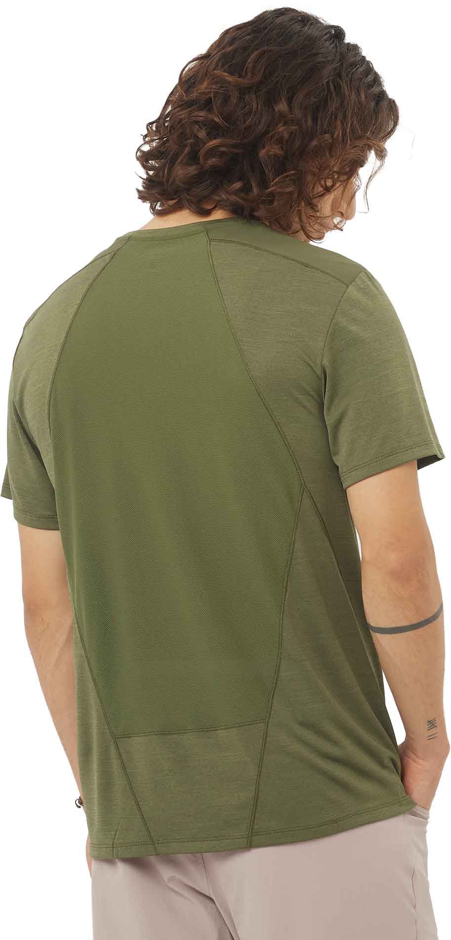 T-shirt de randonnée Salomon Outline SS Tee Grape Leaf pour homme, léger et à séchage rapide, mêlant jersey chiné doux à l’avant et mesh respirant dans le dos pour une évacuation efficace de la transpiration. Empiècements d’épaule renforcés, look sobre ville-montagne.