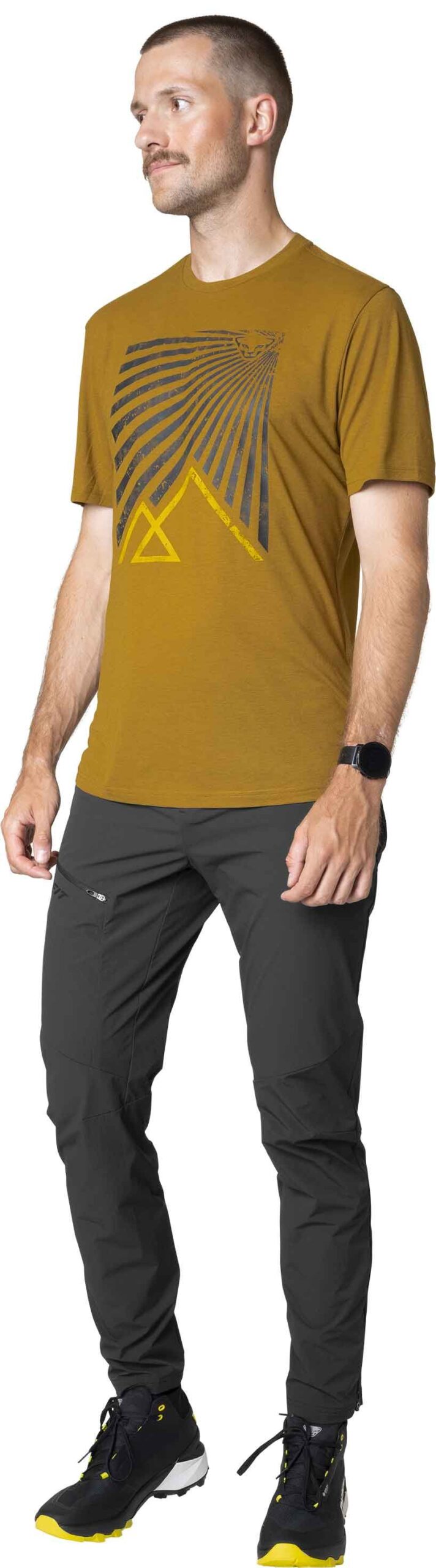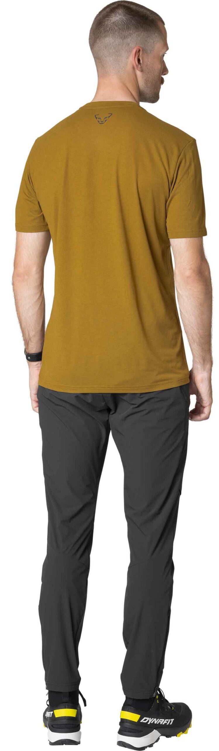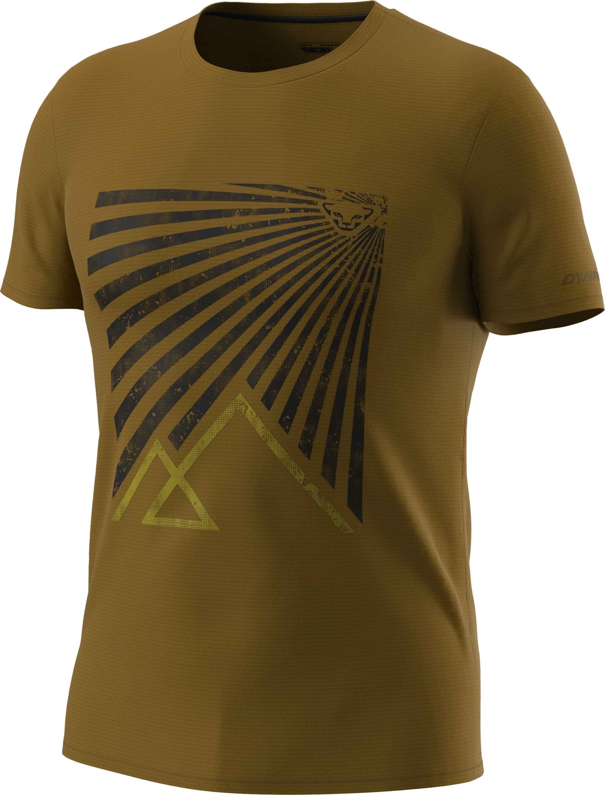 Le t-shirt Dynafit Transalper Graphic S/S Tee Relic pour homme conjugue coupe ajustée, polyester recyclé et lyocell pour un séchage rapide, une respirabilité optimale et une fraîcheur durable en randonnée estivale.