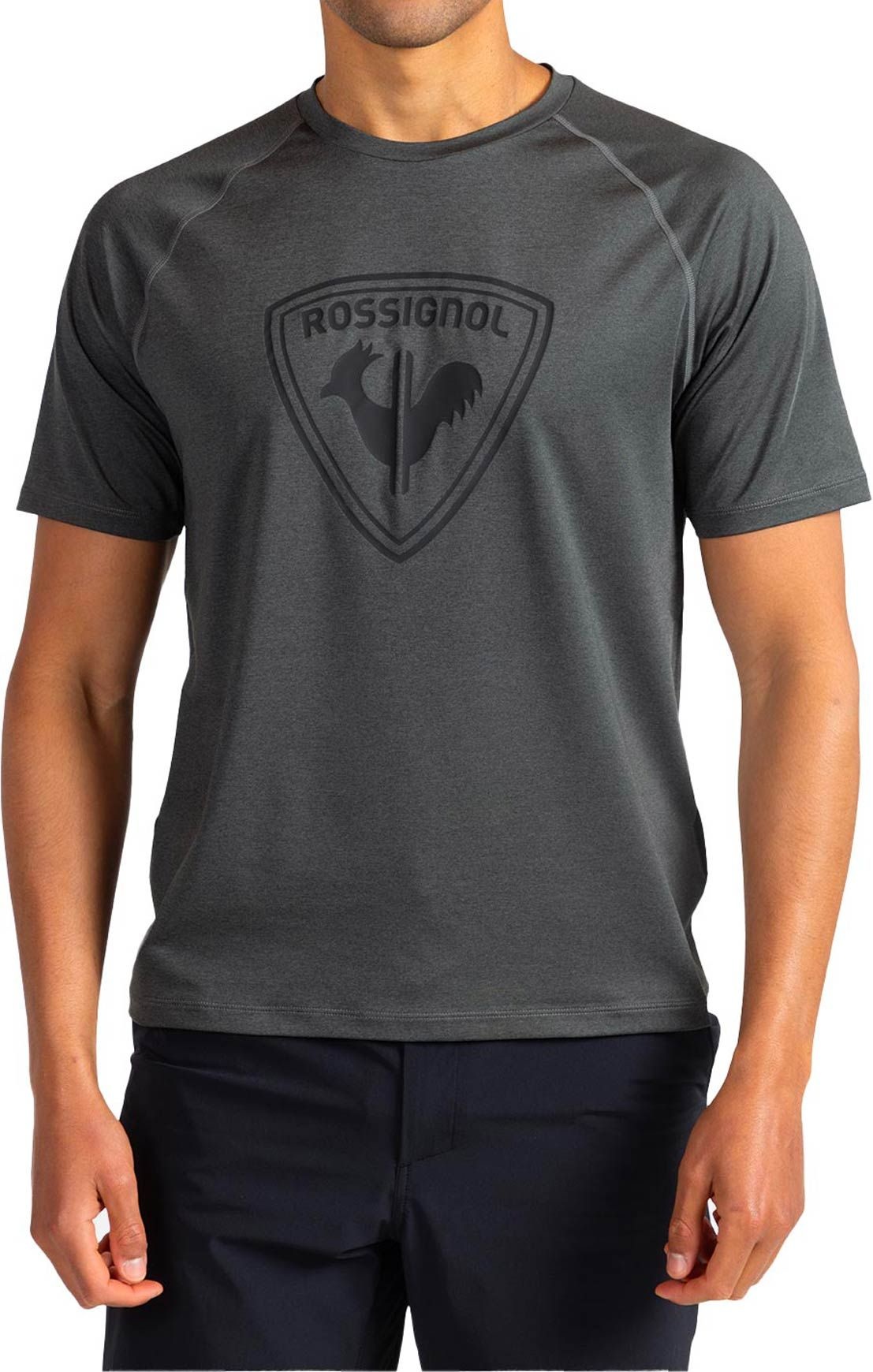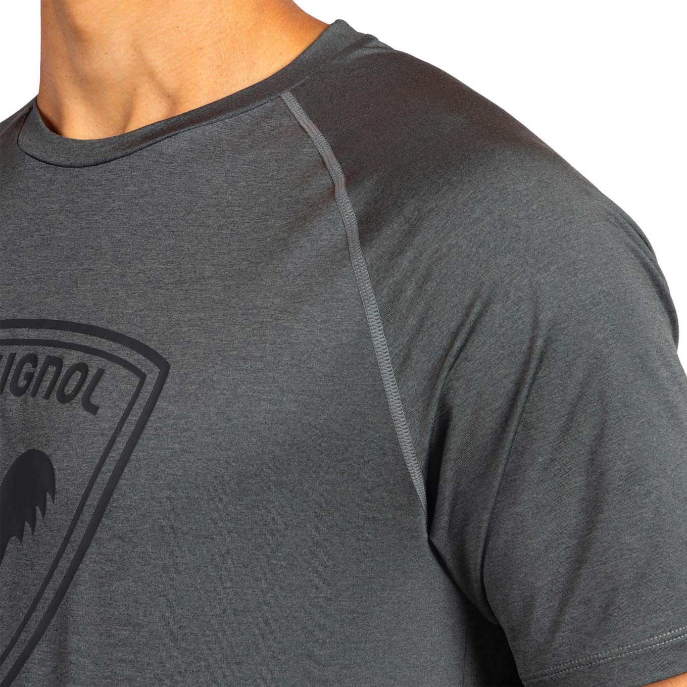 Le tee-shirt Rossignol Westweg Shield Tee Onyx Grey homme allie tissu stretch recyclé, coupe ajustée, manches raglan et traitement anti-odeurs HeiQ® Fresh pour le sport et le quotidien.
