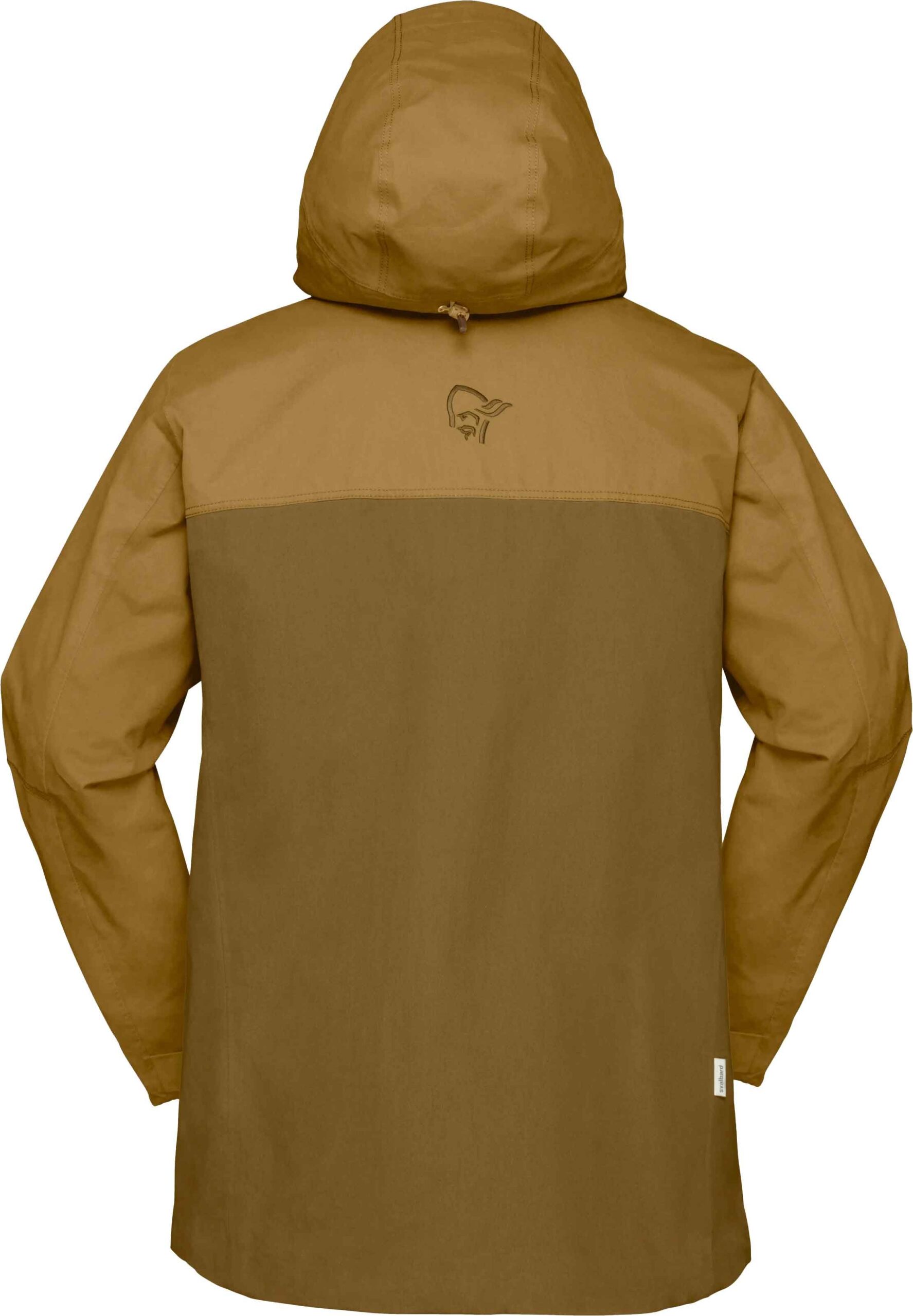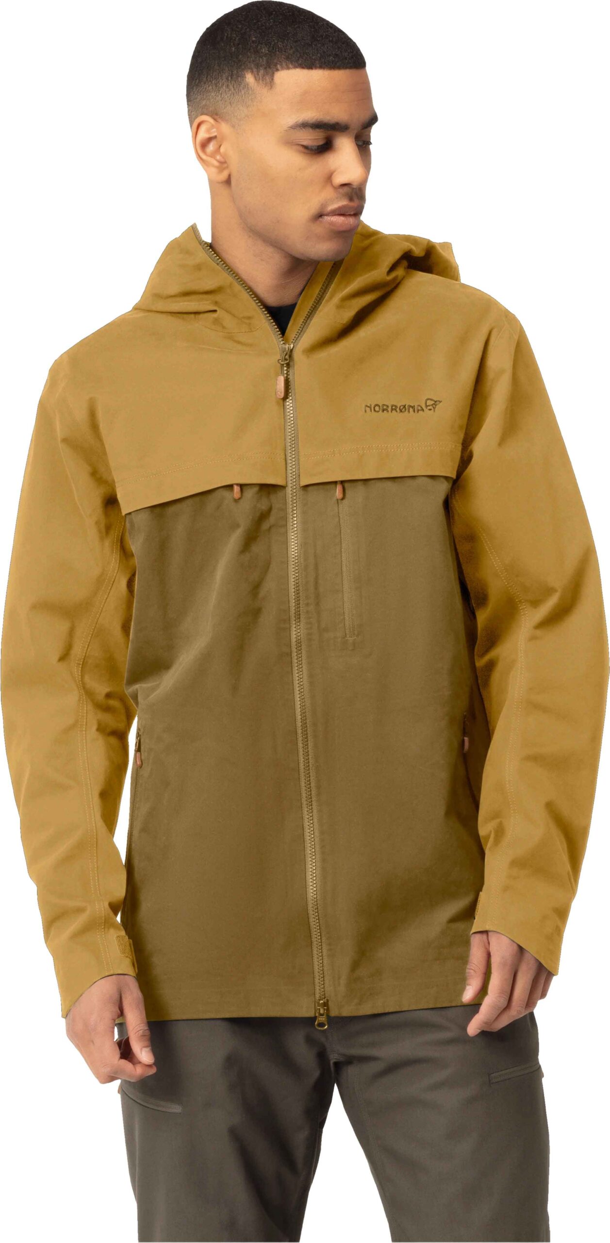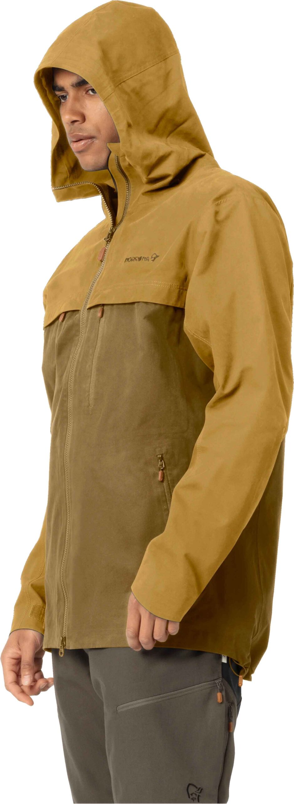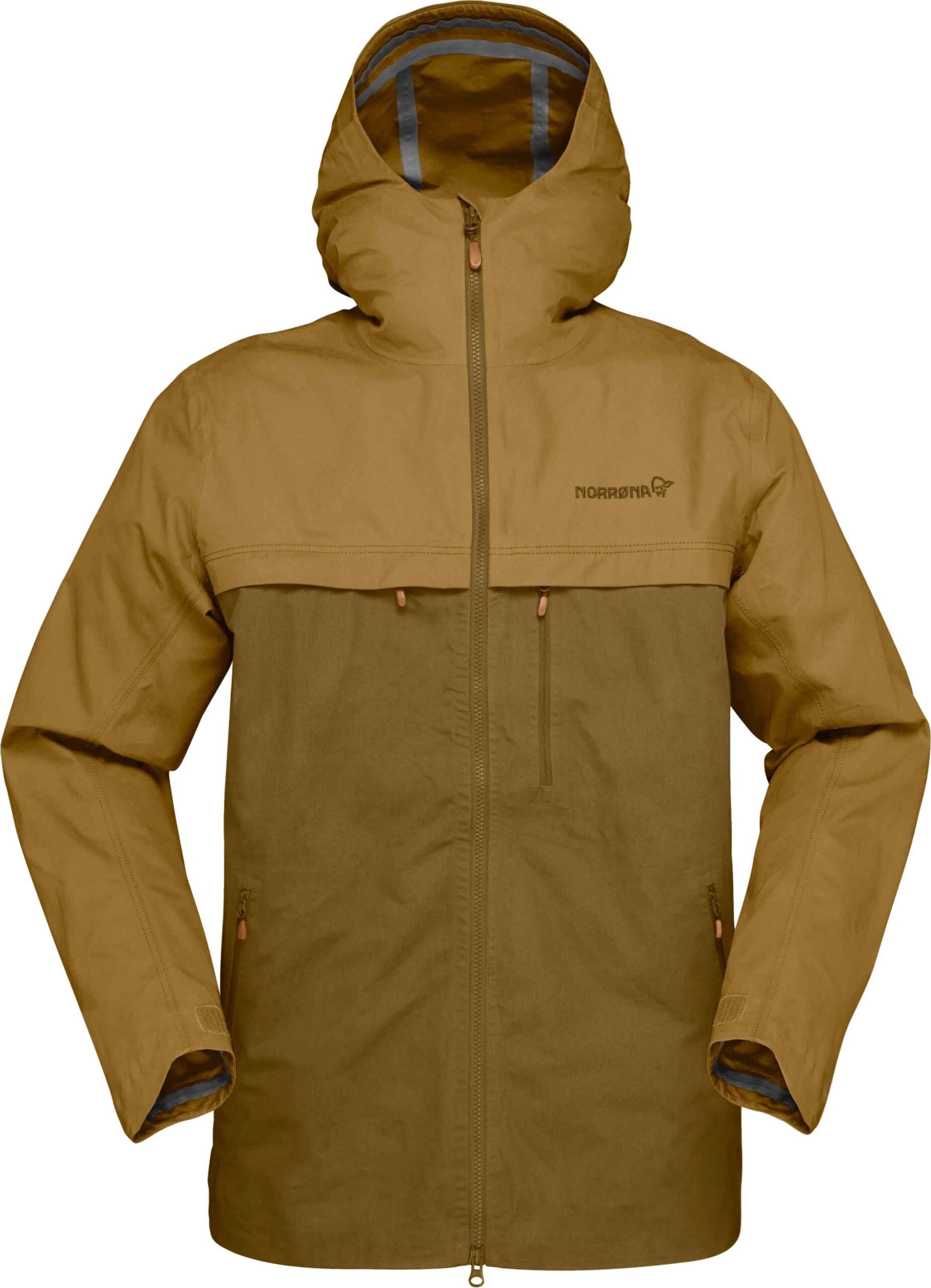 La veste Femund Cotton Jacket Camelflage pour homme signée Norrona conjugue coton biologique et polyester recyclé pour une protection respirante, coupe-vent et déperlante DWR sans PFC, complétée par capuche bonnet-compatible, poches fonctionnelles et articulations des bras pour une mobilité maximale en randonnée.