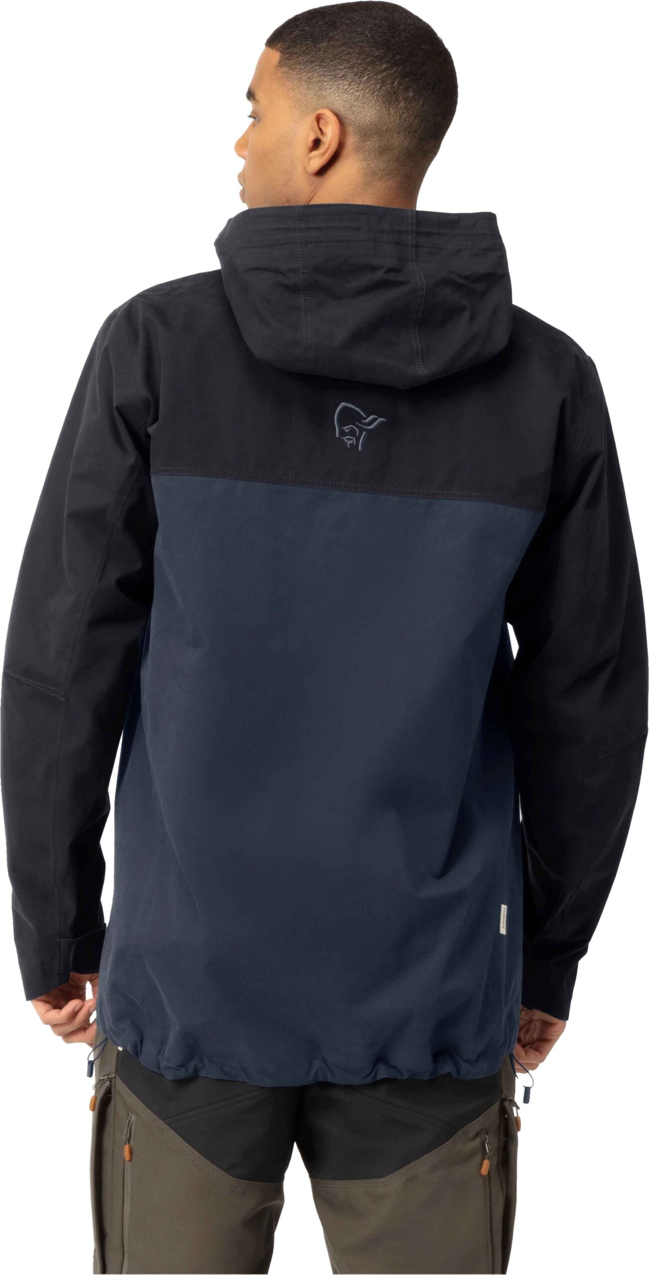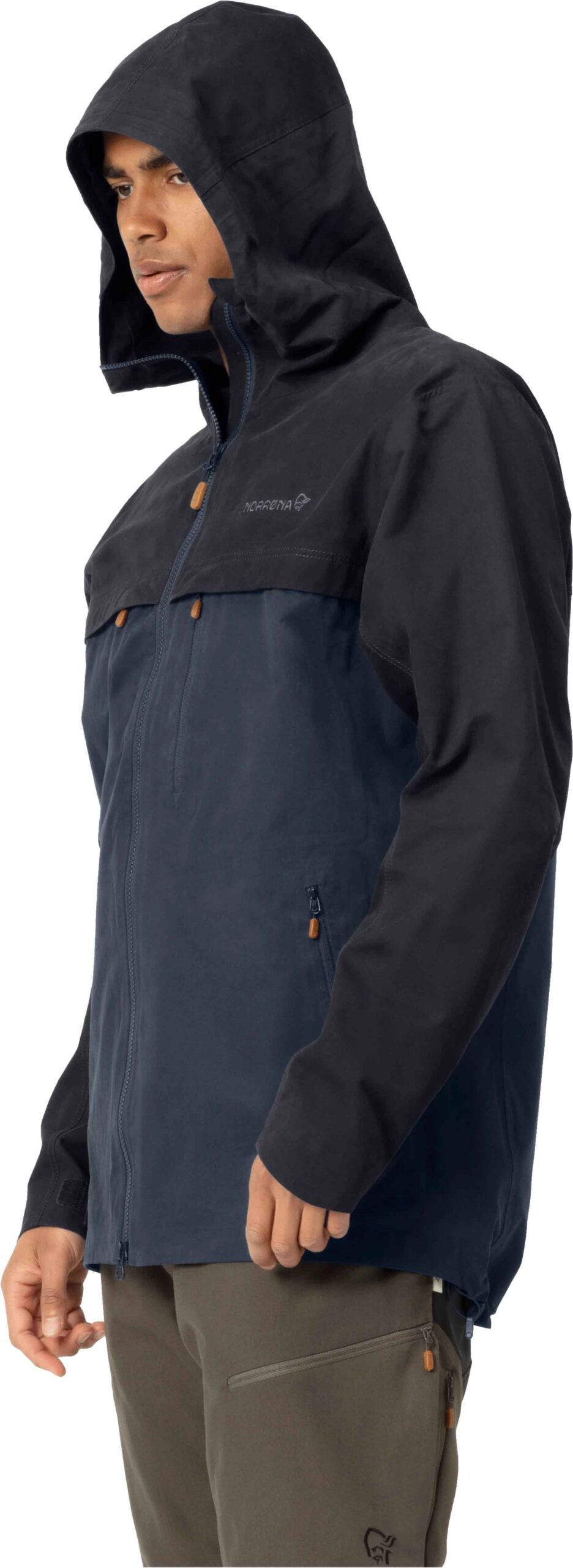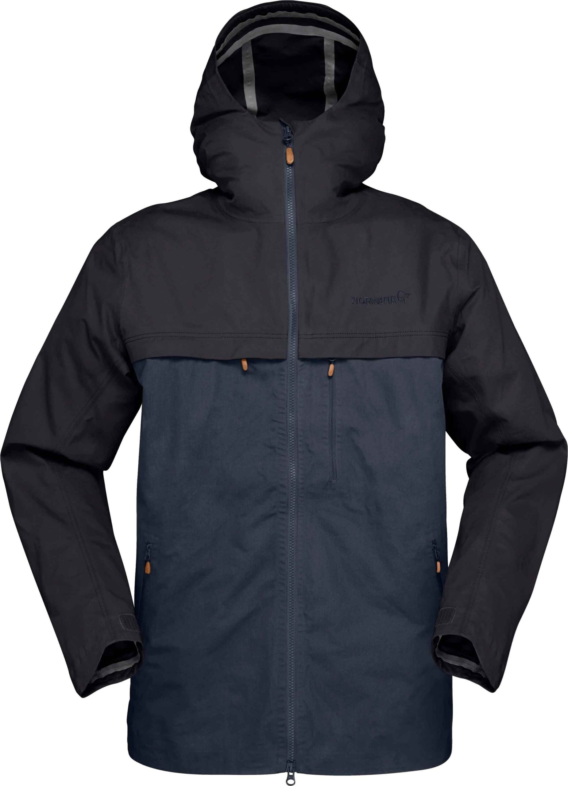 Veste Norrona Femund Cotton Jacket Navy Blazer pour homme, respirante, coupe-vent et déperlante DWR, en coton bio et polyester recyclé, avec capuche, poches pratiques et poignets ajustables pour la randonnée.