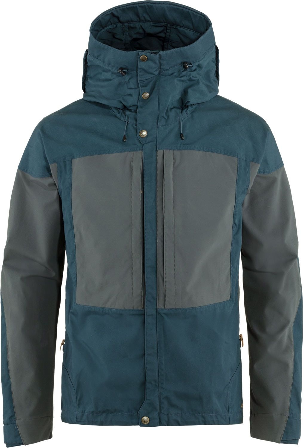 La veste de trekking Fjällräven Keb Jacket Mountain Blue Basalt homme combine G-1000® Eco coupe-vent, respirant et extensible au dos pour liberté de mouvement, capuche réglable, grandes poches poitrine, ajustement taille.