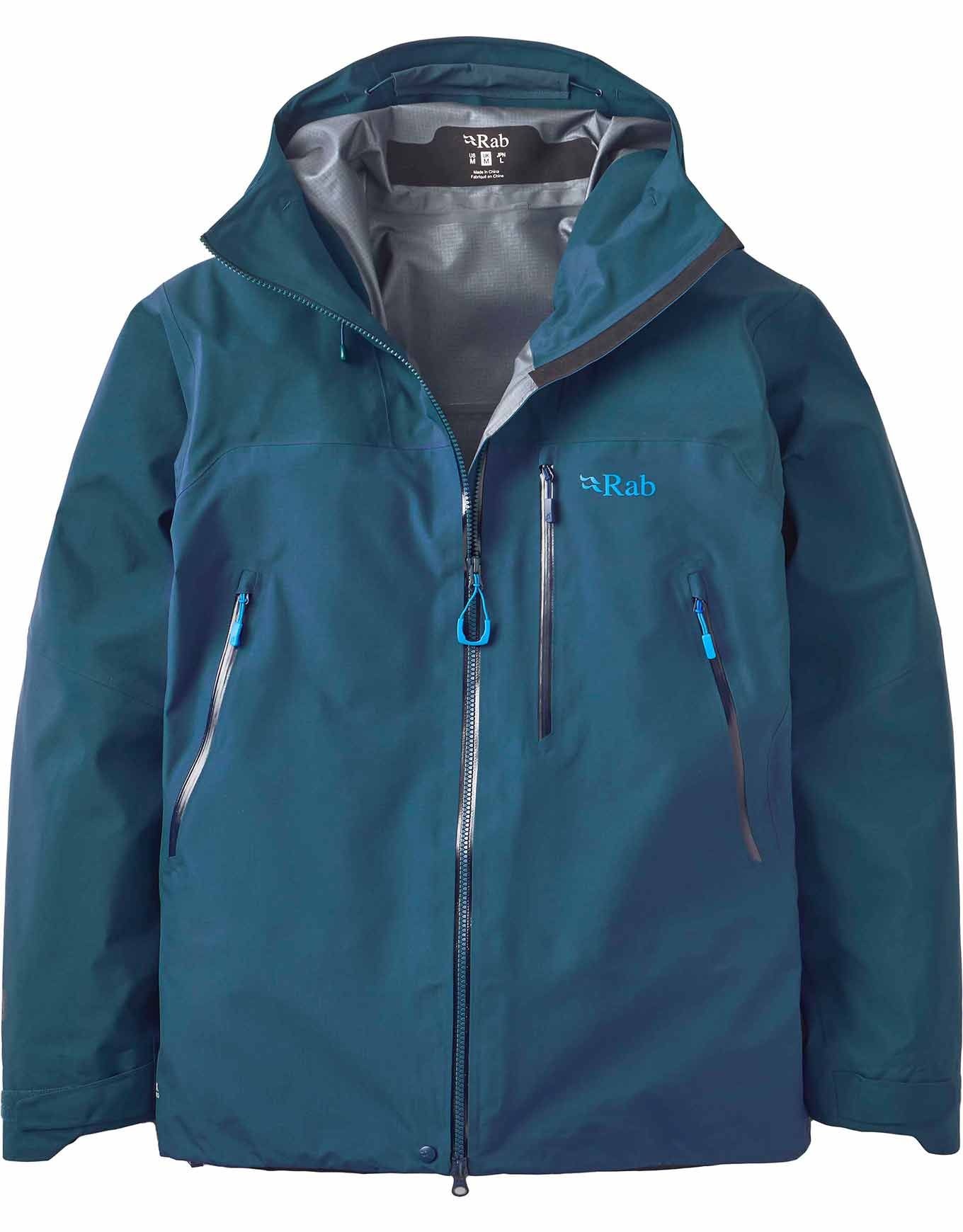 Veste Rab Latok Mountain GTX pour homme, en GORE-TEX PRO ePE légère et imperméable, conçue pour l’alpinisme extrême. Capuche casque-compatible, manches préformées, poches accessibles avec sac.