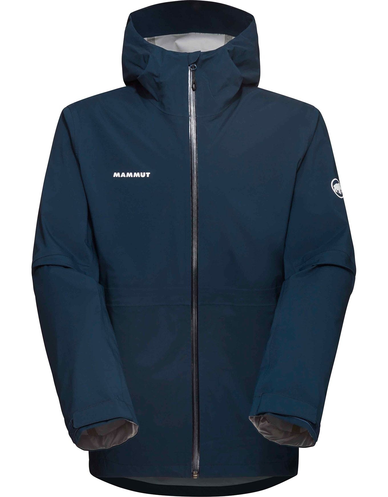La veste Mammut Linard Guide HS Hooded Jacket Marine pour homme associe membrane Dry Tour imperméable et respirante à un tissu extensible pour la randonnée par tous les temps, avec capuche réglable, ventilations latérales et compressibilité optimale.