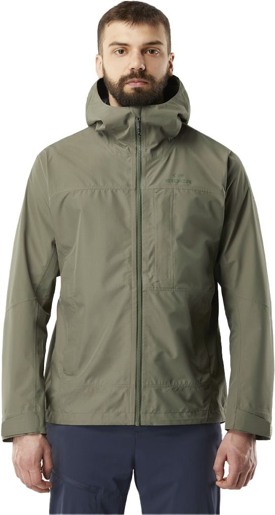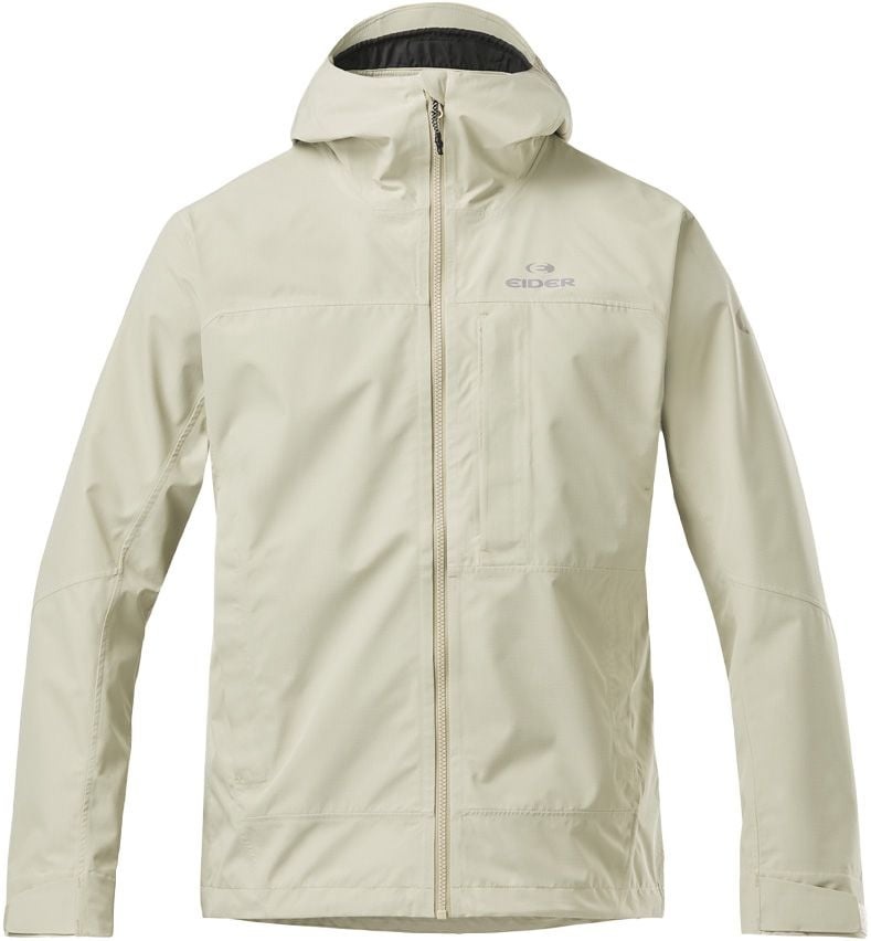 Veste de randonnée EIDER Mist Jkt pour homme en beige, tissu ripstop partiellement recyclé respirant et résistant à l’eau, avec capuche réglée casque-compatible, fermeture Aquaguard YKK® et ventilation sous les bras pour un confort actif.