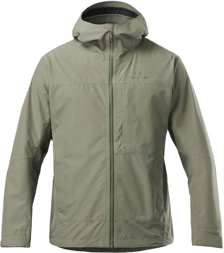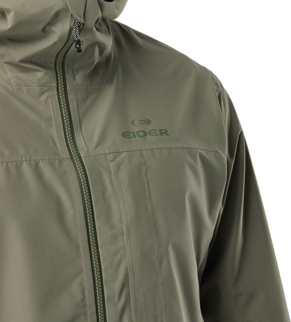 EIDER Mist Jkt Khaki est une veste de randonnée homme en tissu ripstop respirant, résistant à l’eau, avec capuche réglable casque-compatible, manches préformées et ventilation latérale pour liberté et fraîcheur en montagne.