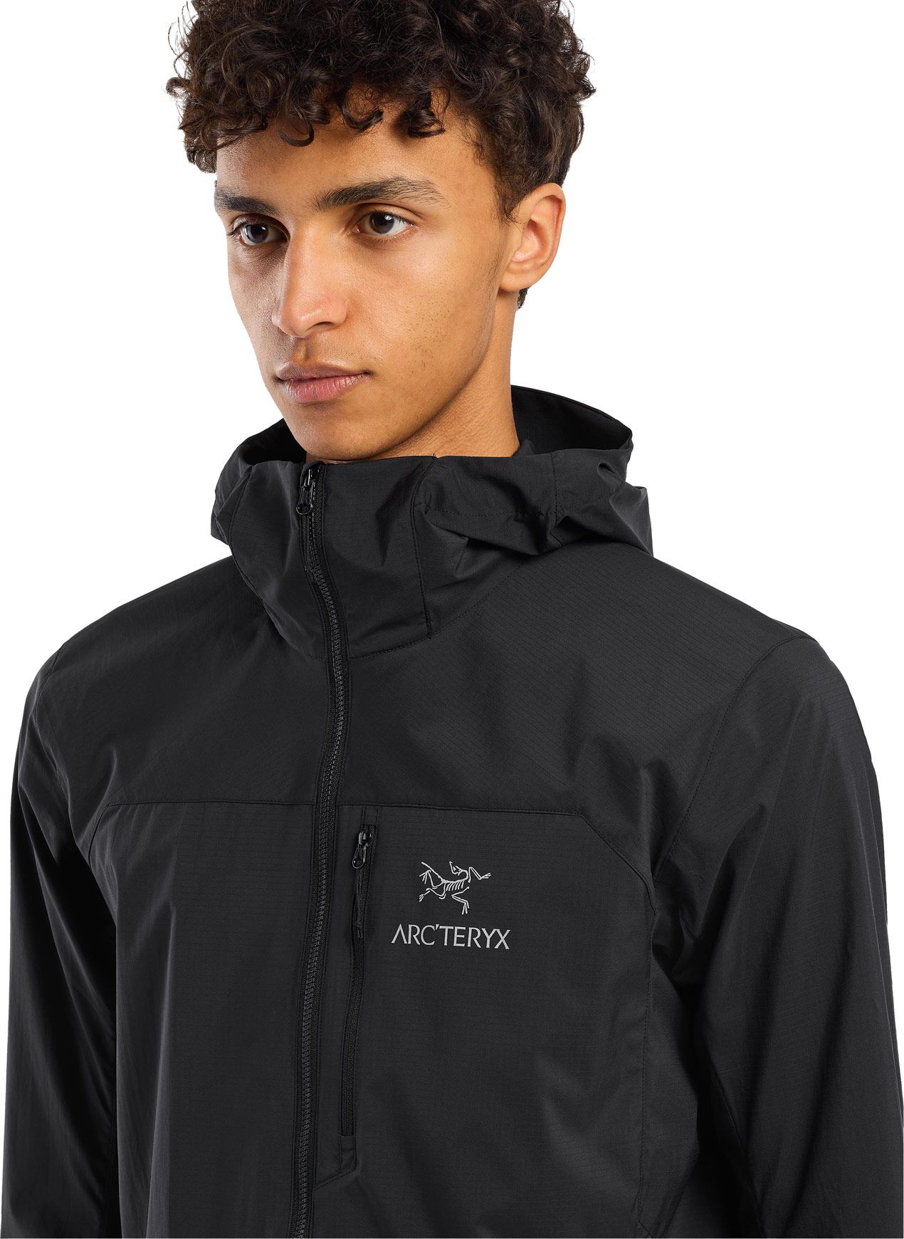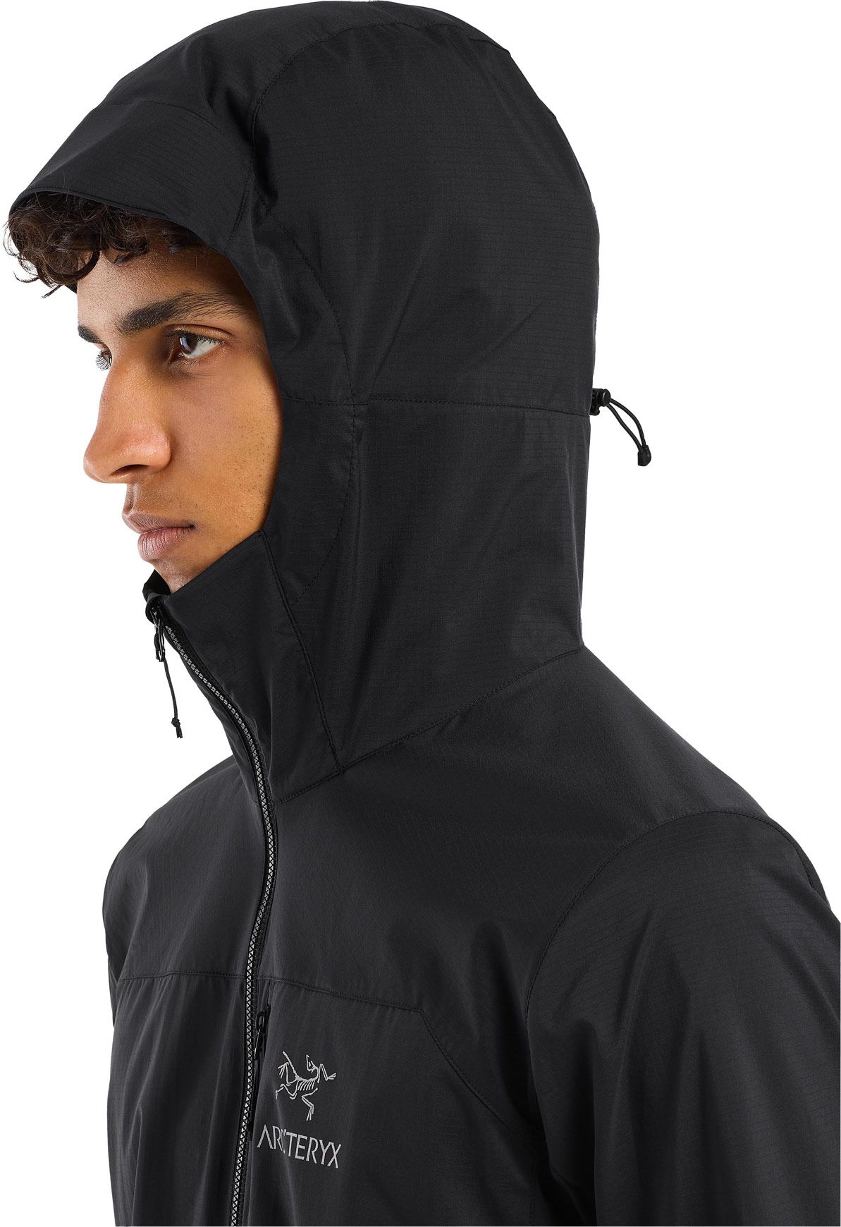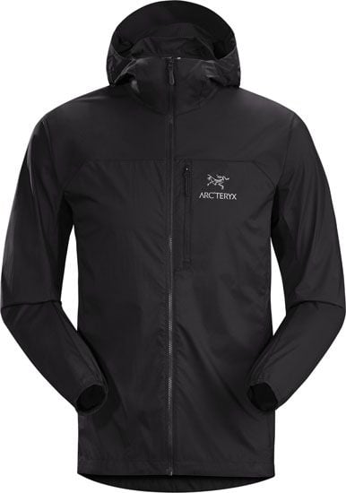 La veste technique Arc’teryx Squamish Hoody Black pour homme offre protection coupe-vent, respirabilité et compressibilité pour randonnée et trail.