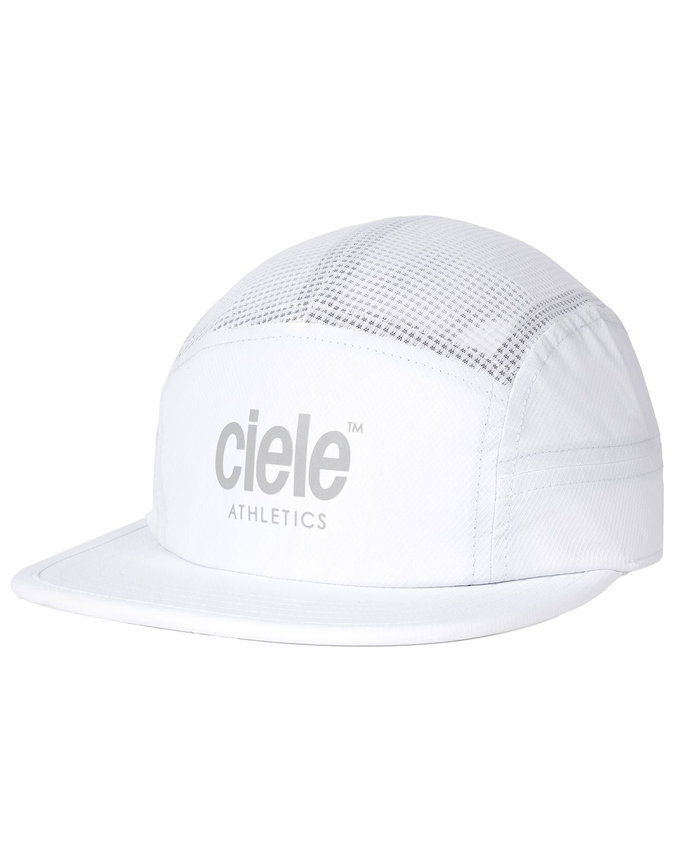 Casquette Ciele GOCap Classic Athletics Ghost unisexe à visière plate, conçue pour le running longue distance. Technologie COOLmatic pour une évacuation rapide de l’humidité, protection solaire UPF 40+ et détails réfléchissants pour la visibilité nocturne.