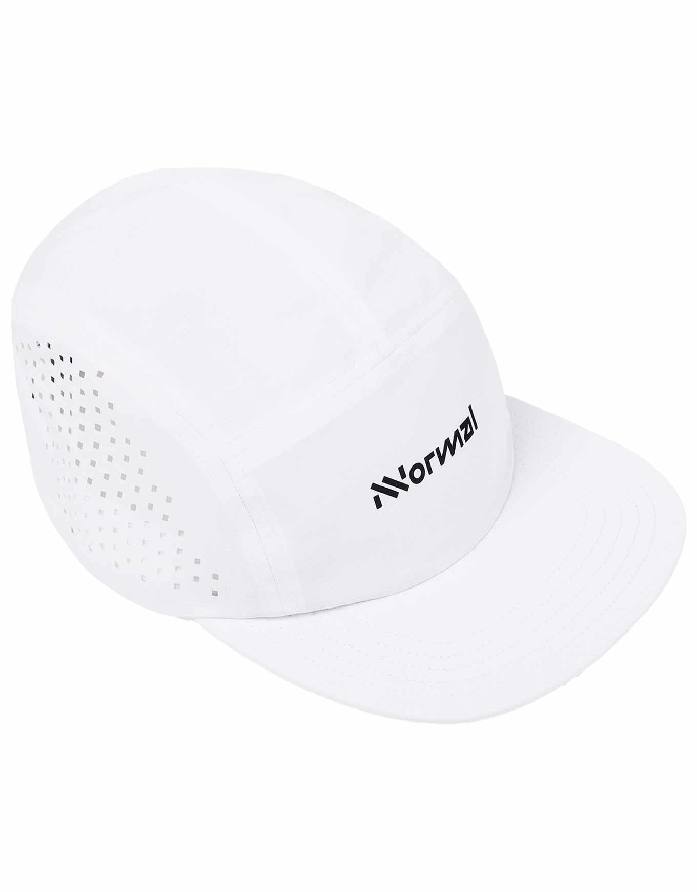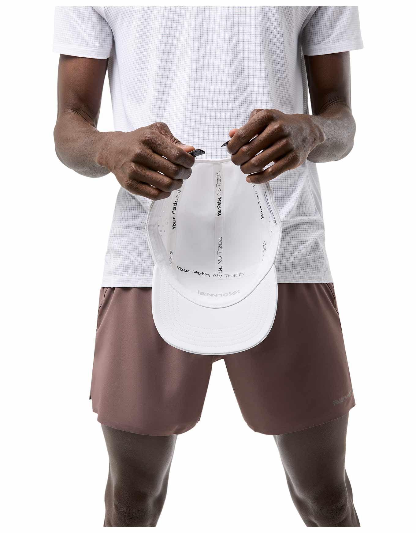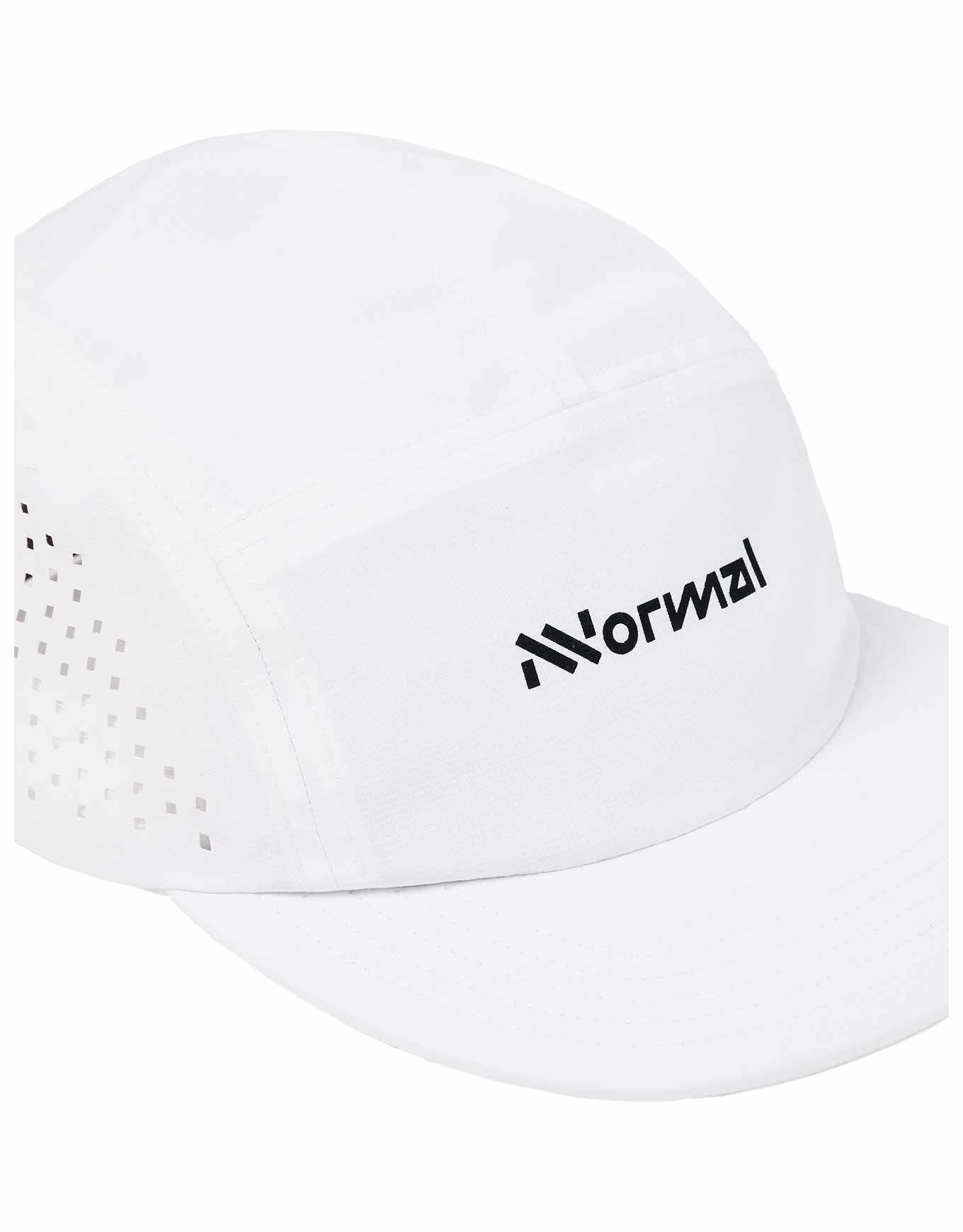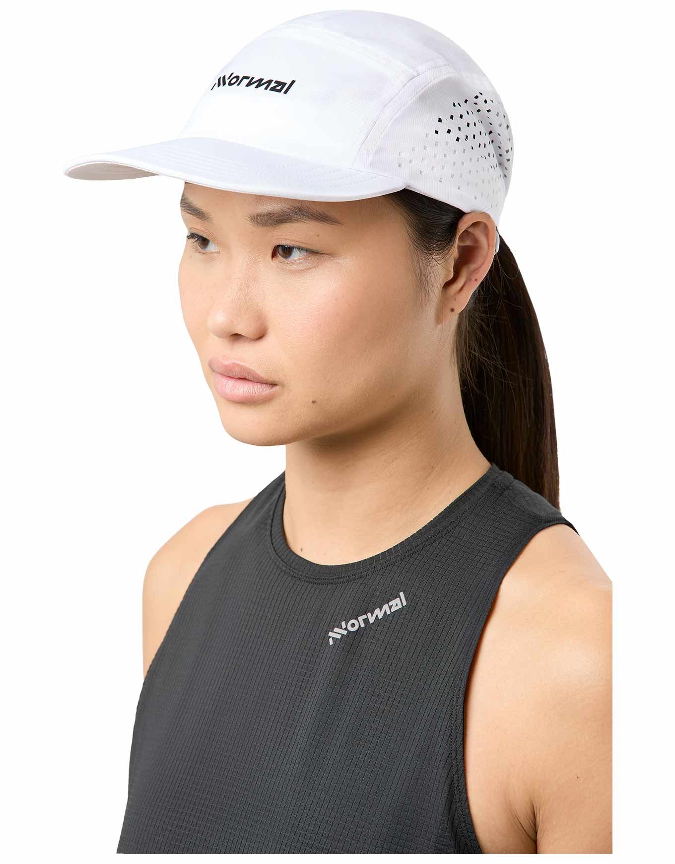 Casquette de trail-running NNormal Race Cap White, légère et résistante, conçue pour protéger du soleil et garantir un confort optimal sur longues distances grâce à ses zones d’aération laser et sa visière souple.