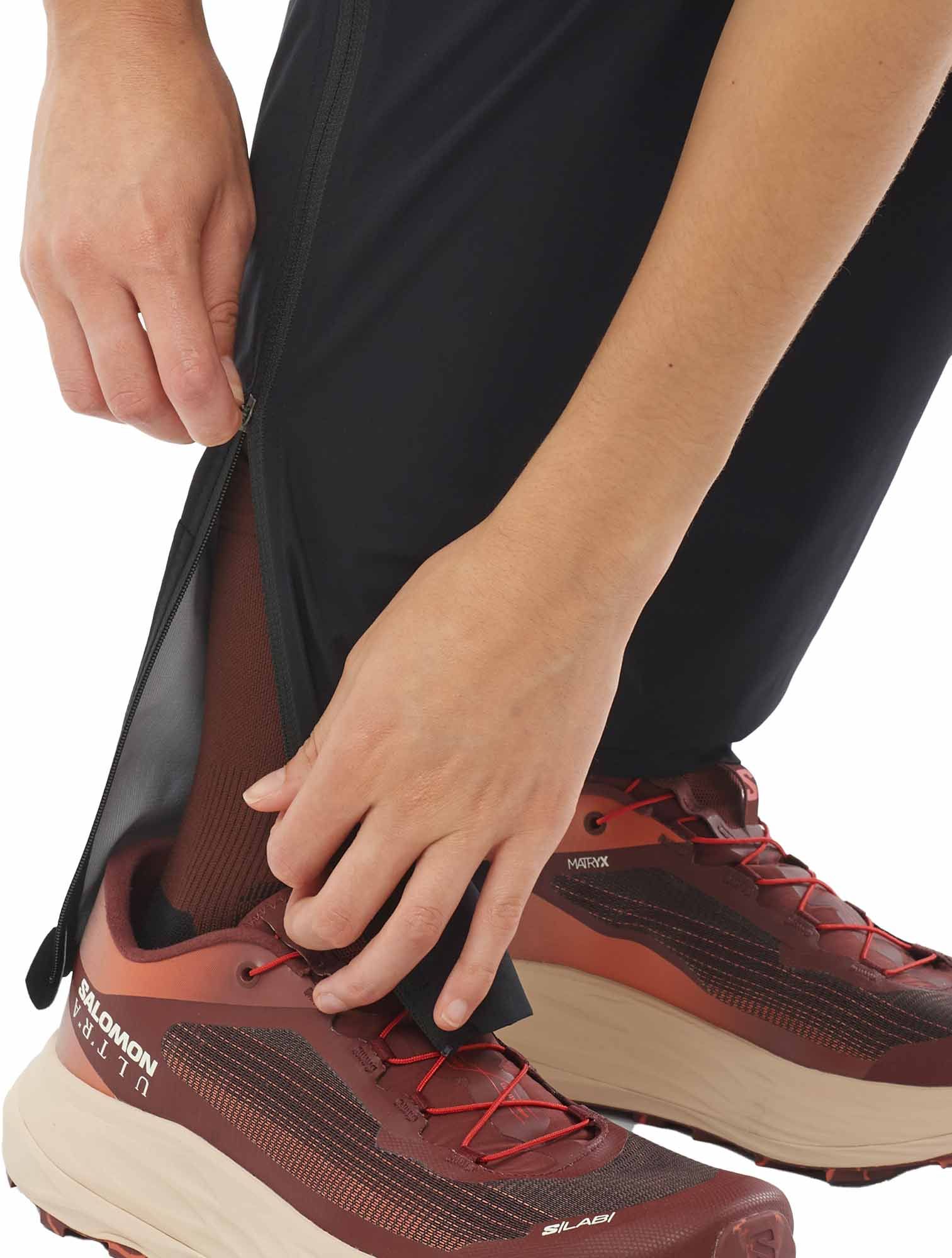 Des dézippements latéraux autorisent l’enfilage ou le retrait instantané du vêtement, y compris lorsque des chaussures de trail sont déjà portées.