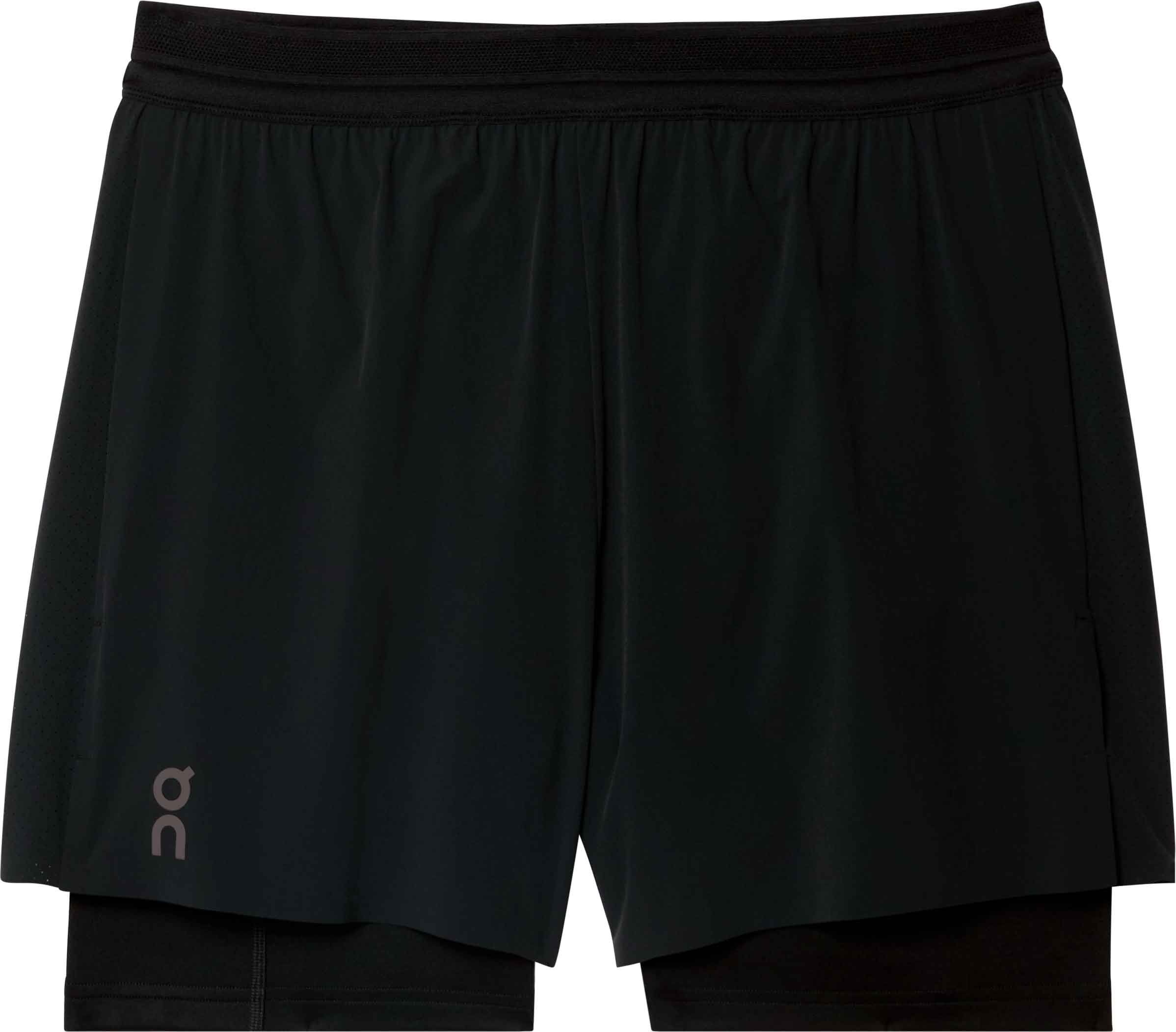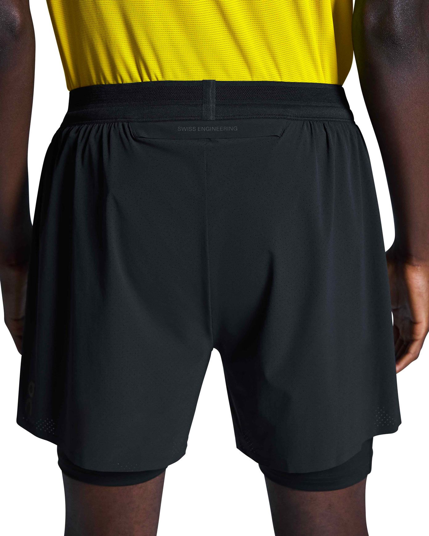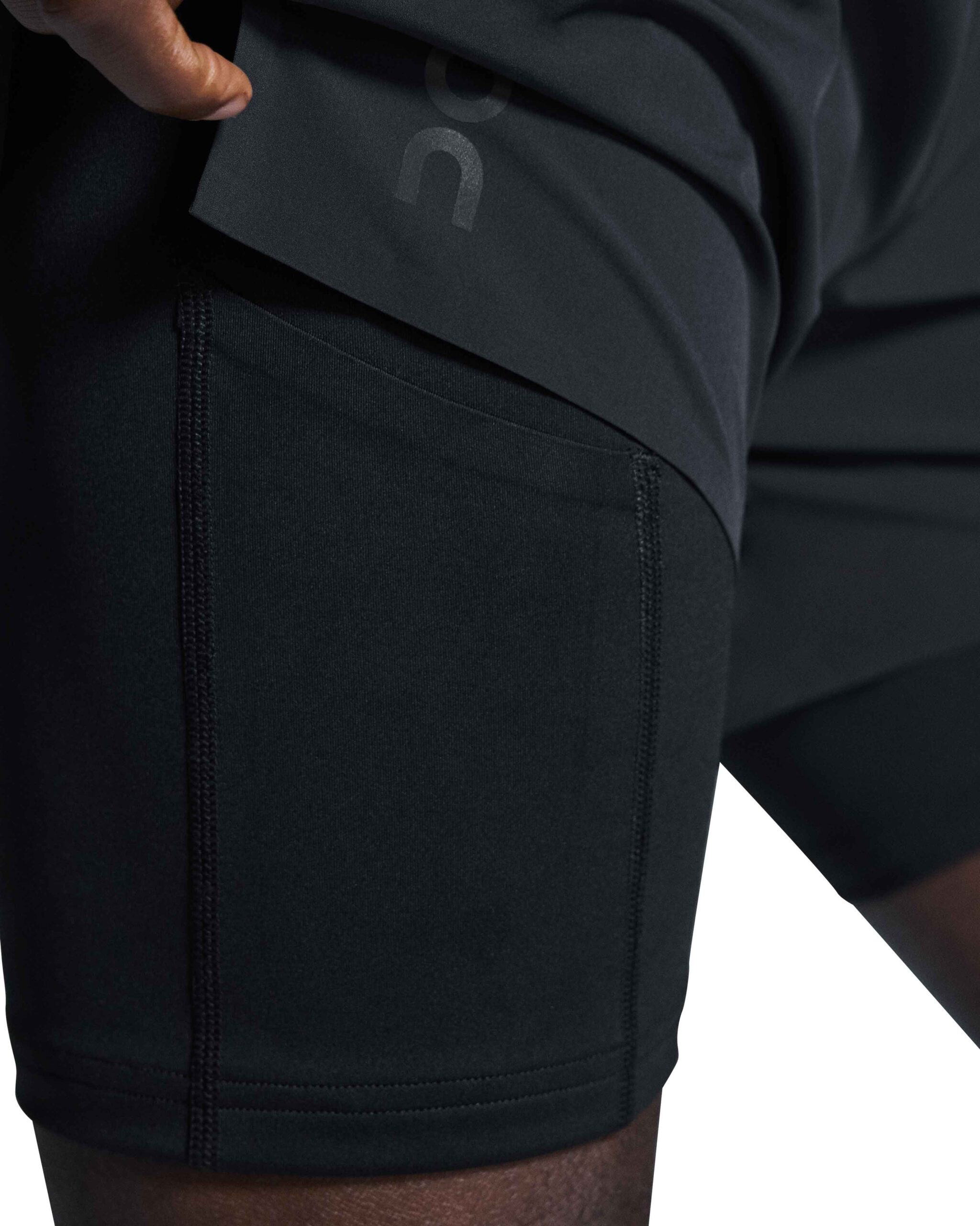 Short 2 en 1 On Running 5″ Performance 2/1 Black : tissu 4-way stretch, cuissard intégré ultra-léger à séchage rapide, respirant avec poches zippées pour séances intenses.