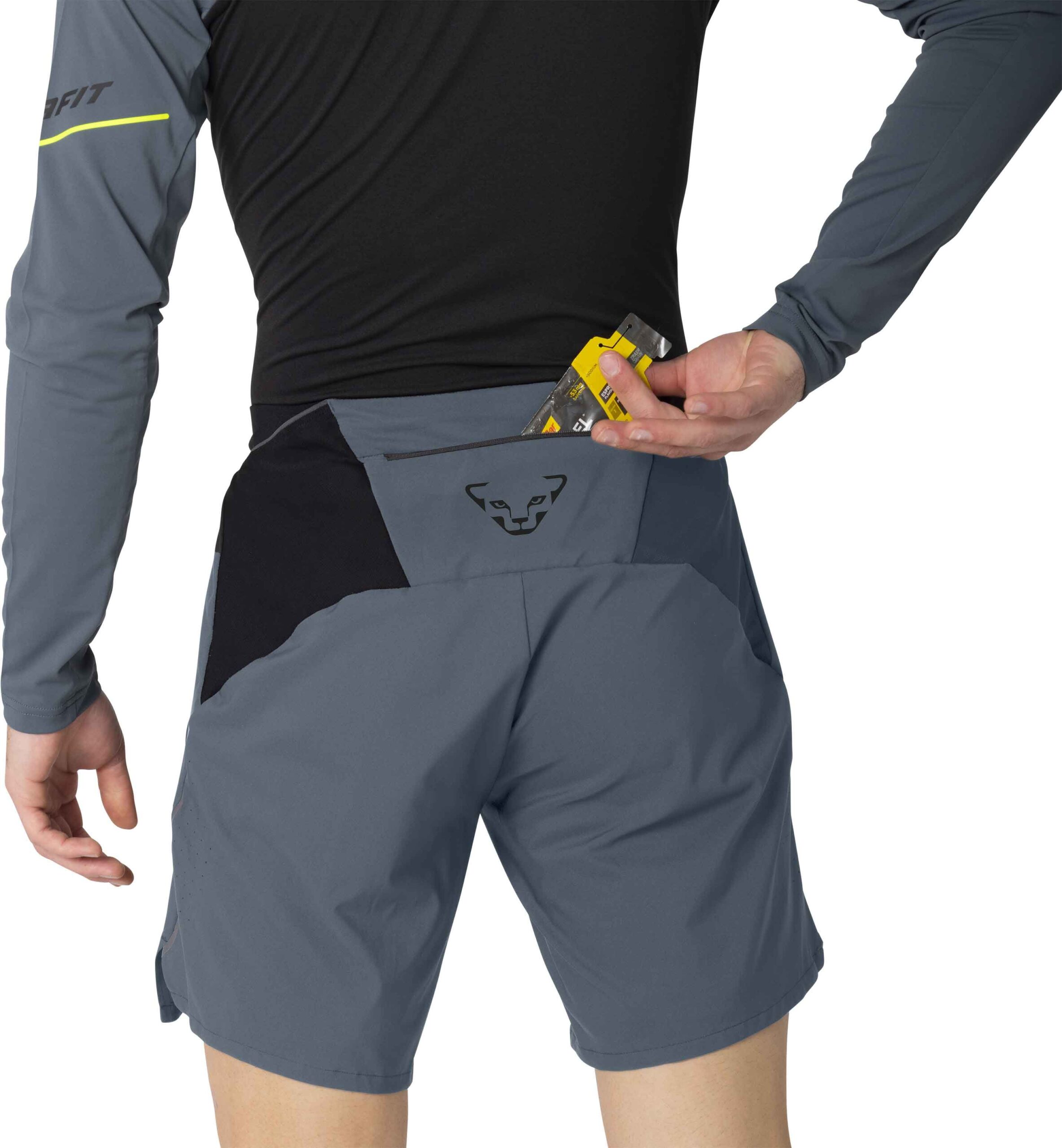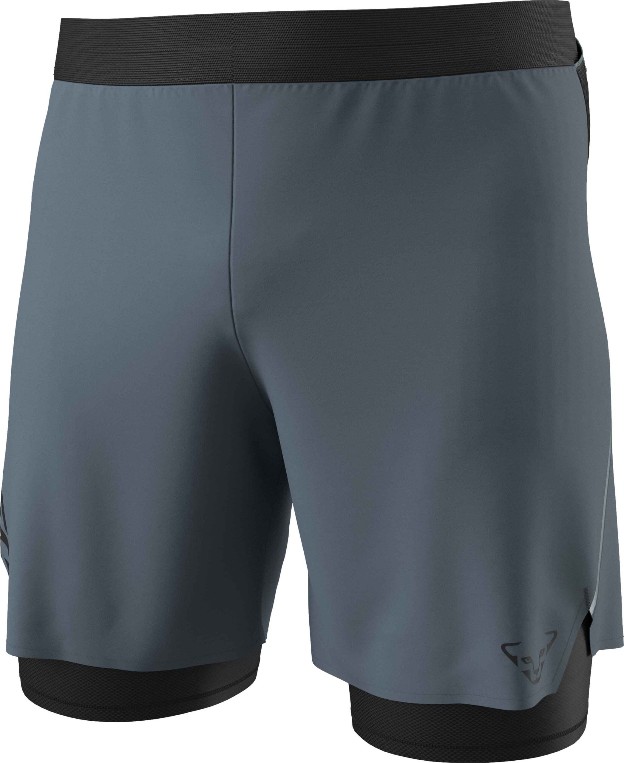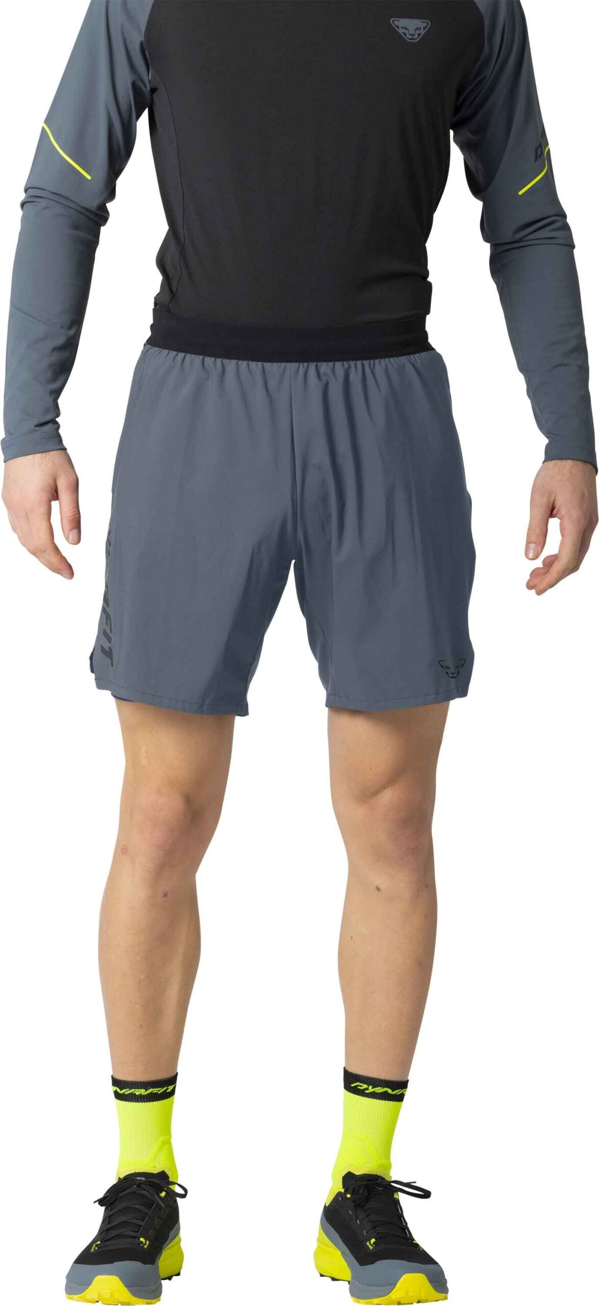Short Dynafit Alpine Pro 2in1 Cinder pour homme, conçu pour le trail et la course à pied. Tissu léger respirant, cuissard intégré, ceinture réglable, coutures plates et bandes réfléchissantes.