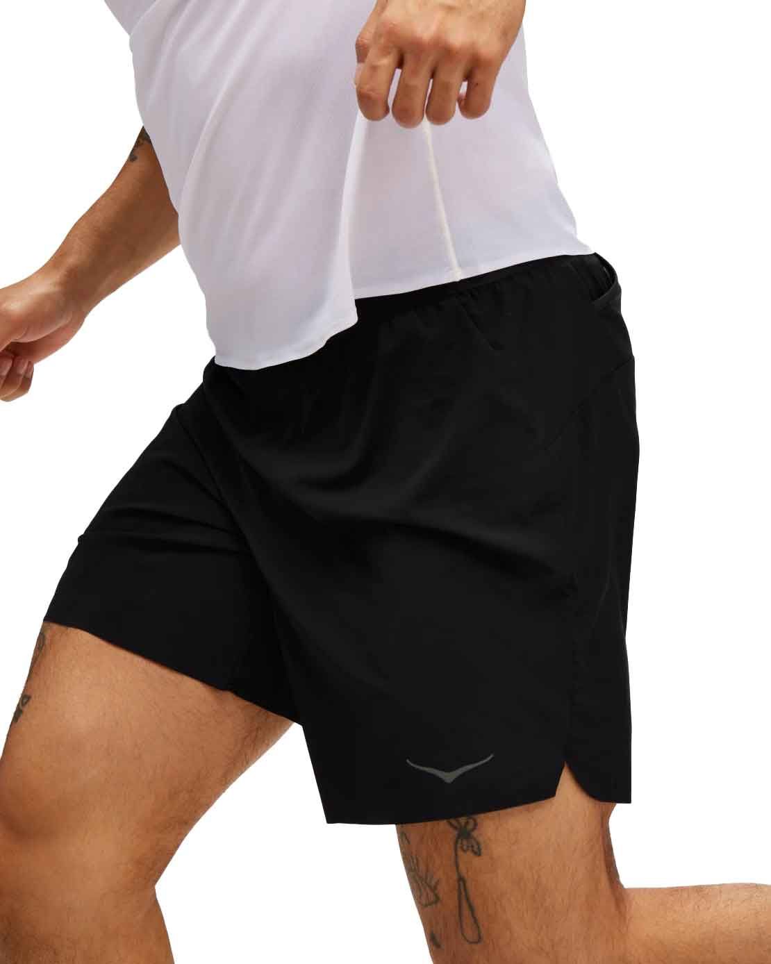 Short de trail homme Hoka Glide 7″ Black : tissu respirant et léger, slip intégré anti-transpiration, ample pour la liberté de mouvement, taille élastique avec poche ceinture et poche zippée.