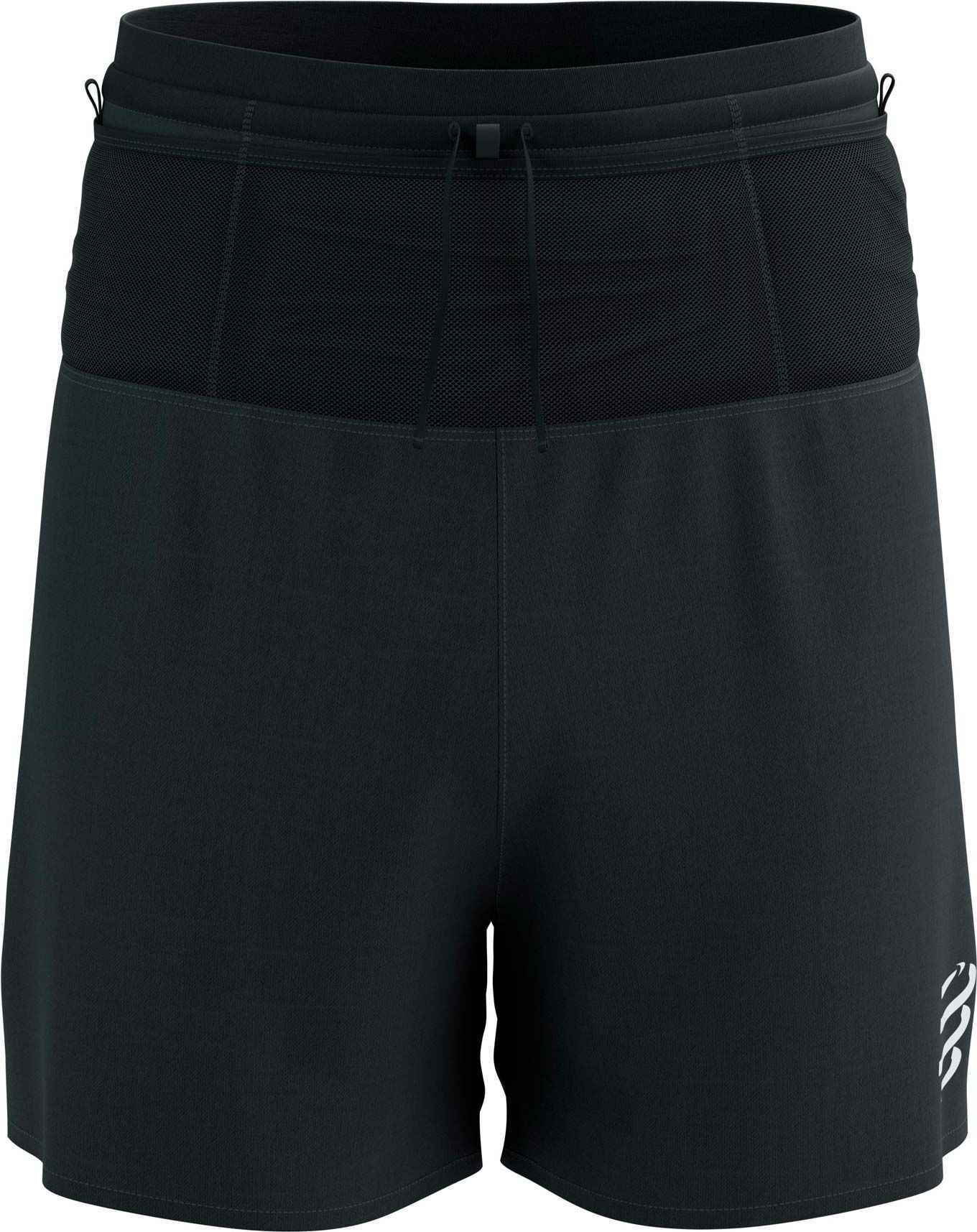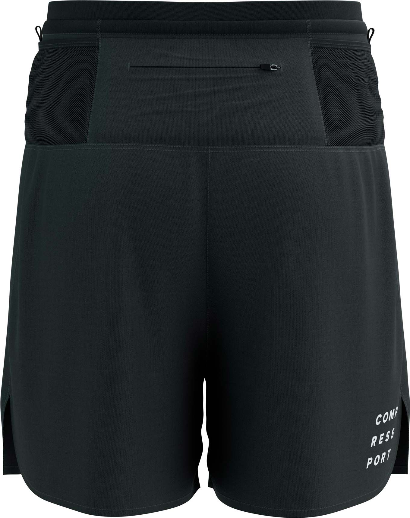Short Compressport Trail Racing 2-in-1 Black : short de trail ultraléger avec sur-short ample, boxer intérieur ventilé pour maintien optimal, ceinture respirante et poche zippée.