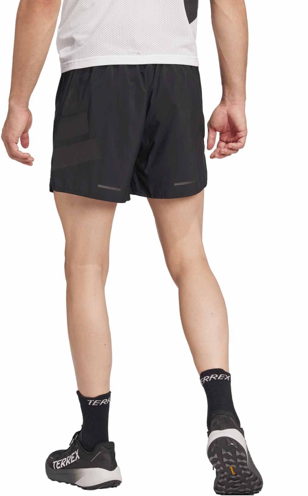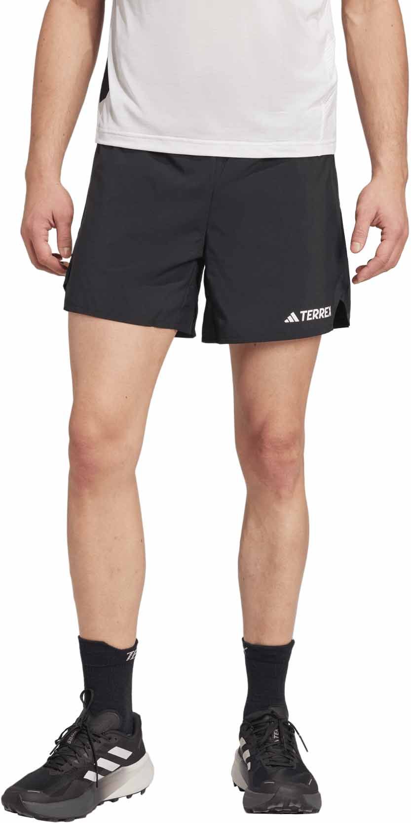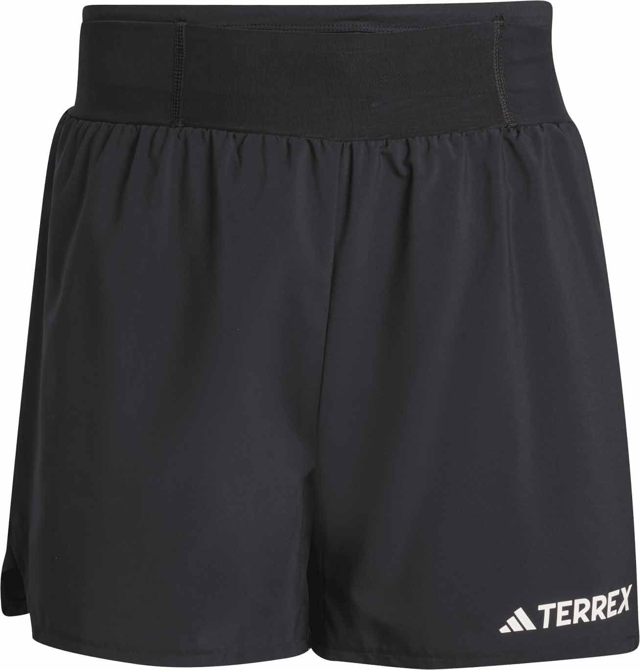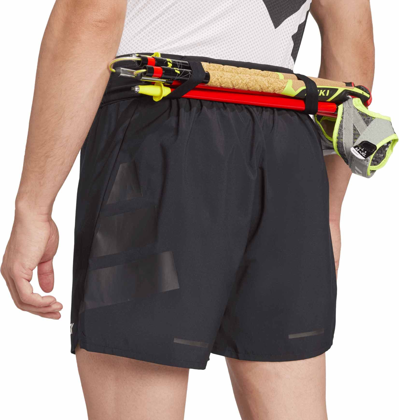 Short de trail Adidas Terrex Xperior Shorts 5″ homme en polyester recyclé, taille élastiquée avec cordon, poche zippée et filet ceinture, anneaux porte-bâtons, aération latérale.