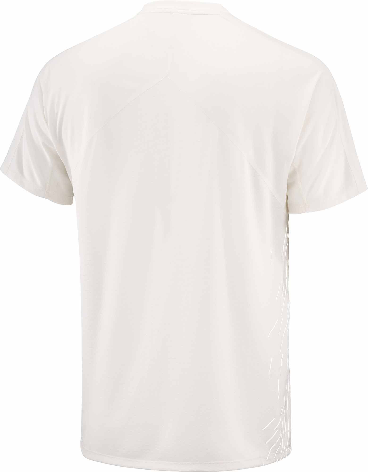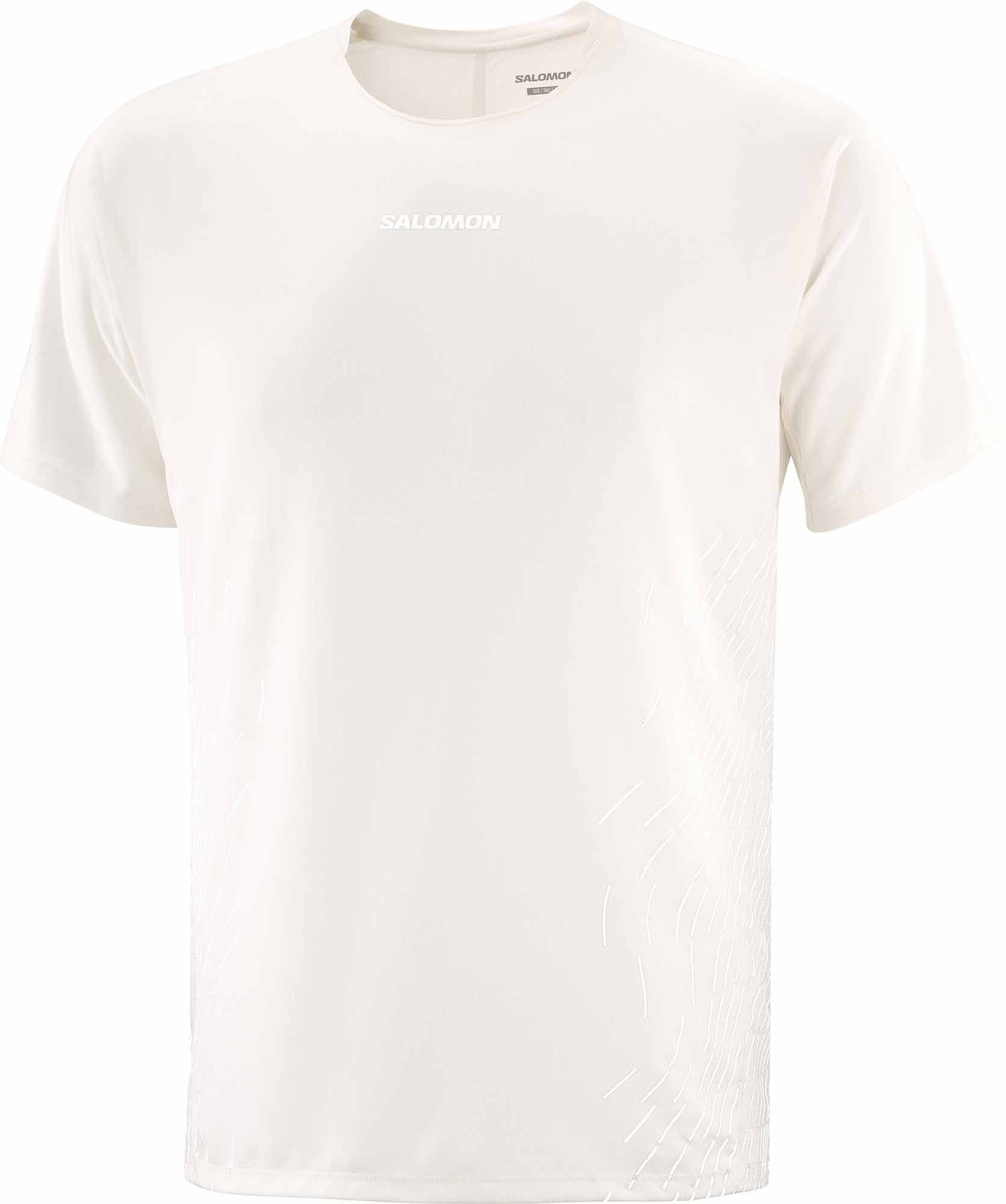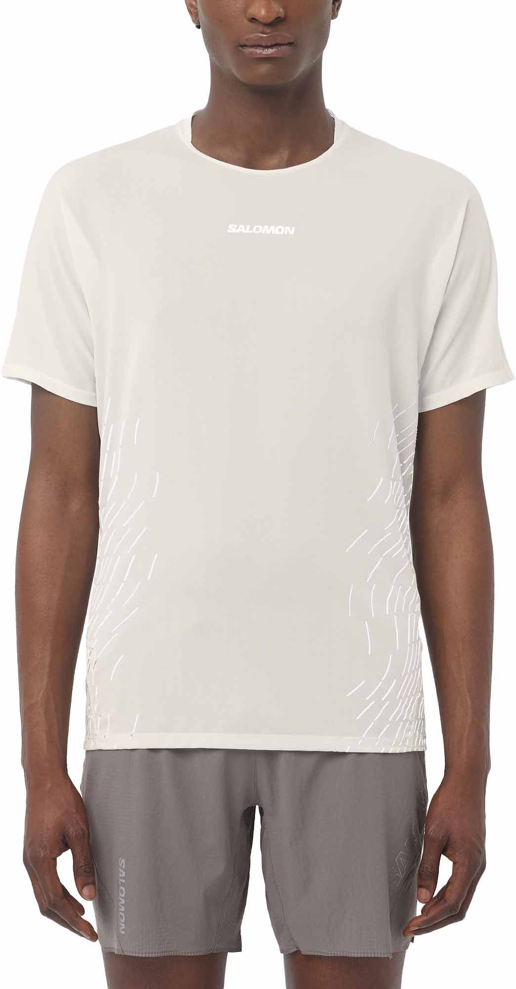 T-shirt Salomon Sense Aero SS Tee GFX Whisper White/White homme, 100 g/m² en Knit-Flow bi-texture, séchage ultra-rapide et thermorégulation 37.5® pour running route ou trail.