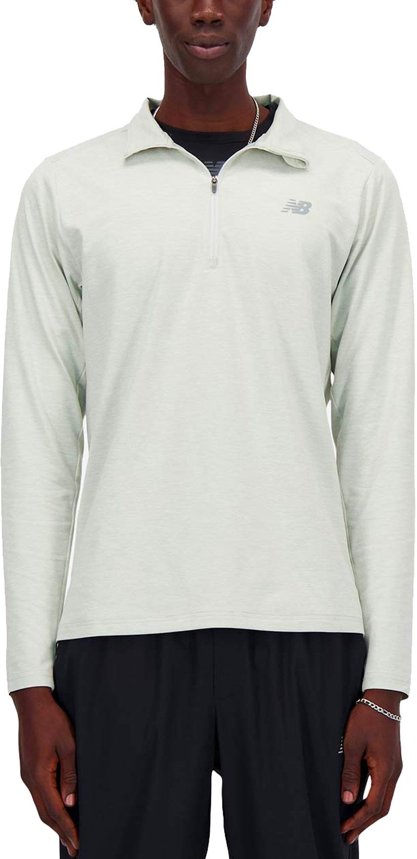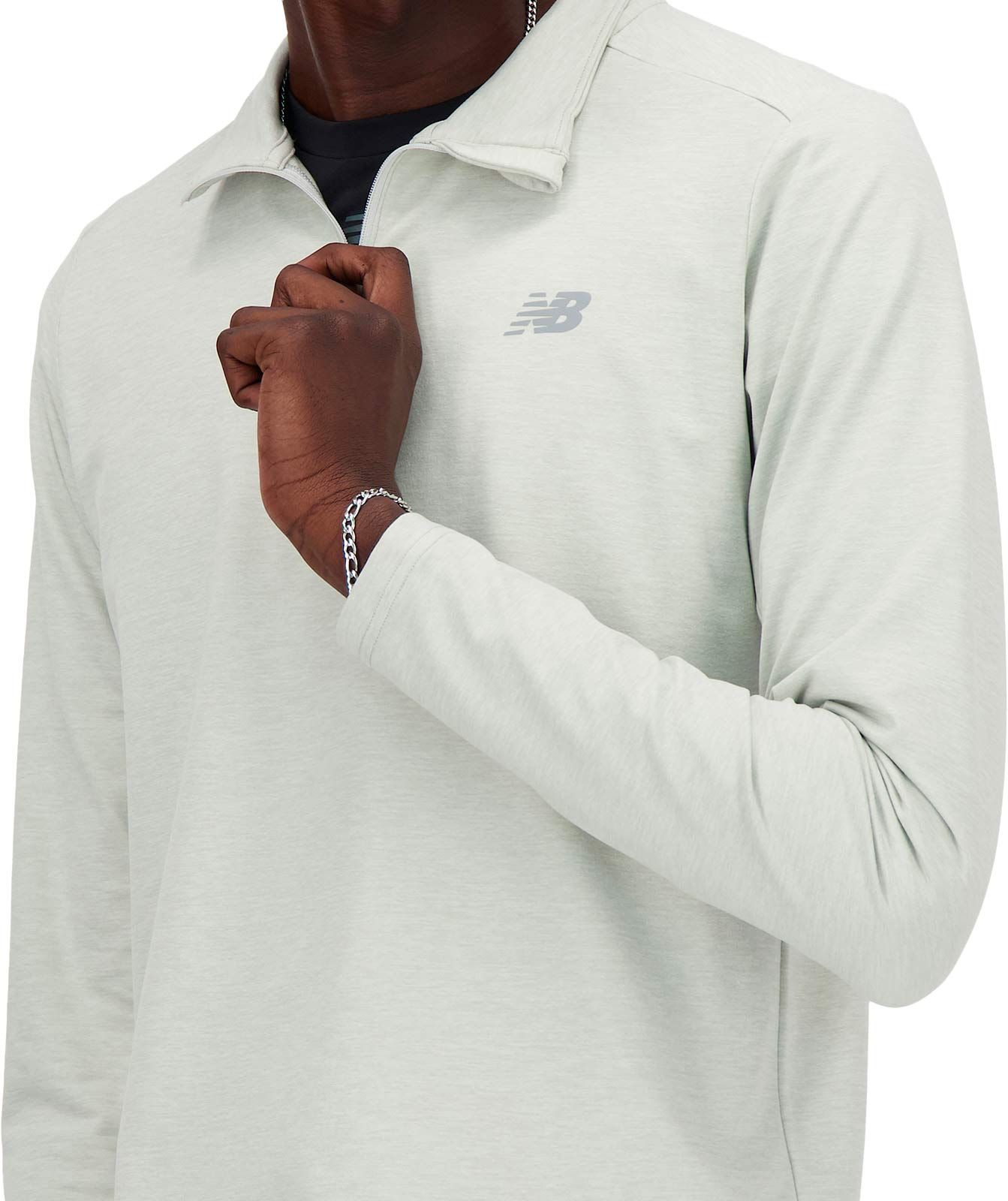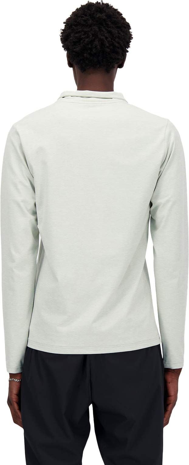 T-shirt à manches longues New Balance Space Dye 1/4 Zip Athletic Grey homme, séchage rapide, col 1/4 zip et passe-pouces pour le trail running par temps frais.