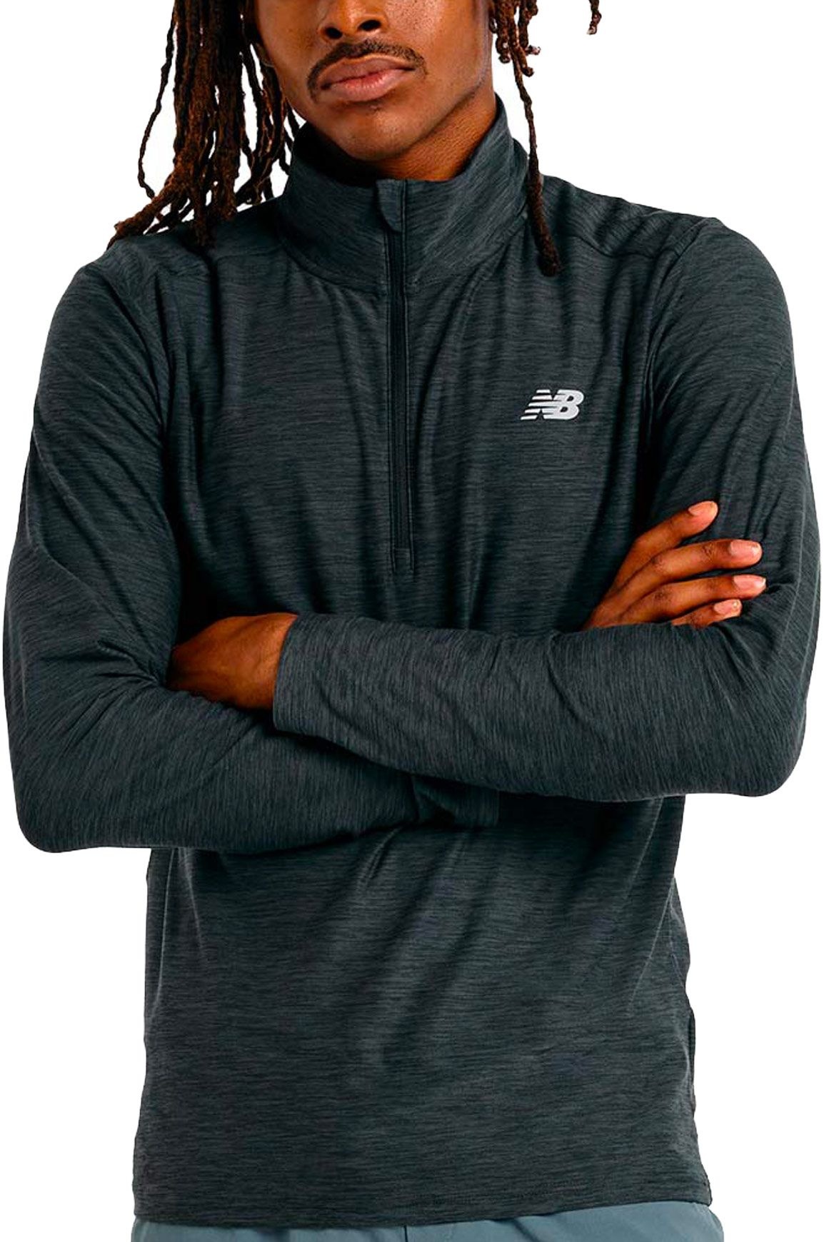 T-shirt à manches longues New Balance Space Dye 1/4 Zip Black Heather homme, conçu pour le running par temps frais. Tissu technique séchage rapide, col 1/4 zip et passe-pouces pour maintien et aération.