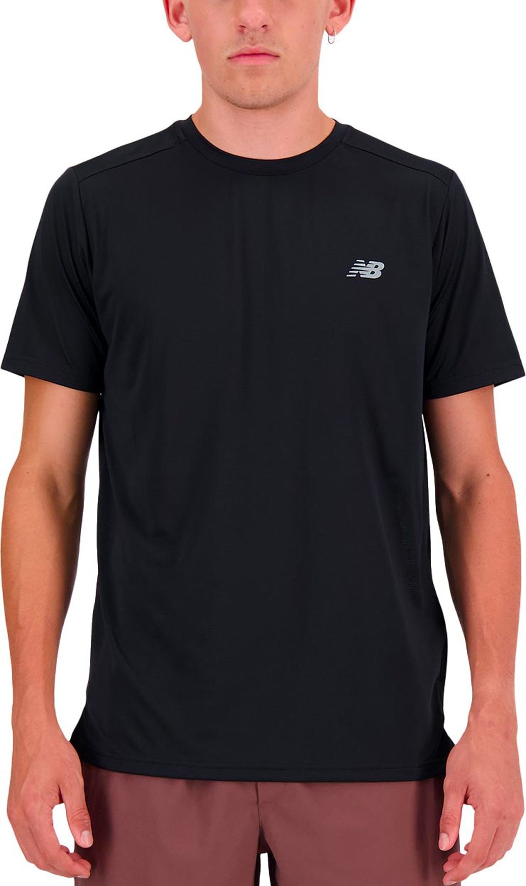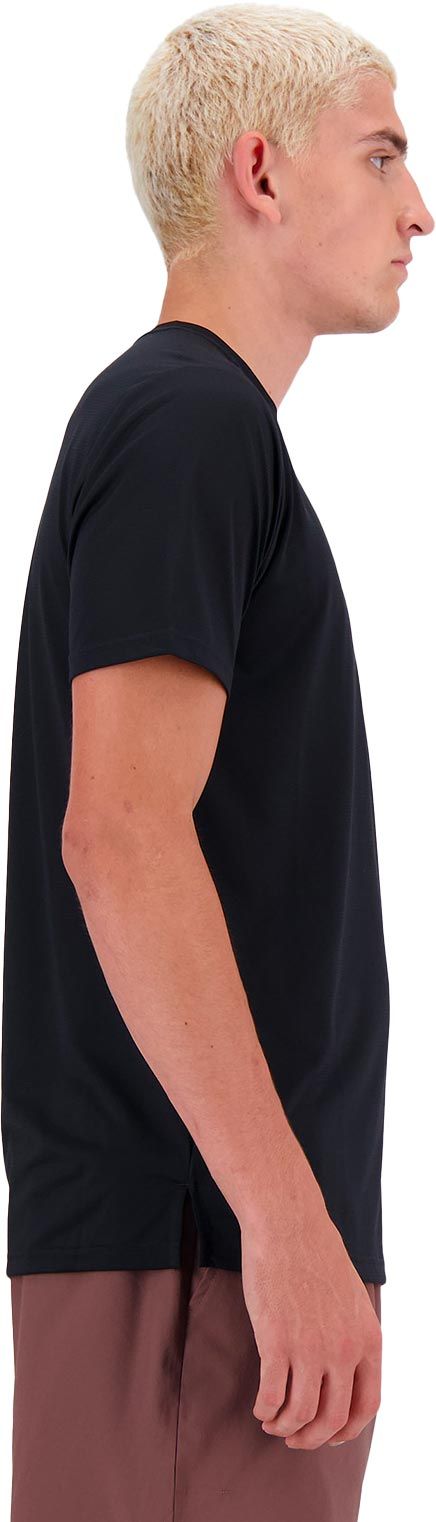 T-shirt à manches courtes New Balance Sports Essentials Black homme, conçu pour les efforts intenses. Tissu technique à séchage rapide évacuant la transpiration, fentes latérales pour la liberté de mouvement, logo NB discret.