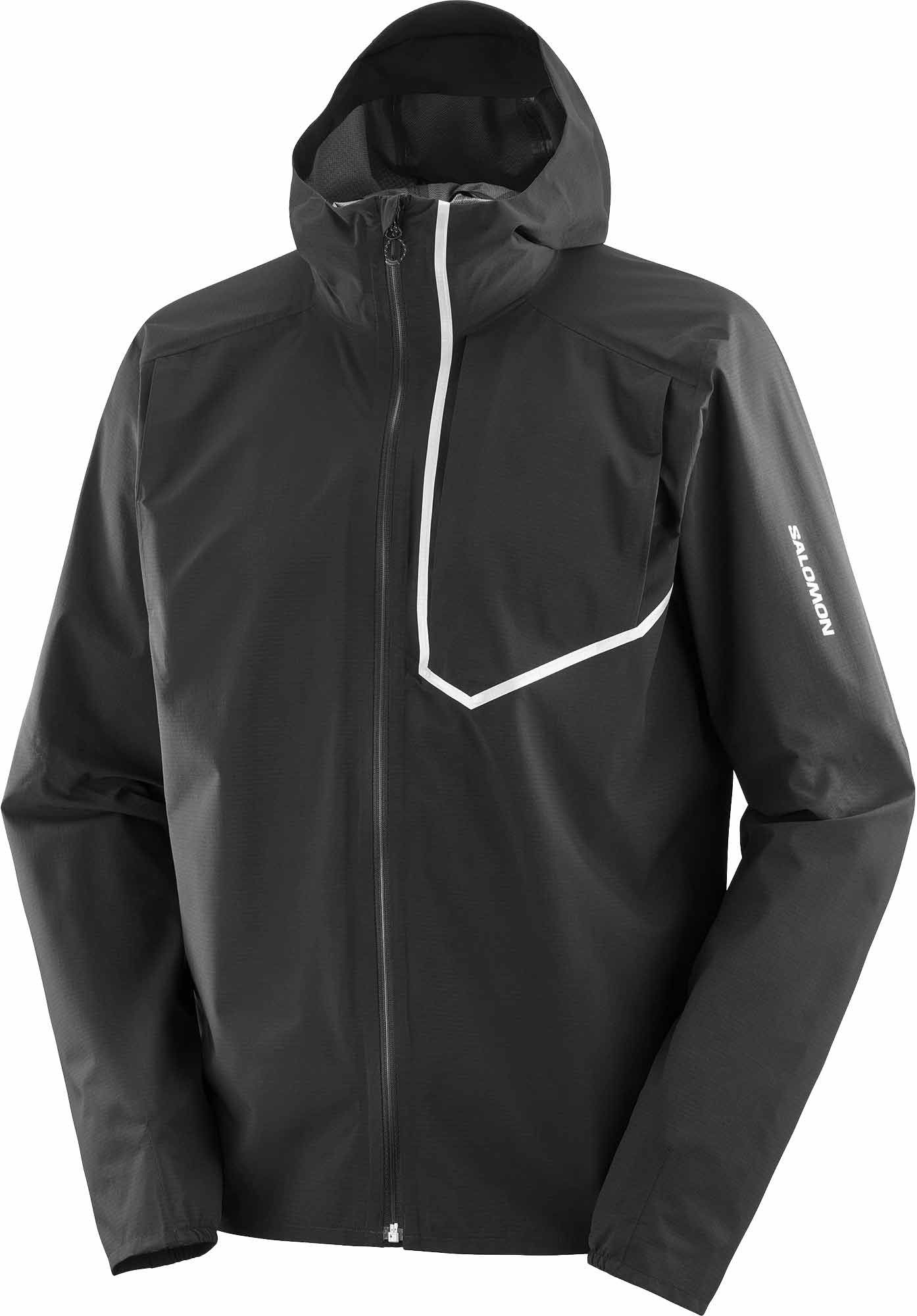 La veste Salomon Bonatti Trail Jacket Deep Black pour homme, en Pertex® Shield, allie légèreté, imperméabilité et respirabilité pour le trail running technique. Coupe ergonomique, capuche englobante et dos allongé compatibles sac 12 L.