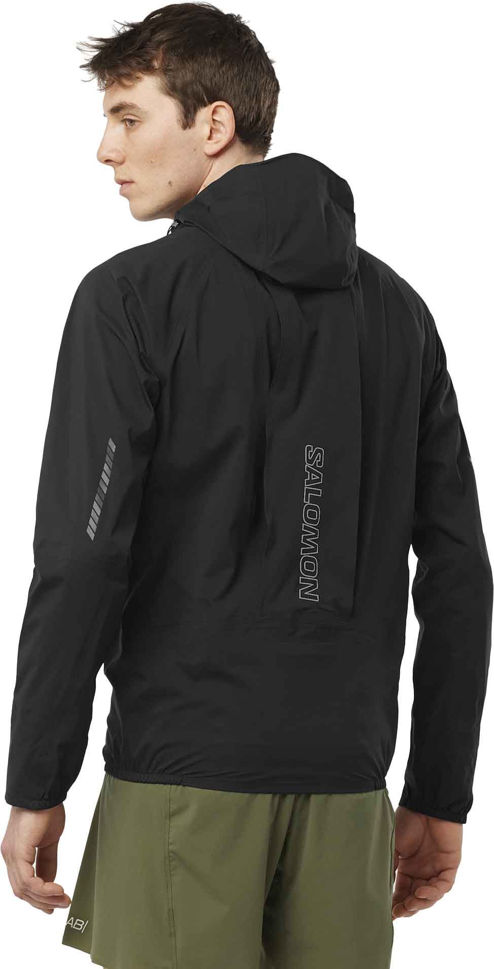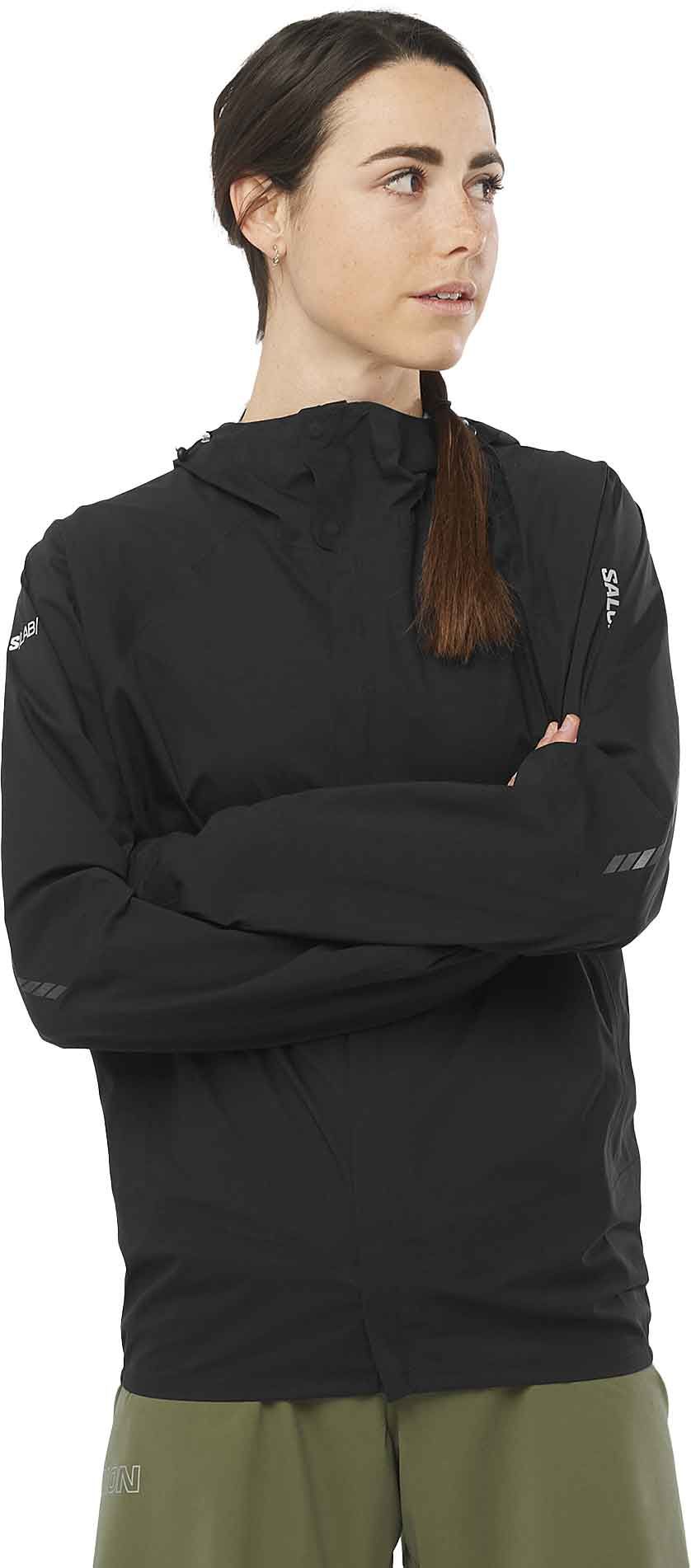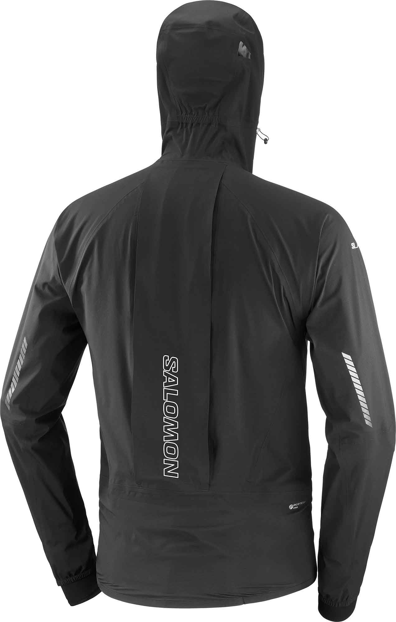 Veste de course Salomon S/Lab Ultra Jkt Deep Black, 3 couches imperméable, coupe-vent et respirante, coupe ajustée stretch, capuche Smart Hood minimaliste, poches pratiques et détails réfléchissants.