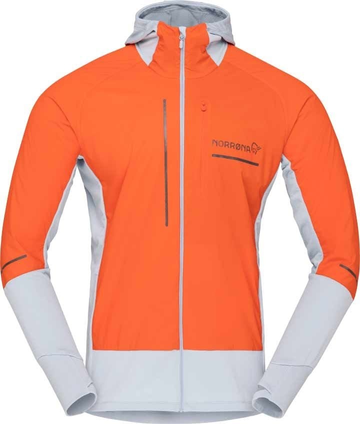 Veste intermédiaire Norrona Senja Alpha90 Zip Hood Adrenalin Red pour homme, hybride trail running. Polartec Alpha 90 et PowerGrid respirants, coupe-vent localisé, capuche casque-compatible, dos allongé.