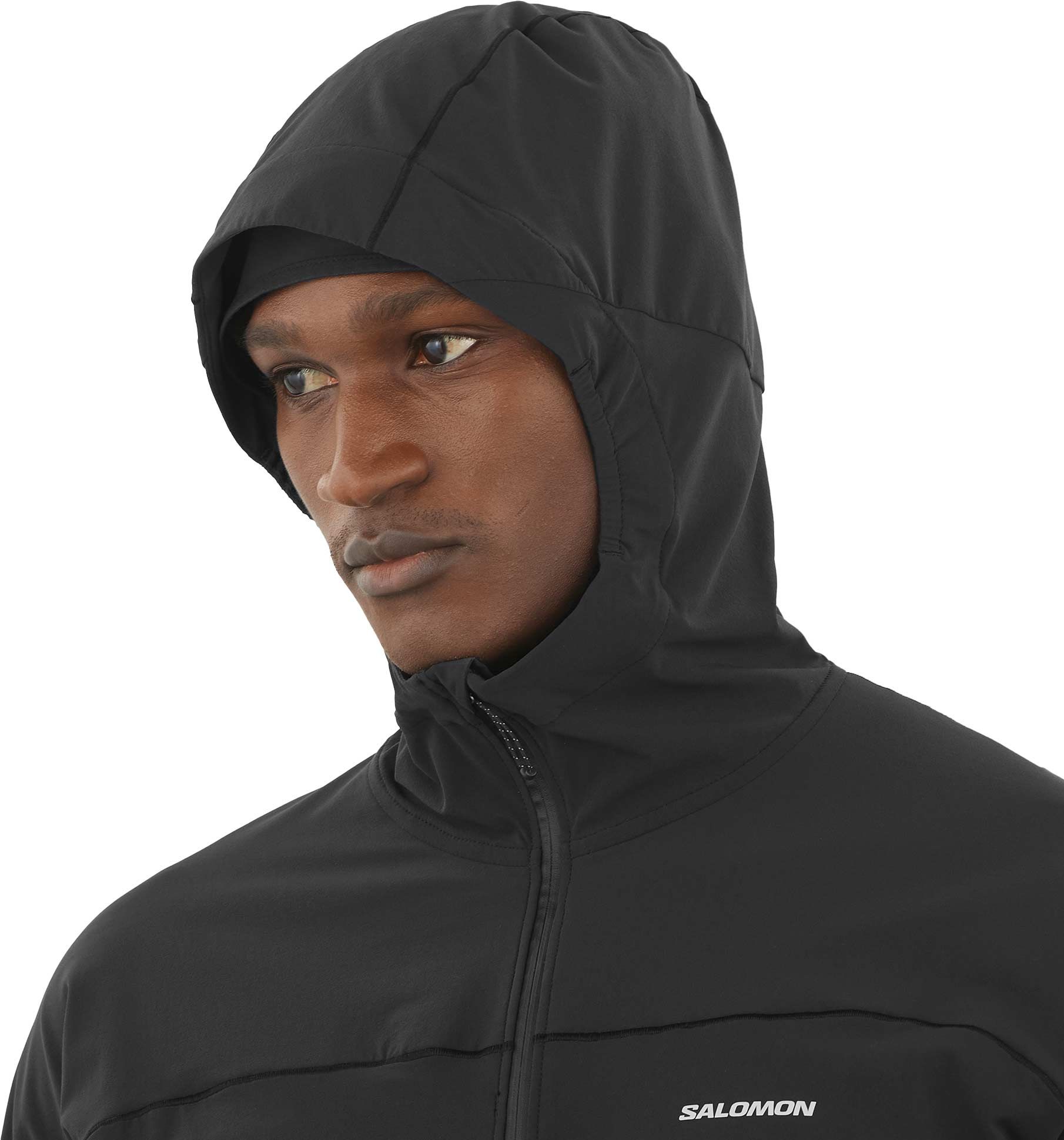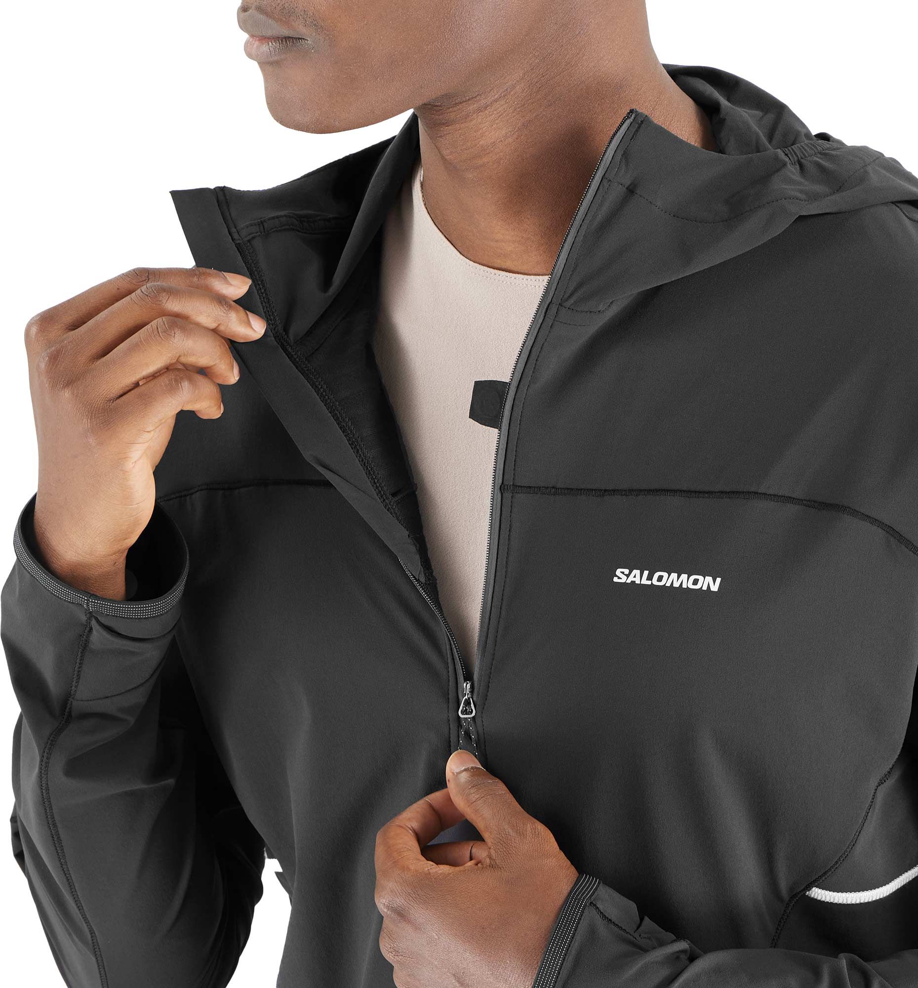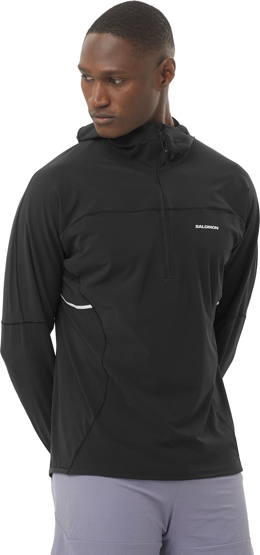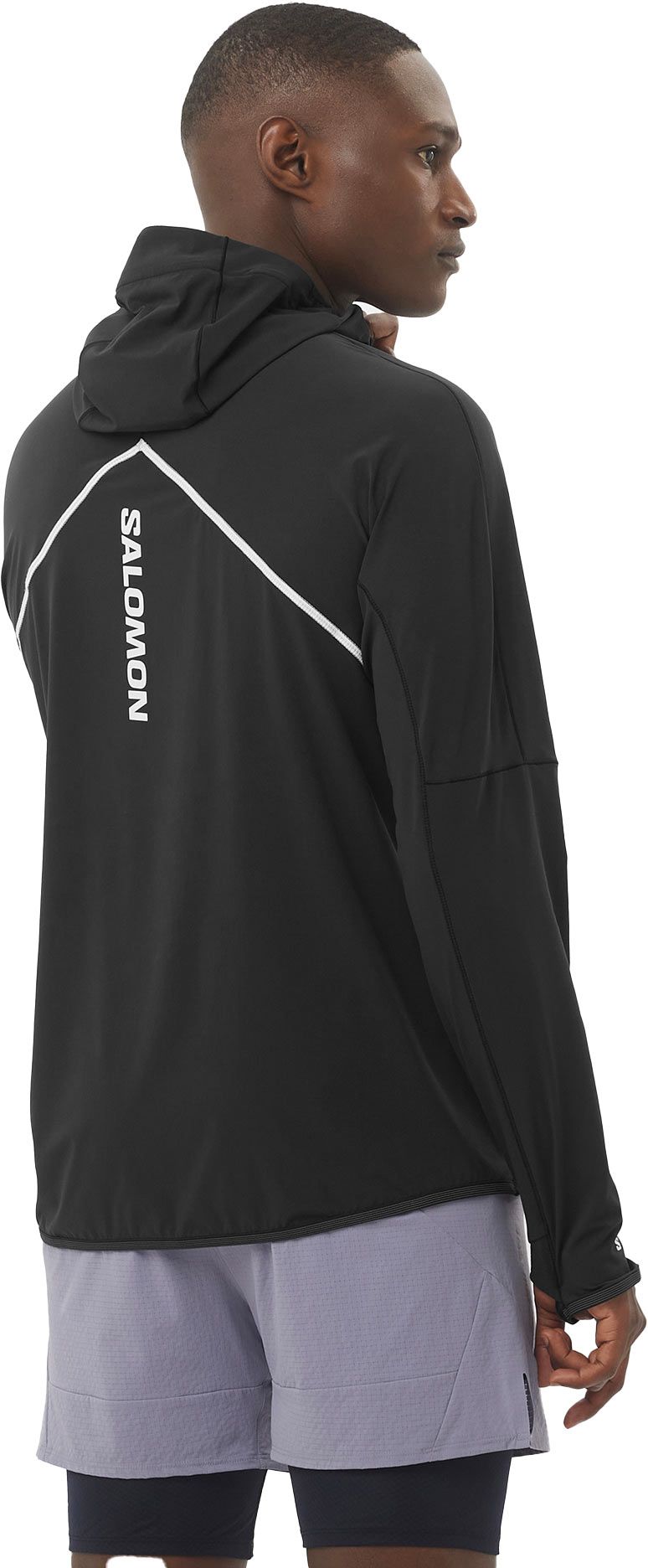La veste Salomon Sense Aero Hybrid HZ HD Deep Black pour homme protège du vent, déperle et régule la chaleur grâce à sa construction zonale, sa ventilation intelligente, sa capuche fixe élastique, sa fermeture demi-zip et ses passe-pouces.