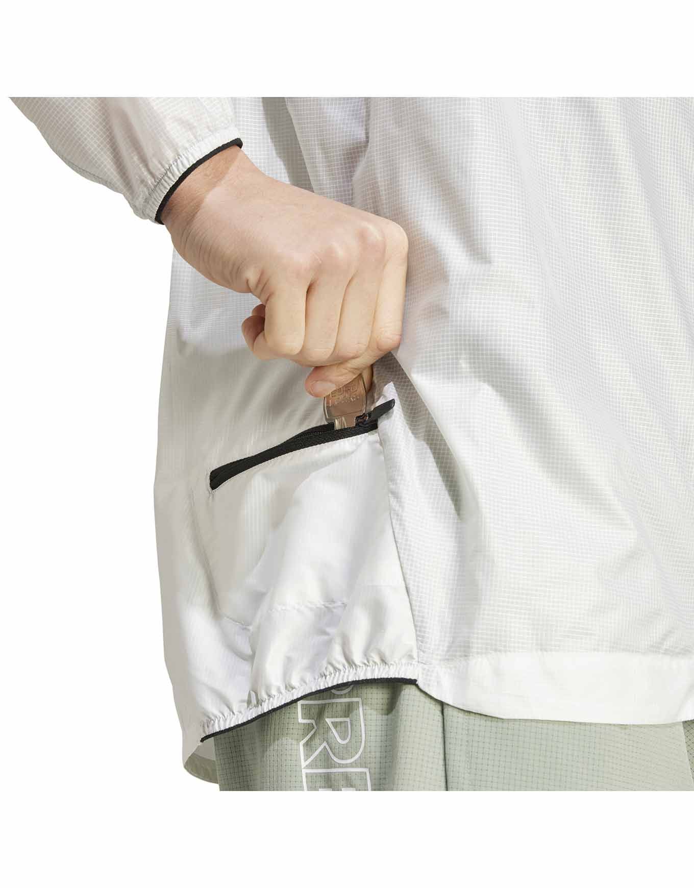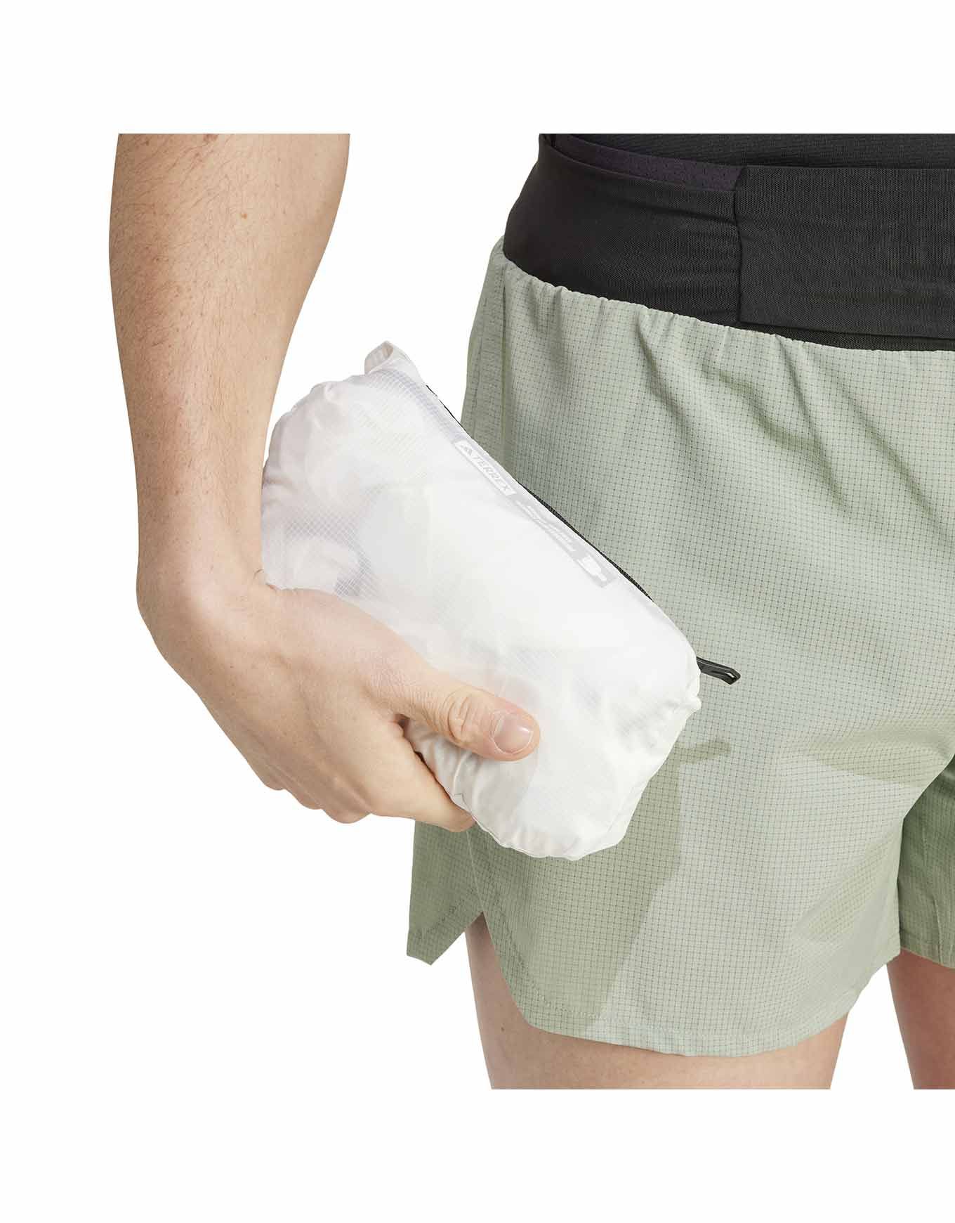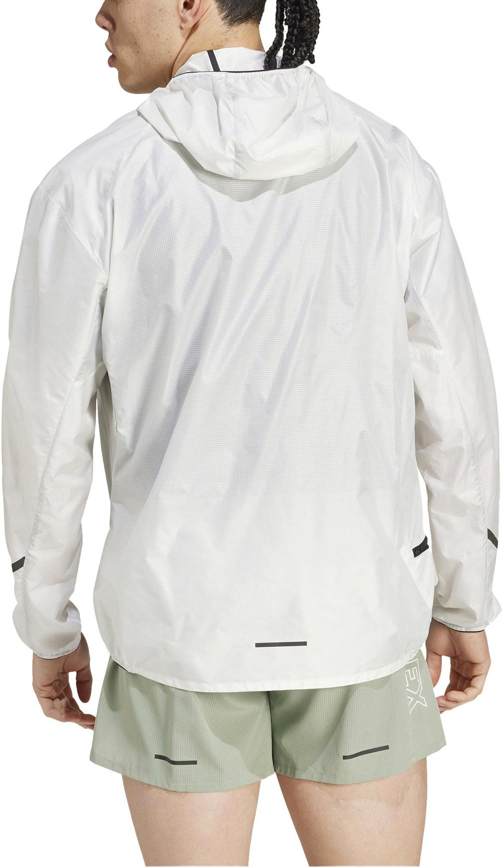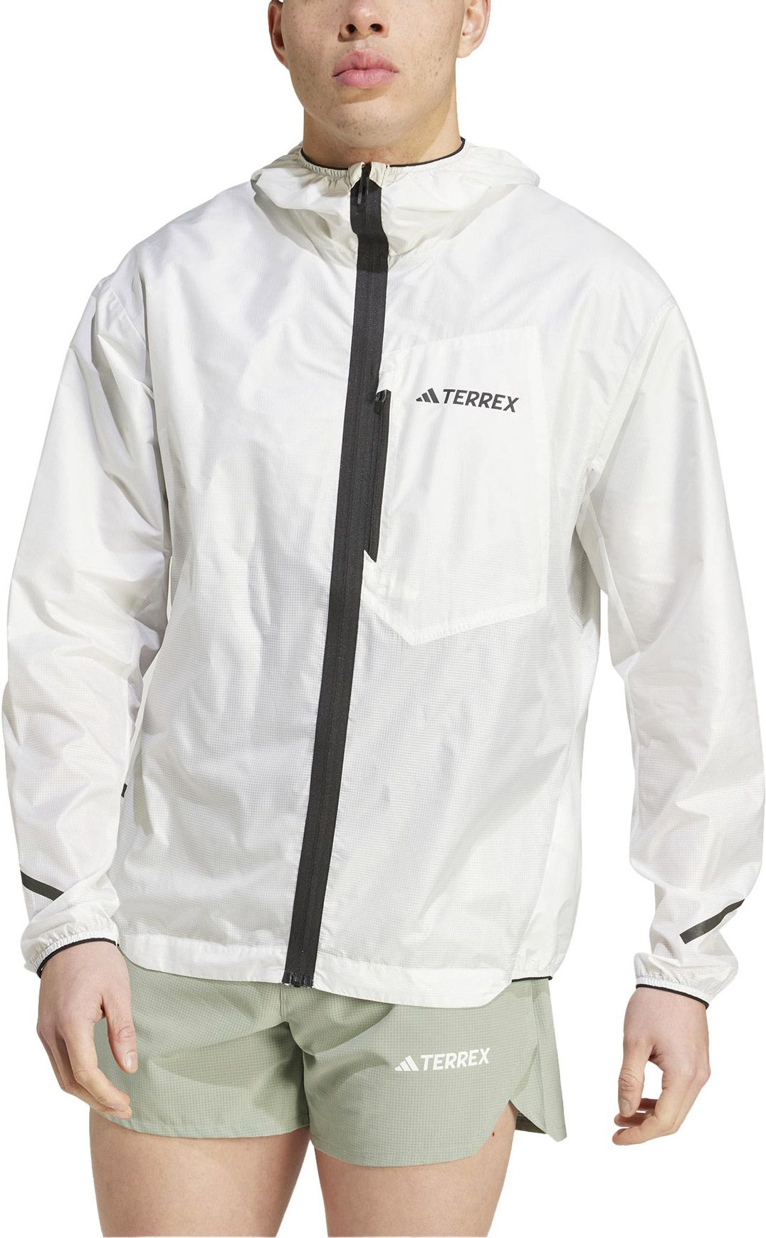 Veste trail running Adidas Terrex Xperior Light Windweave Non-Dyed pour homme : tissu déperlant coupe-vent, respirant et compressible dans la poche poitrine, capuche ajustée et aérations poignées.