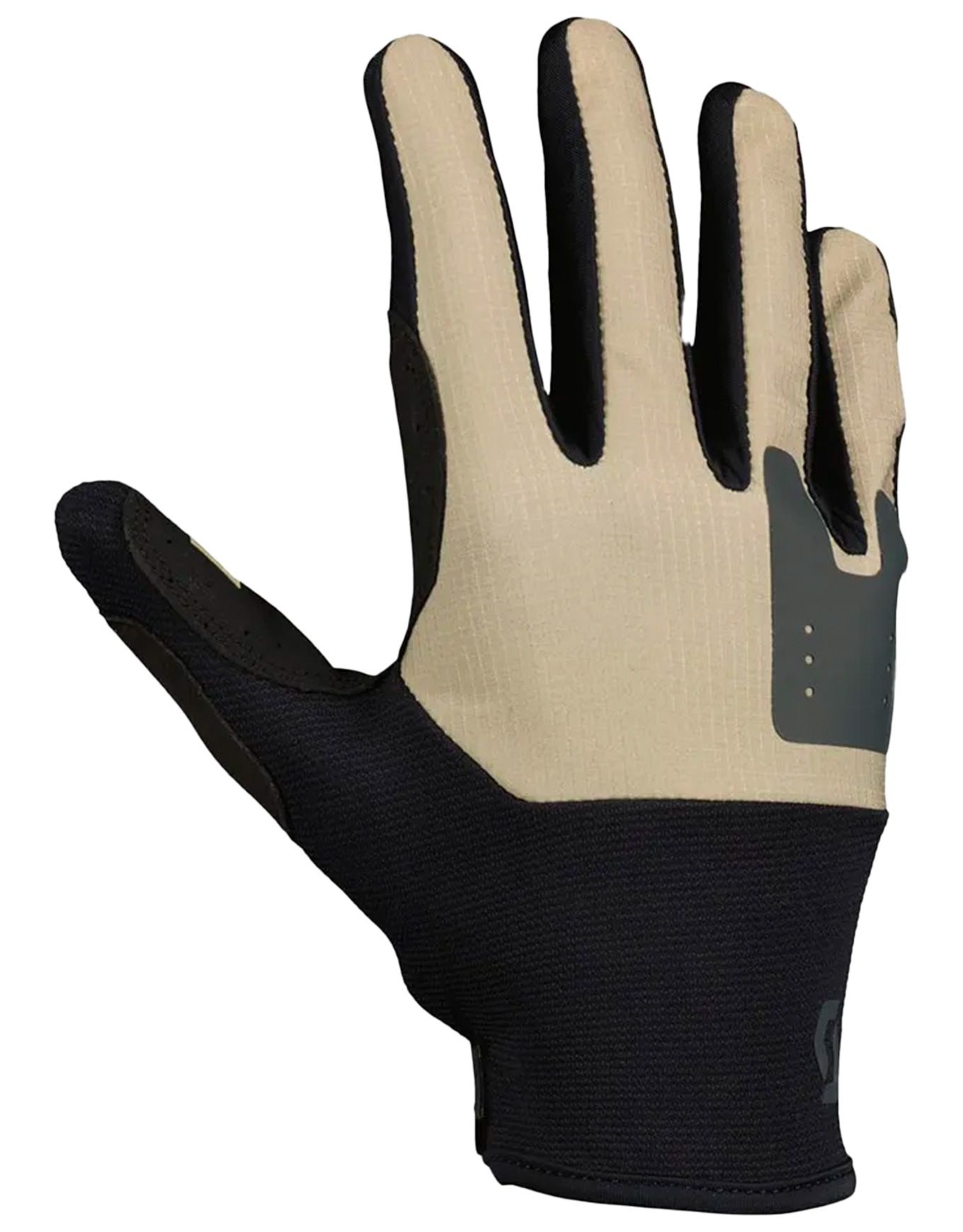 Gants VTT Scott Enduro LF Toast Beige/Black, unisexes, tissu ripstop, renforts phalanges, paume perforée, grip silicone, fermeture velcro, compatibles écrans tactiles.