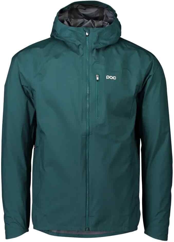 La veste POC Motion Rain Dioptase Blue pour homme protège du mauvais temps par nylon 3 couches imperméable, Ripstop respirant, capuche casque compatible et détails réfléchissants.