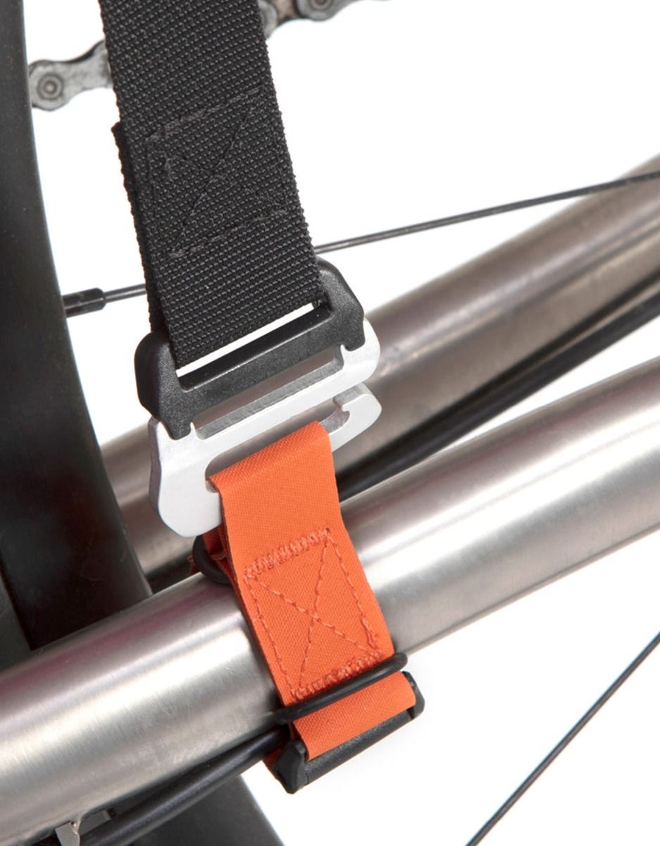Sa conception en nylon recouvert de TPU assure solidité et rapidité d’installation. L’ajustement aux géométries de cadre variées est assuré par des points d’ancrage modulables, complétés par deux sangles de maintien et une bande longitudinale permettant d’immobiliser la roue avant.