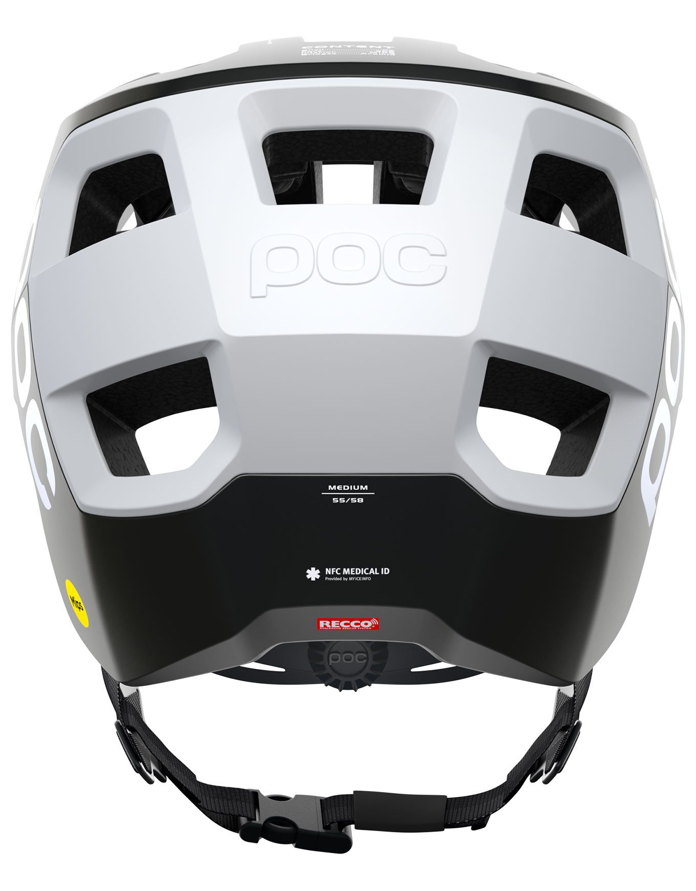 Casque VTT POC Kortal Race MIPS Uranium Black Matt/Hydrogen White, conçu pour l’enduro : construction In-Mold polycarbonate, doublure EPS renforcée, technologie MIPS, ventilation optimale même avec masque, réglage 360° et sécurité RECCO/twICEme.