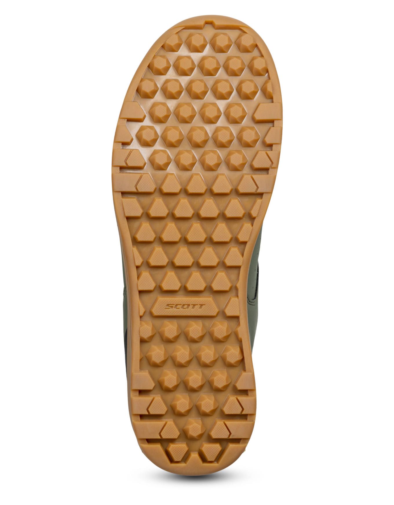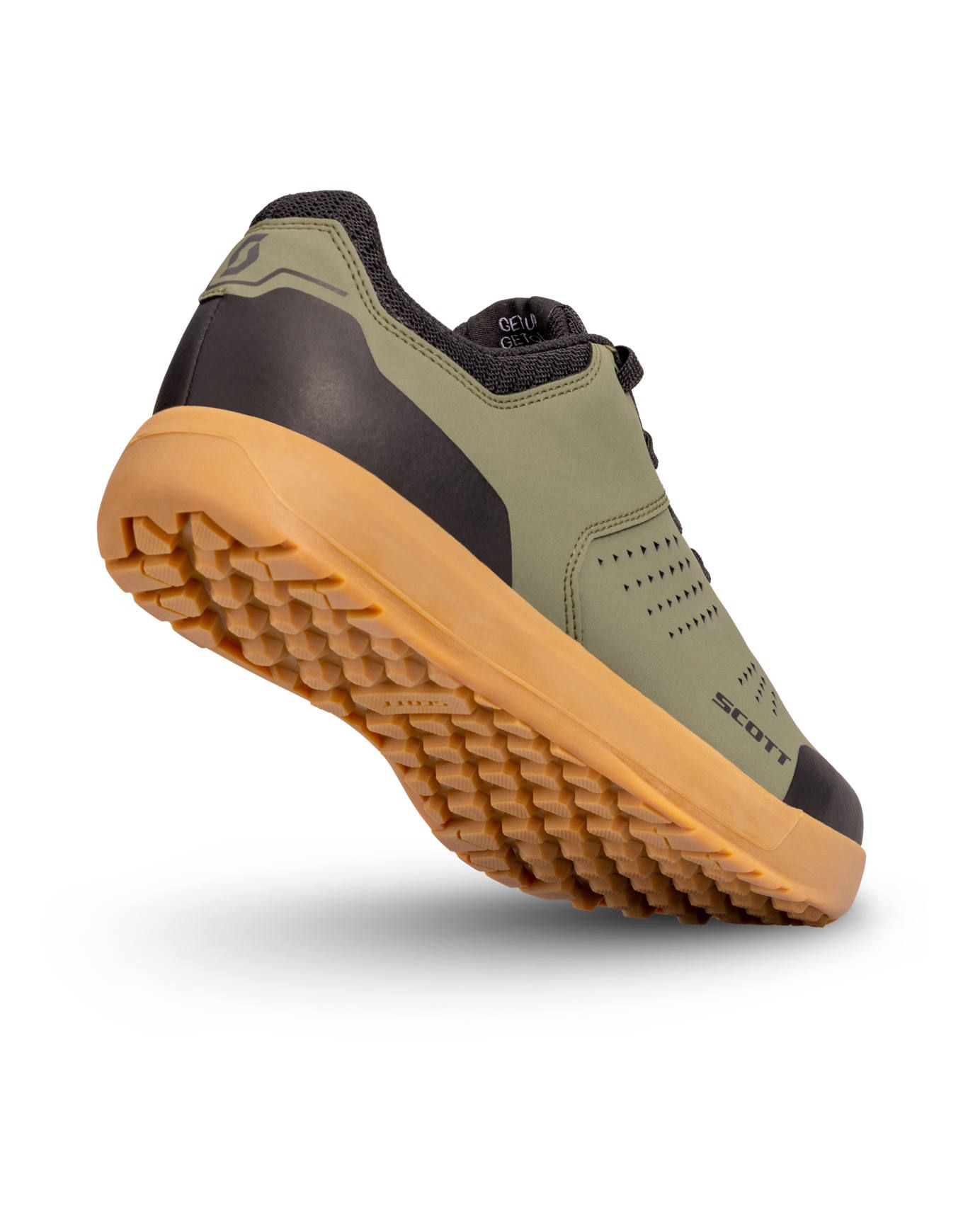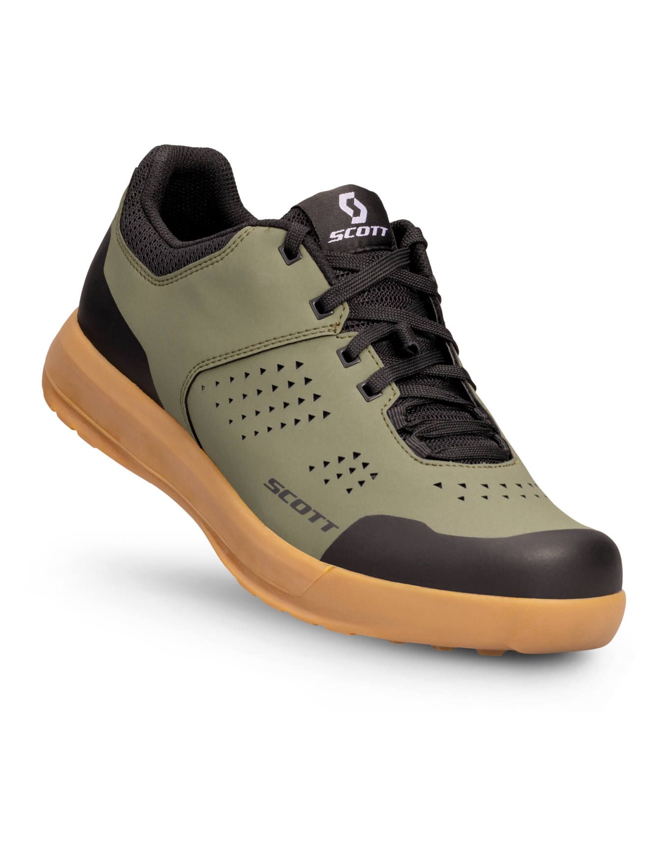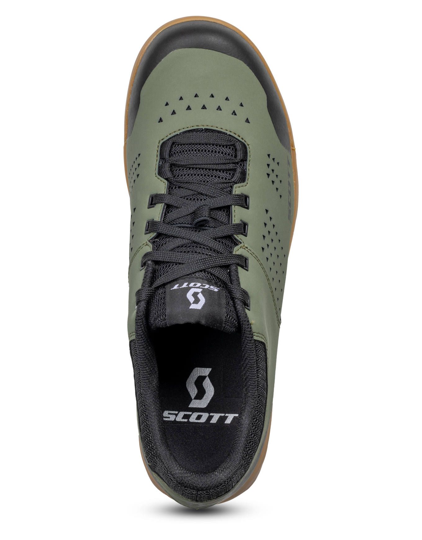 Chaussures VTT Scott Mtb Shr-Alp Flat Lace Moss Green/Black, conçues pour les pédales plates, offrent traction Sticki, maintien ErgoLogic et laçage polyvalent ville/trail.