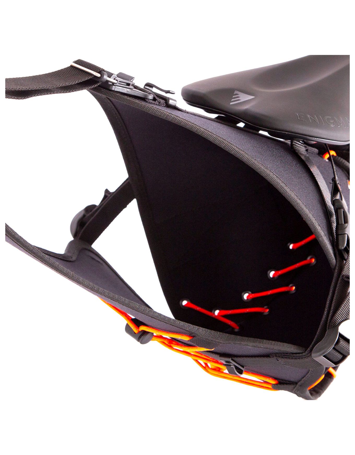 Sacoche de selle Restrap Saddle Bag Orange 14L + Dry Bag, étanche et sans fixation sur porte-bagages, s’installe en un instant par sangle et clips, base rigide anti-balancement, boucle réfléchie pour lampe arrière et cordon de compression.