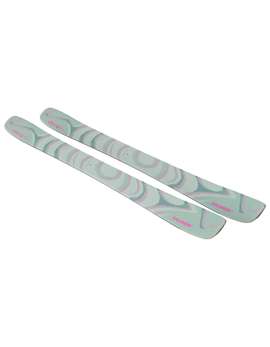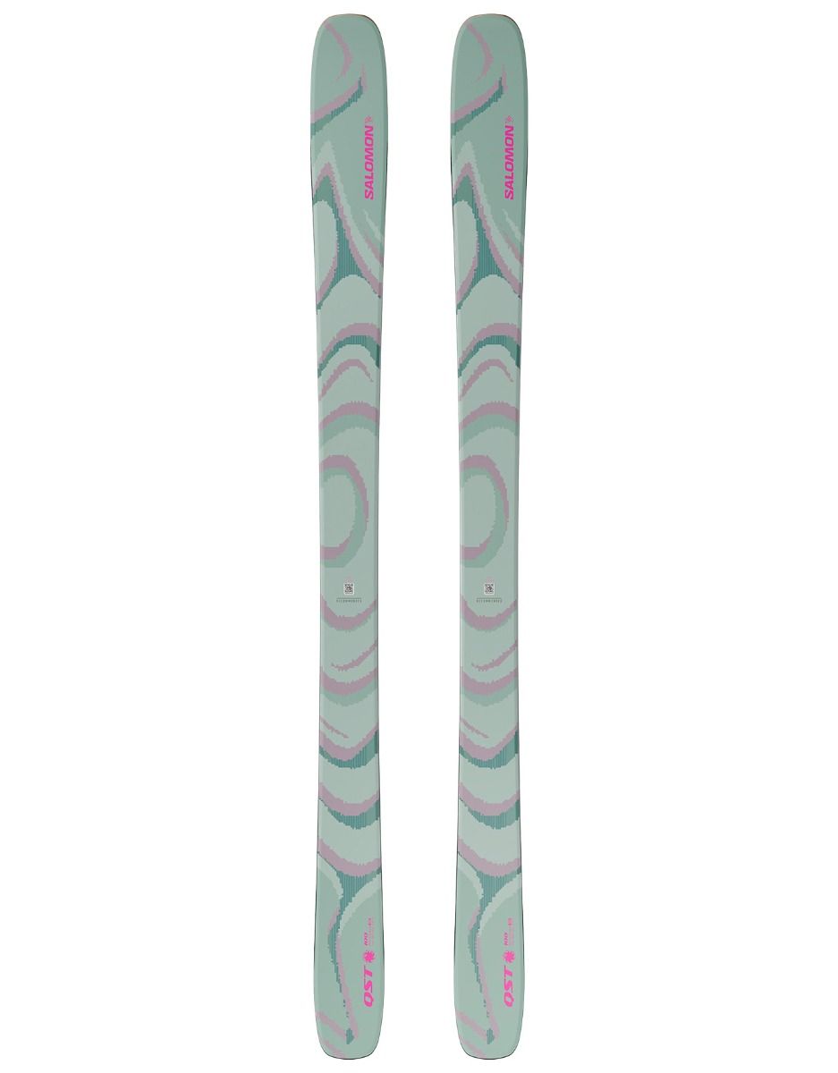 Le ski Salomon QST 100 2026 Iceberg Green/Nirvana, freeride/all-mountain 100 mm au patin, allie cambre sous le pied et double rocker pour maîtrise en poudreuse et confort sur neuvre dure. Noyau bois, carbone C/FX et lin absorbent les vibrations, offrant stabilité et légèreté aux skieurs exigeants.