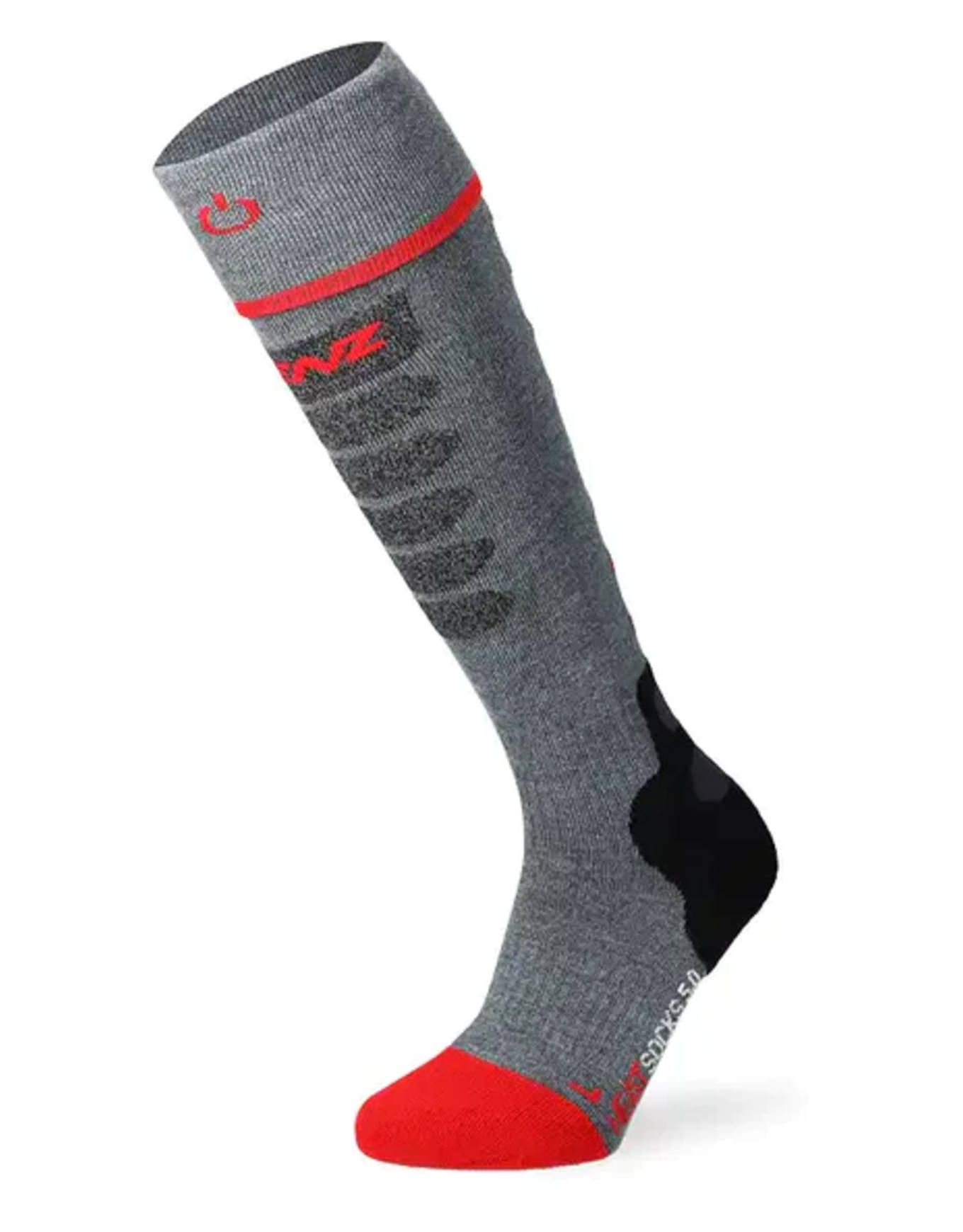 Les chaussettes chauffantes Lenz Heat Sock 5.1 Toe Cap Slim Fit grise/rouge diffusent une chaleur constante pendant 14 h, allient laine mérinos et soie pour l’anti-odeur et l’évacuation de l’humidité, et offrent renforts talons/orteils ainsi que rembourrages tibias/mollets pour un confort durable.