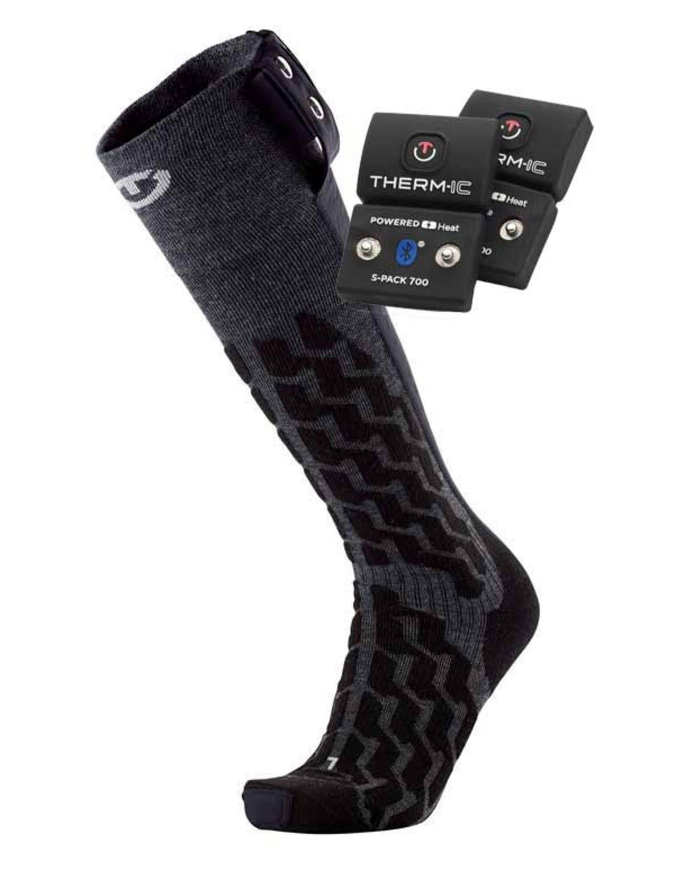 Therm-ic Heat Fusion Uni + S-Pack 700B : chaussettes chauffantes avec deux batteries pour 8 h de chaleur réglable via Bluetooth et évacuation d’humidité optimale.