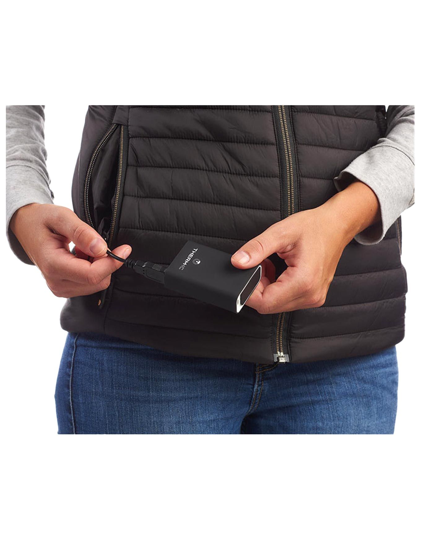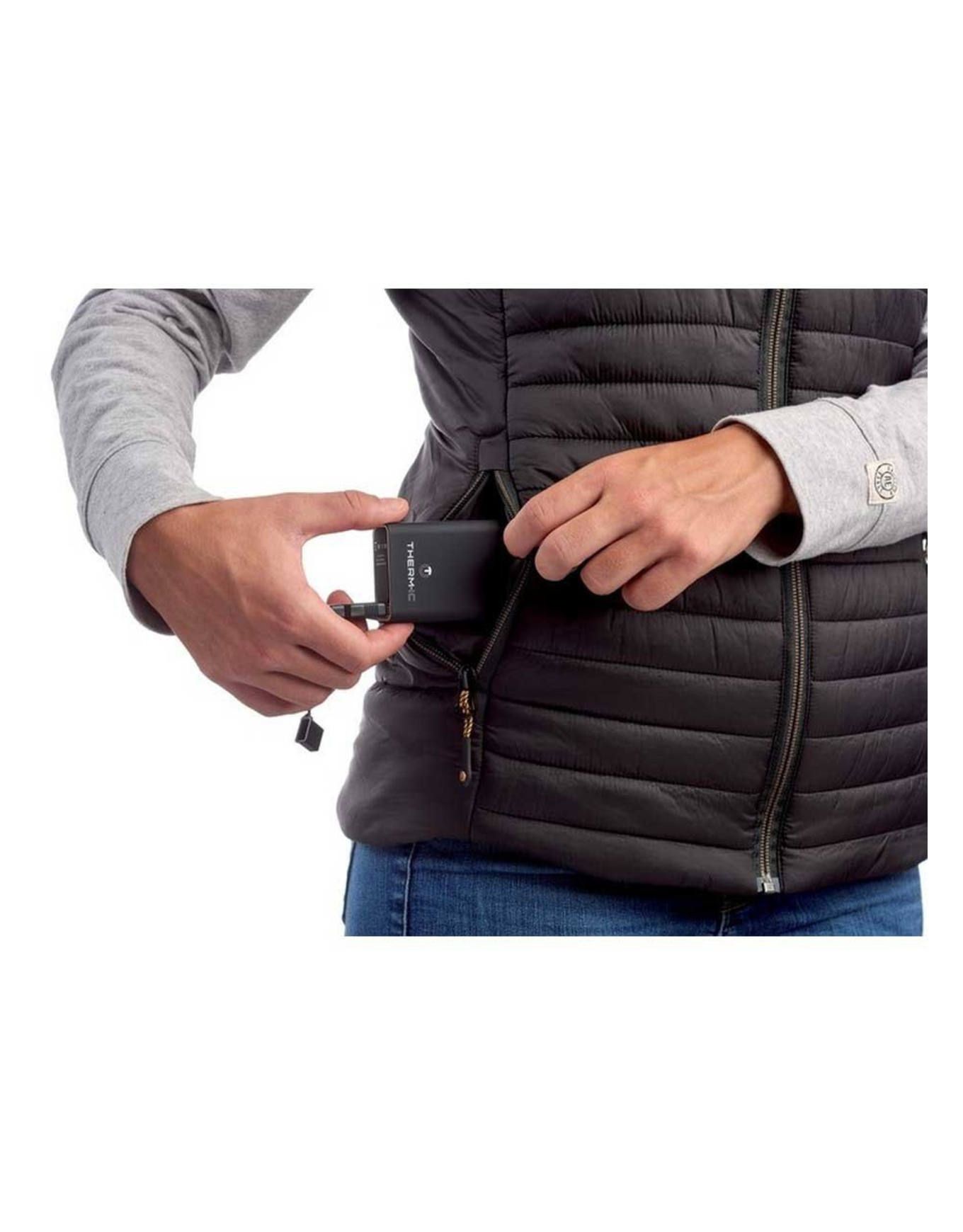 Branchez la batterie externe (non fournie) sur le câble USB logé dans la poche intérieure, puis insérez-la dans la doublure. Toute batterie externe standard convient ; le modèle universel Therm-ic est conseillé. Pour couper la chaleur, déconnectez la batterie. Toujours la débrancher après usage.