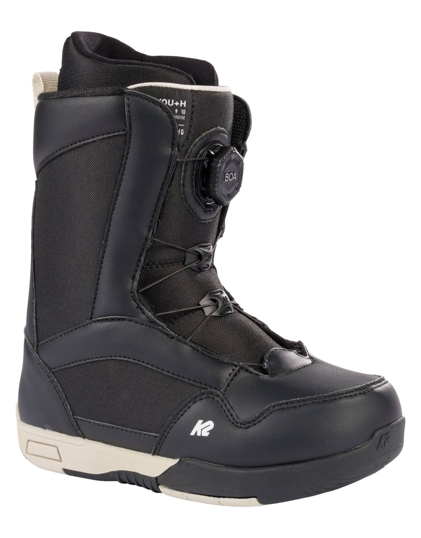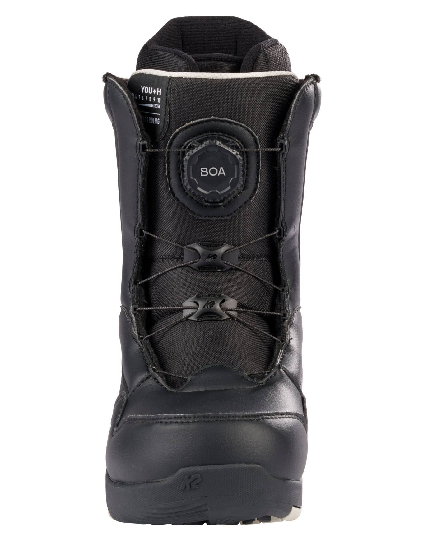 Boots de snowboard enfant K2 Snowboard You+H Black, évolutive par cales amovibles, flex doux et serrage Boa® pour progresser en confiance sur tous les terrains.
