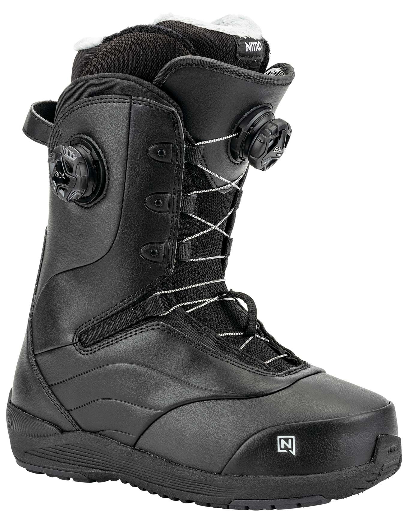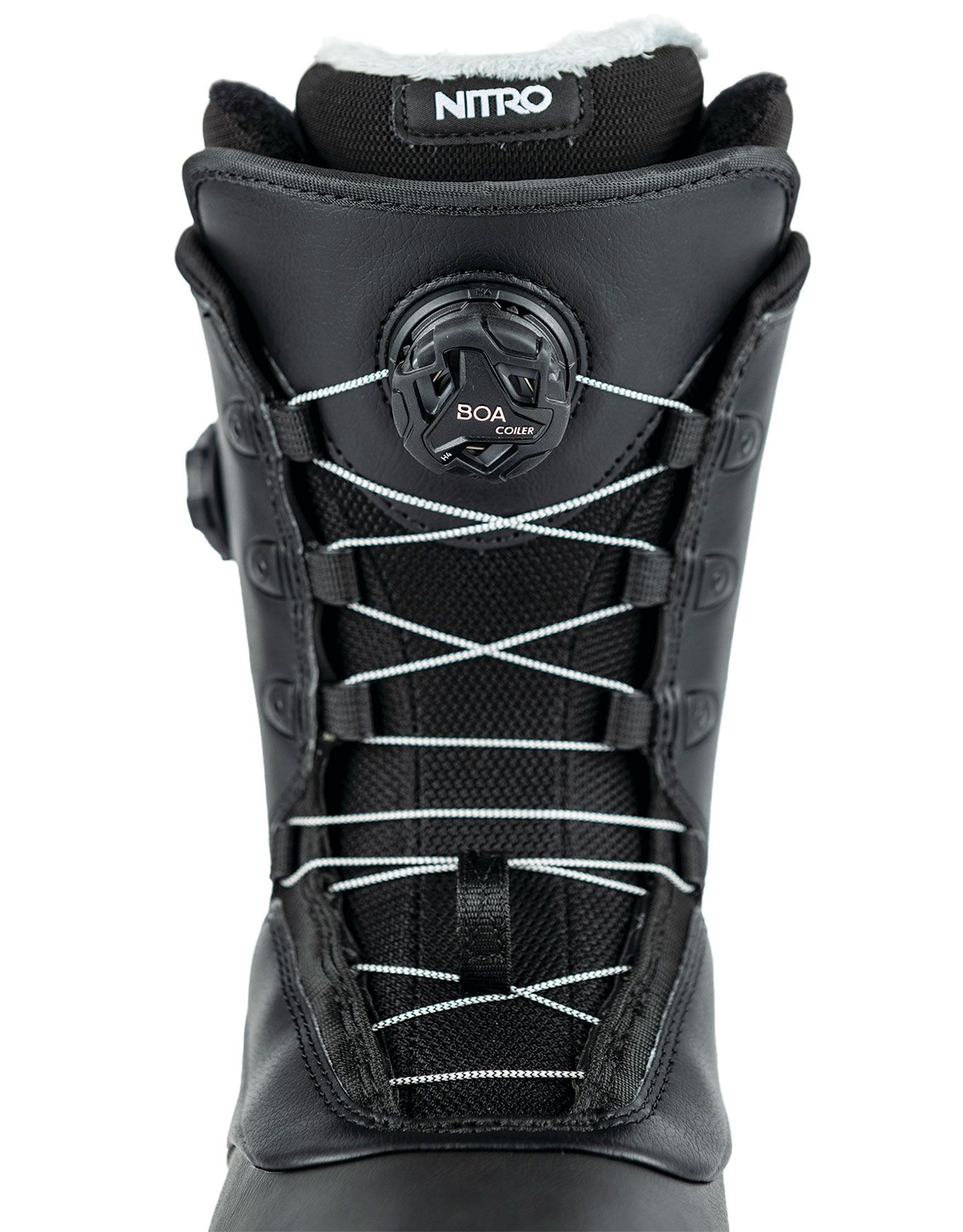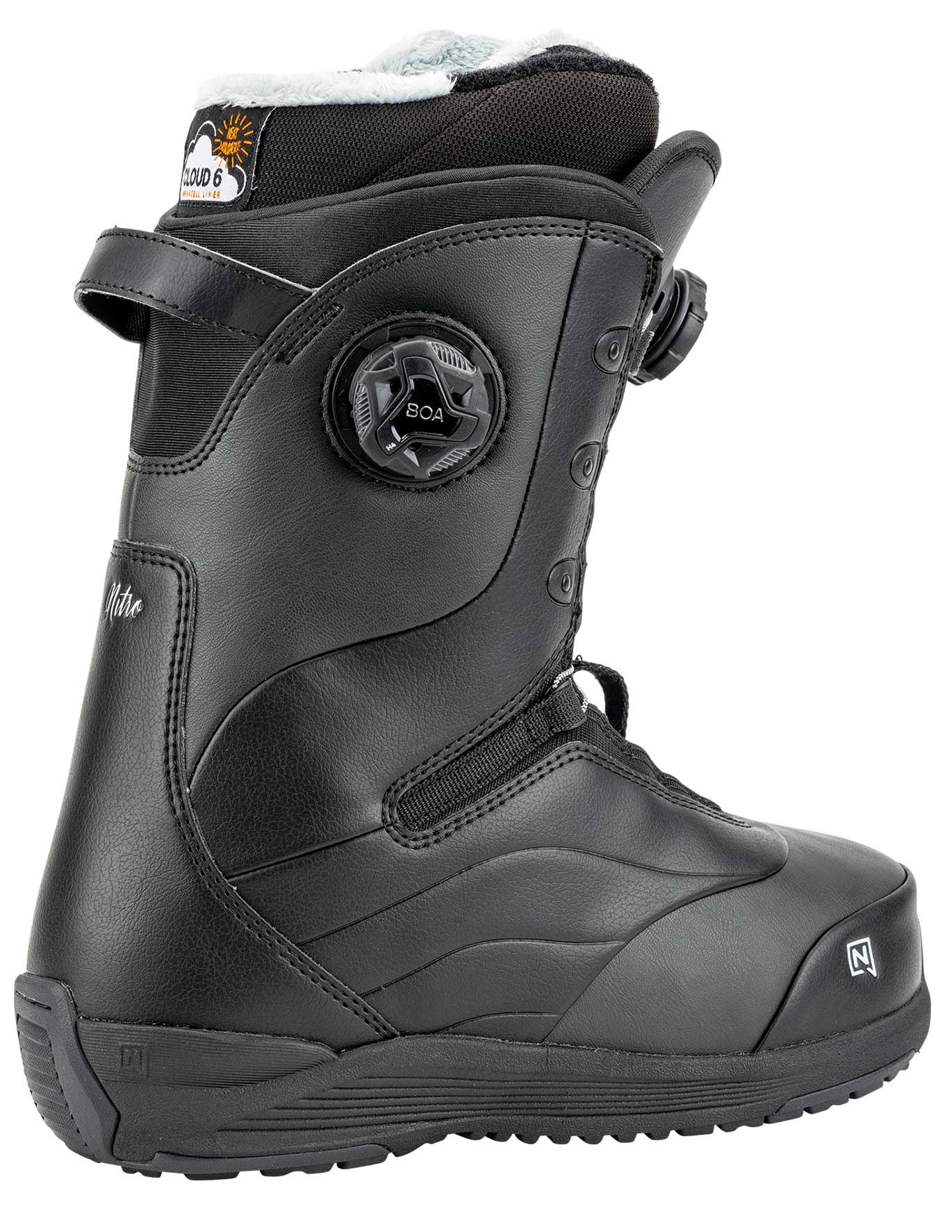 Boots snowboard femme Nitro Crown BOA Black, flex 5/10, serrage Dual Zone BOA et ILS, chausson Cloud 6 : confort et maintien polyvalent all-mountain.