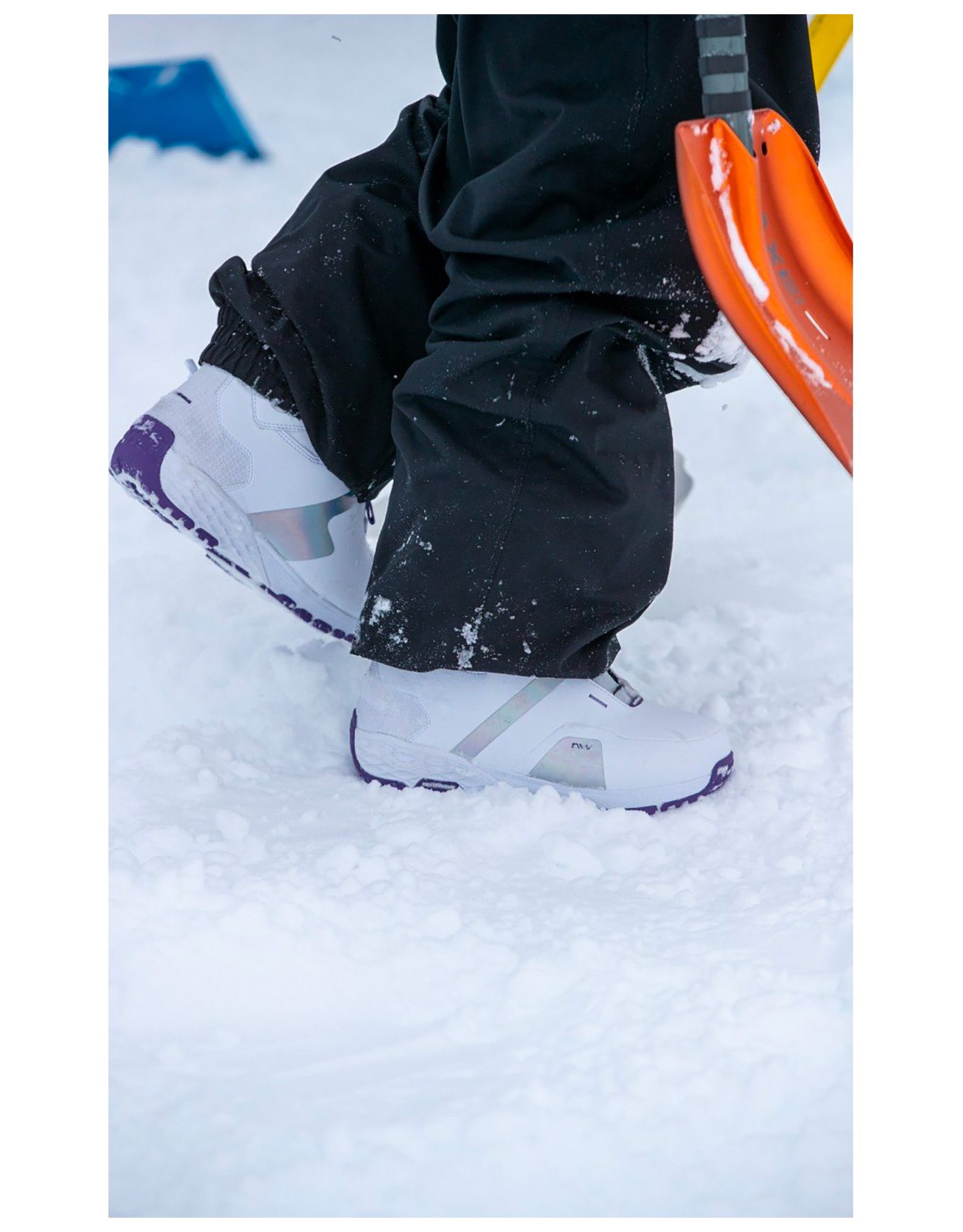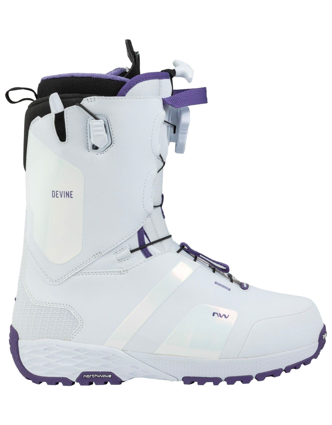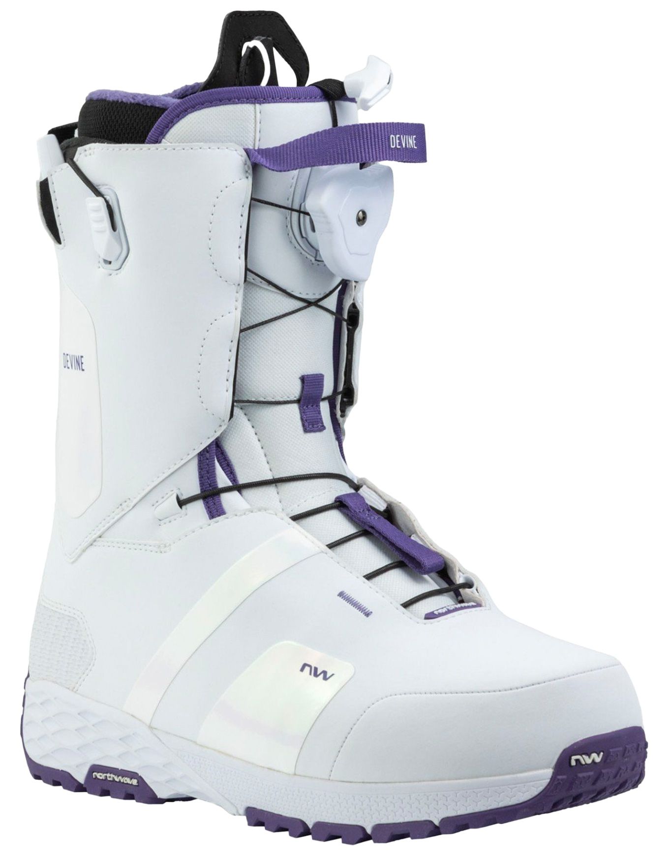 La boot de snowboard all-mountain Northwave Devine Hybrid White conjugue maintien talon verrouillé, laçage hybride ultra-rapide et semelle Stomper amortissante pour les rideuses exigeant réactivité et confort sur tous les terrains.