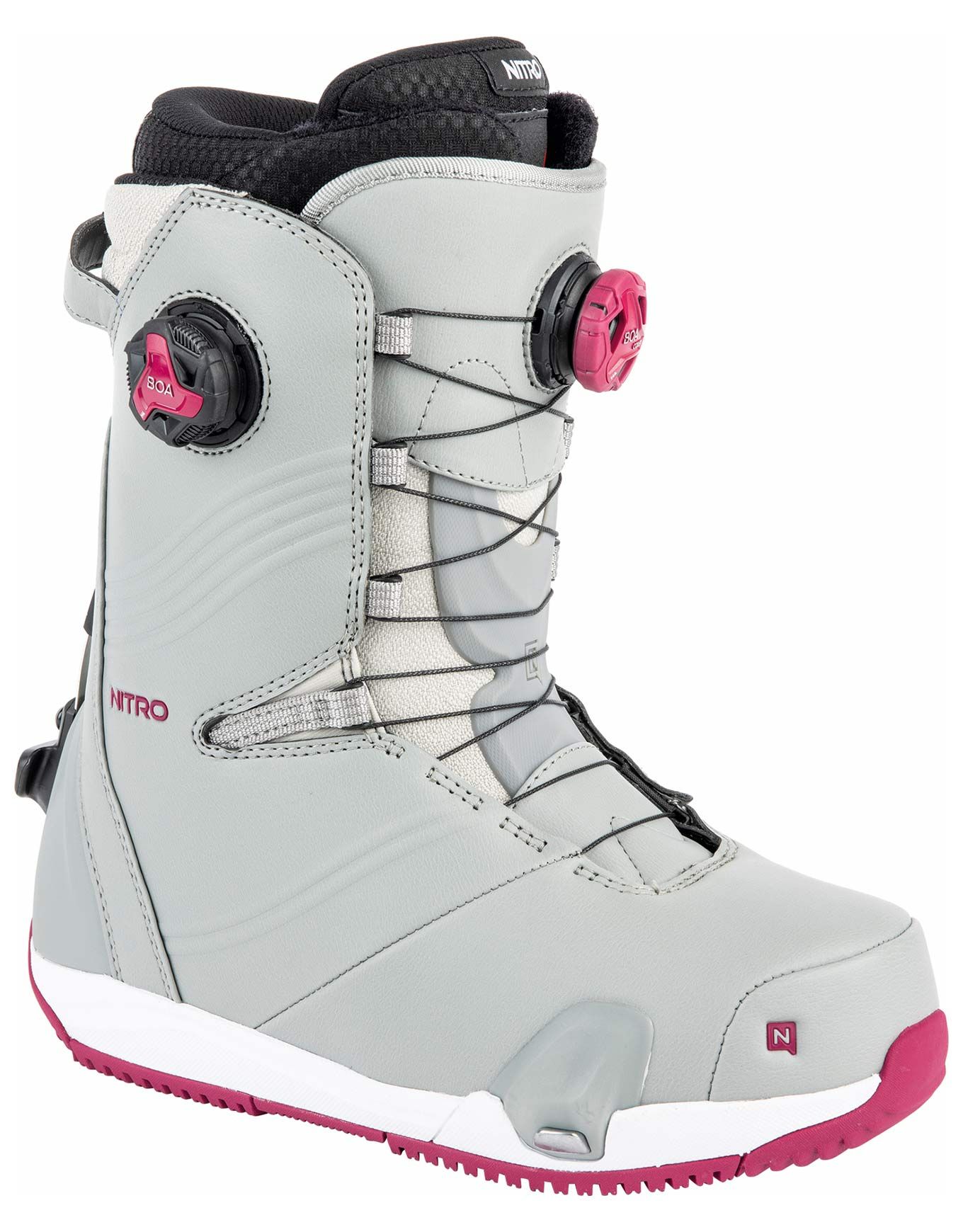Les boots de snowboard Nitro Dynasty Step On Boa pour femme, flex 7/10, combinent système Step On® pour un chaussage debout instantané, serrage Boa millimétrique et chausson thermoformable Cloud 9 pour un soutien réactif et un confort chaud toute la journée.