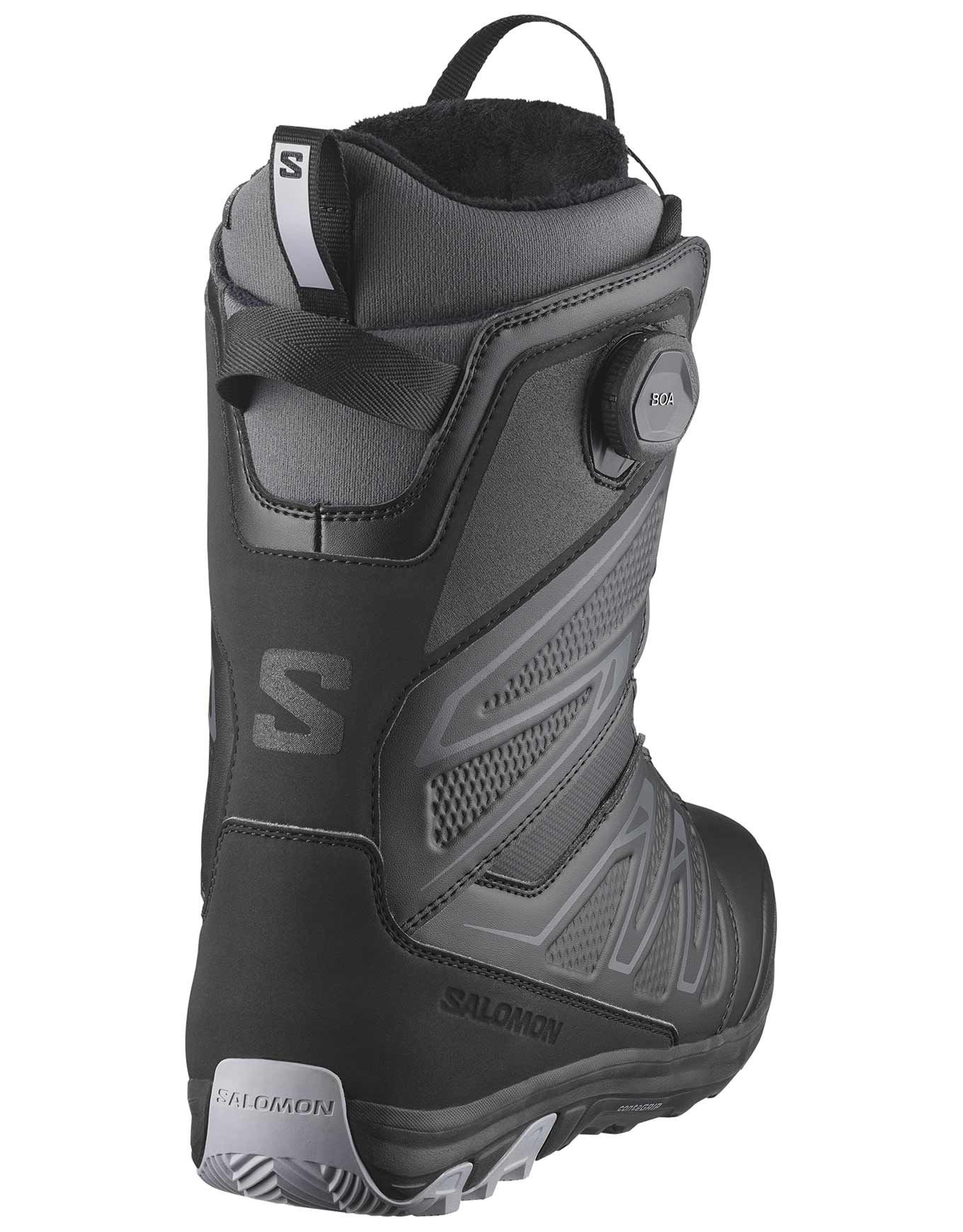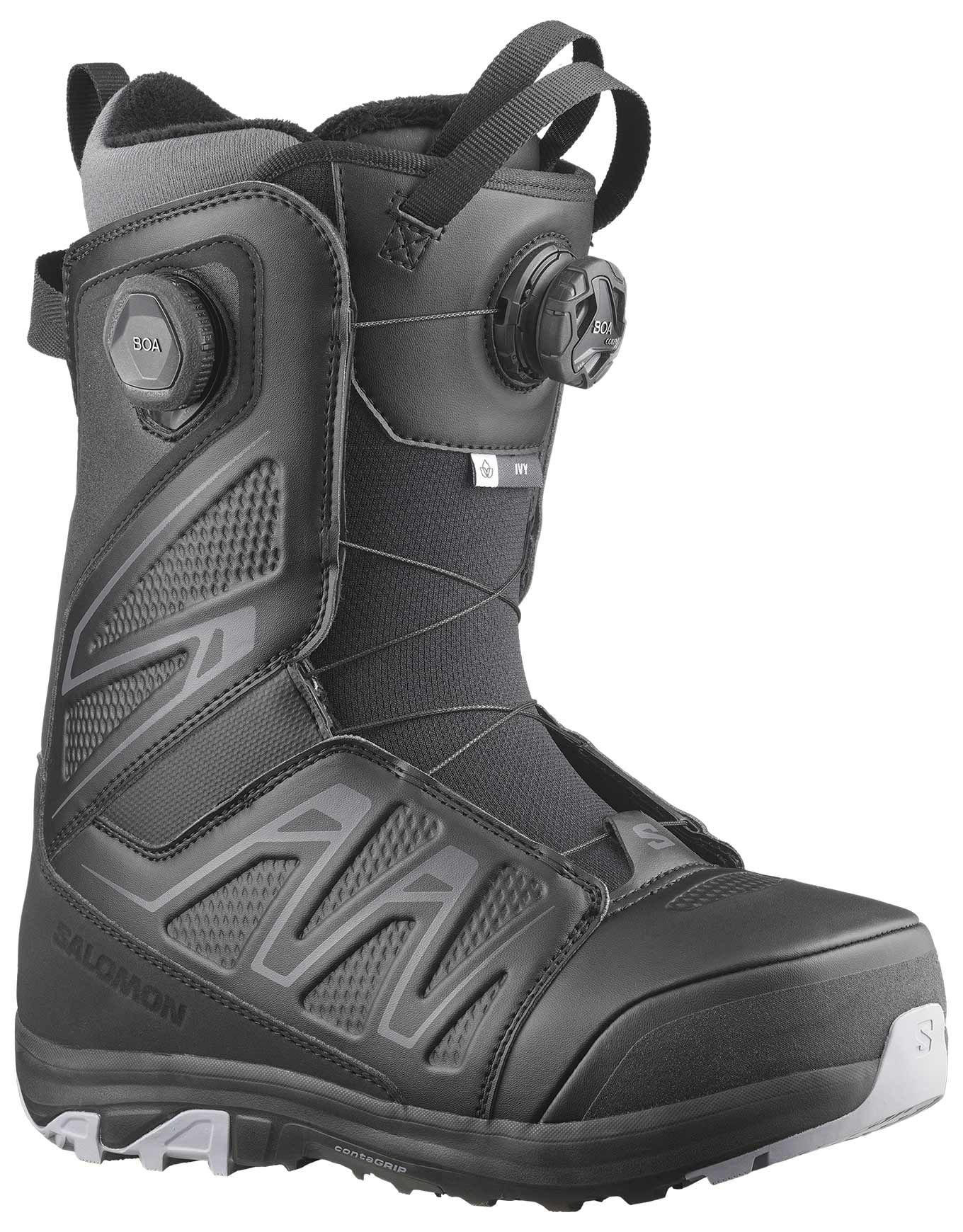 Les chaussures Salomon Ivy Boa SJ Boa Black, boots snowboard femme freestyle, allègent la glisse de 10 % grâce à la construction FTR et au laçage BOA® Coiler™ pour un ajustement rapide et précis, tandis que la mousse multidensité Ultralon et la semelle OrthoLite® C2 offrent un confort personnalisé et durable dès les premières courbes.