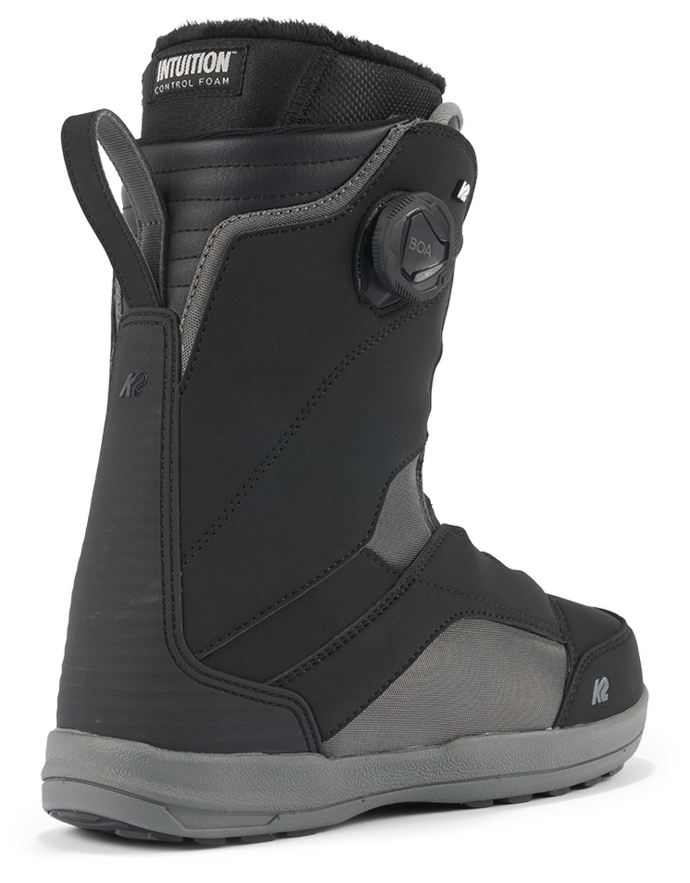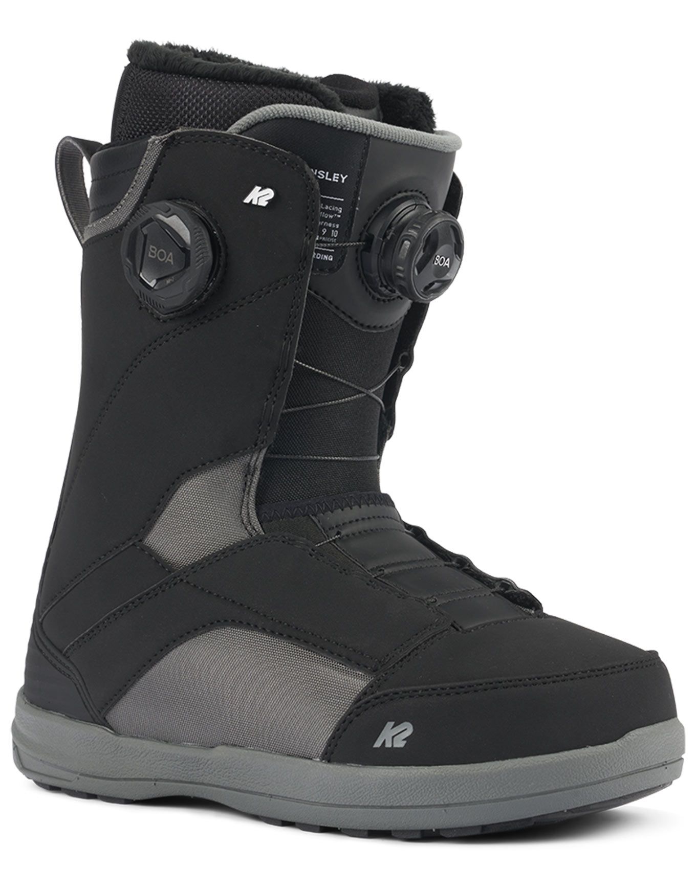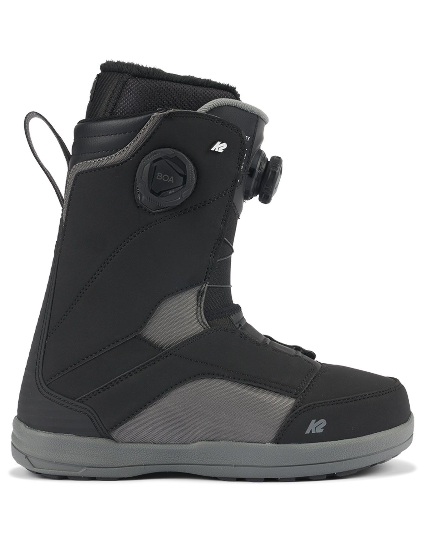 Boots de snowboard K2 Kinsley Black pour femme, all-mountain intermédiaire à confirmé. Chausson Intuition® Control Foam 3D, collar articulé, flex semi-rigide, semelle This Grips!™ Premium/Harshmellow™ et laçage Boa® H4/M3 Focus pour confort, maintien et liberté sur piste ou en park.